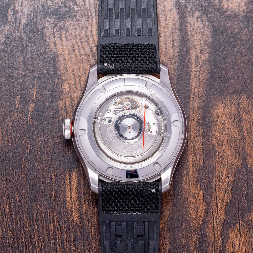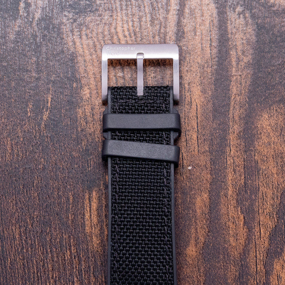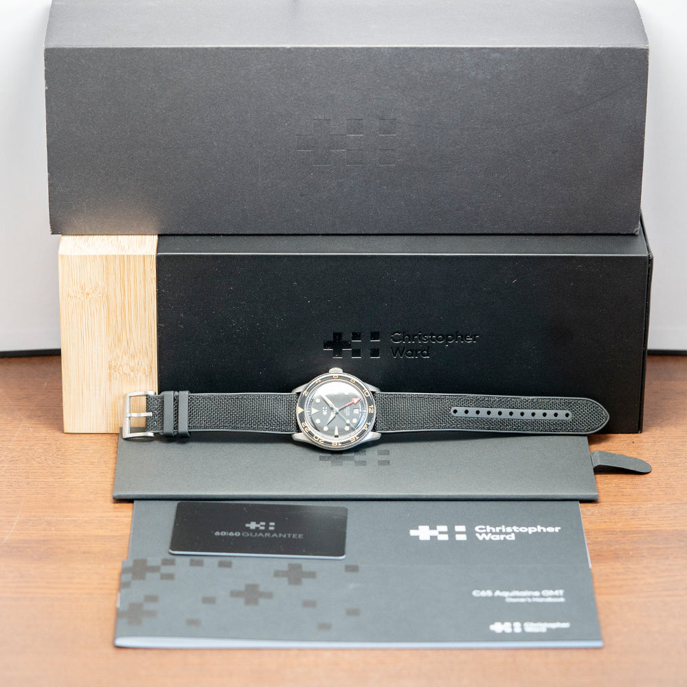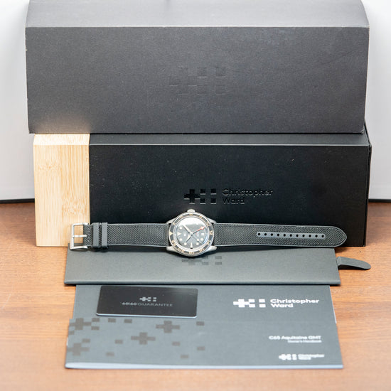 Here we have a 2022 Christopher Ward C65 Aquitaine GMT inspired by the early dive watches of the 1950s and the famous Blancpain 50 Fathoms; a 41mm stainless steel case curves over your wrist with tapered lugs, and a lug-to-lug length of 46.5mm and a case thickness of 12.5mm give the watch an impressive wrist presence. This striking Christopher Ward’s Light-catcher case has polished and brushed surfaces that transition with crisp edges. On the right side, a screw-down signed crown, the bi-directional bezel has deep knurling for extra grip and a sapphire insert with Super-LumiNova Grade X1 BL lumed 24-hour numerals holding a domed sapphire crystal AR coated above a matte Black dial. An outer minute track has applied disc and slender trapezoid indexes infilled with “Light Old Radium” Super-LumiNova Grade X1 BL lume for that vintage aesthetic; at 6 o’clock, a date window, diamond polished hands infilled with the same lume, with a red arrow GMT hand complemented by a lollipop trident counterweighted sweeping second hand. At 12 o’clock, we have the Christopher Ward motif; at 6 o’clock, a red GMT “Automatic 200m/660ft” printed in white underneath completes this dynamic travel companion. On the reverse a screw-down exhibition case back, inside an automatic Sellita SW330-2 Elaboré, 25 jewels, beating at 28,800 beats per hour. The watch comes fitted on its Christopher Ward 22mm rubber strap with a signed buckle, and it comes with a Christopher Ward presentation box and paperwork.