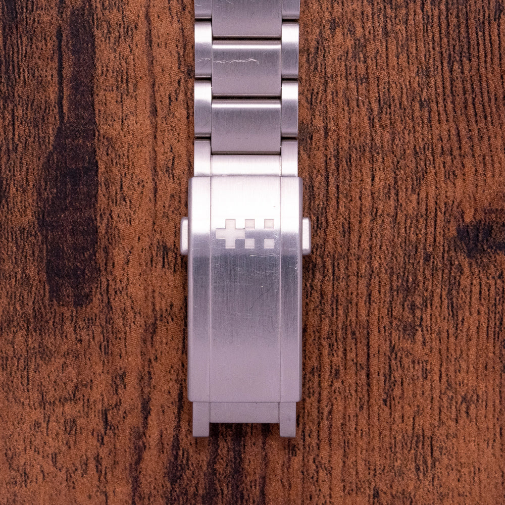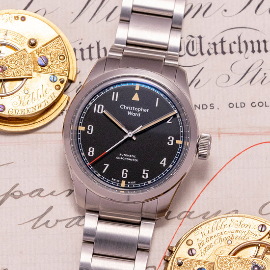 This watch is sold with its original Christopher Ward box and Paperwork. The watch comes paired with its original stainless steel Christopher Ward signed bracelet with its Christopher Ward signed clasp, all spare links are included. The watch is from January 2022 and is sold in worn condition. The watch comes with its original Manufacturer's Warranty.