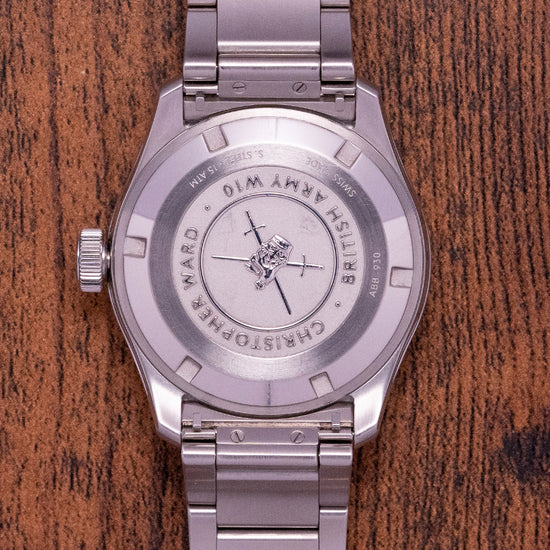 The C65 Sandhurst is inspired by the iconic Smiths W10, representing the British Army. Their business and reputation have grown exponentially over the past 10 years. Like the W10 this watch has been made in conjunction with the MOD Ministry of Defence, it is their first true field watch and meets all MOD specifications. The 38mm stainless steel round case gently curves over your wrist with tapered lugs, a lug-to-lug length of 43.5mm and a thickness of 11.5mm ensuring a comfortable fit. Brushed and polished bevelled edges transition with crisp lines, and on the right side a screw-down crown with the flag logo and red accent matching the red-tipped second’s hand. A stepped brushed bezel has bevelled polished edges, the box-glass Sapphire crystal is a modern twist and harkens back to the original W10 of the 1960s which used a glass-box crystal. A textured matte black dial has a precisely printed minute track with batons at every quarter and lume pips coated in Old Radium Super-LumiNova in between, a triangle at 12, Arabic numerals printed with white TC-1 Super-LumiNova mark the hours. Long baton hands with a chamfered edge are coated in the same Old Radium Super-LumiNova. On the reverse, a high-relief British Army heraldic badge is in the centre, inside an automatic Sellita SW200 COSC, 26 jewels, 28,800 beats per hour, this is a high-accuracy Sellita meeting the COSC certification. The watch comes fitted on a Christopher Ward 20mm Marine-grade stainless steel bracelet with a ratchet clasp for micro-adjustments and quick-release for easy changing, all links are included and come with its original Christopher Ward presentation box and papers including the COSC certificate.