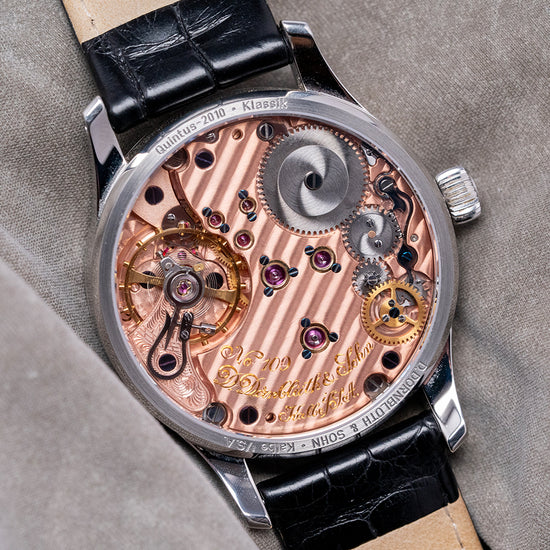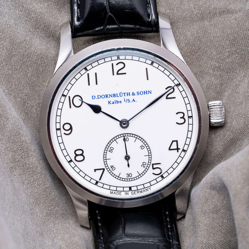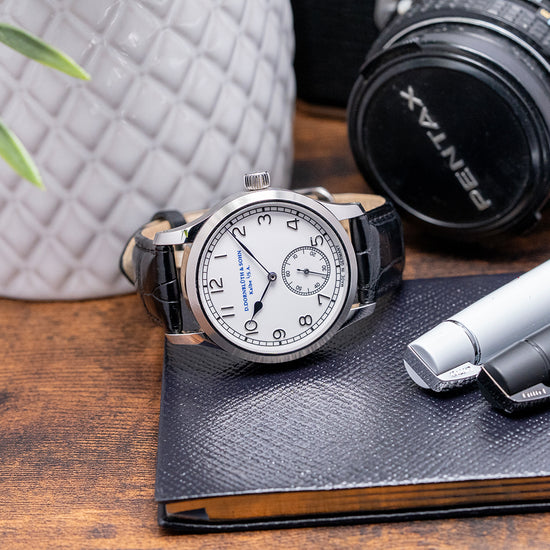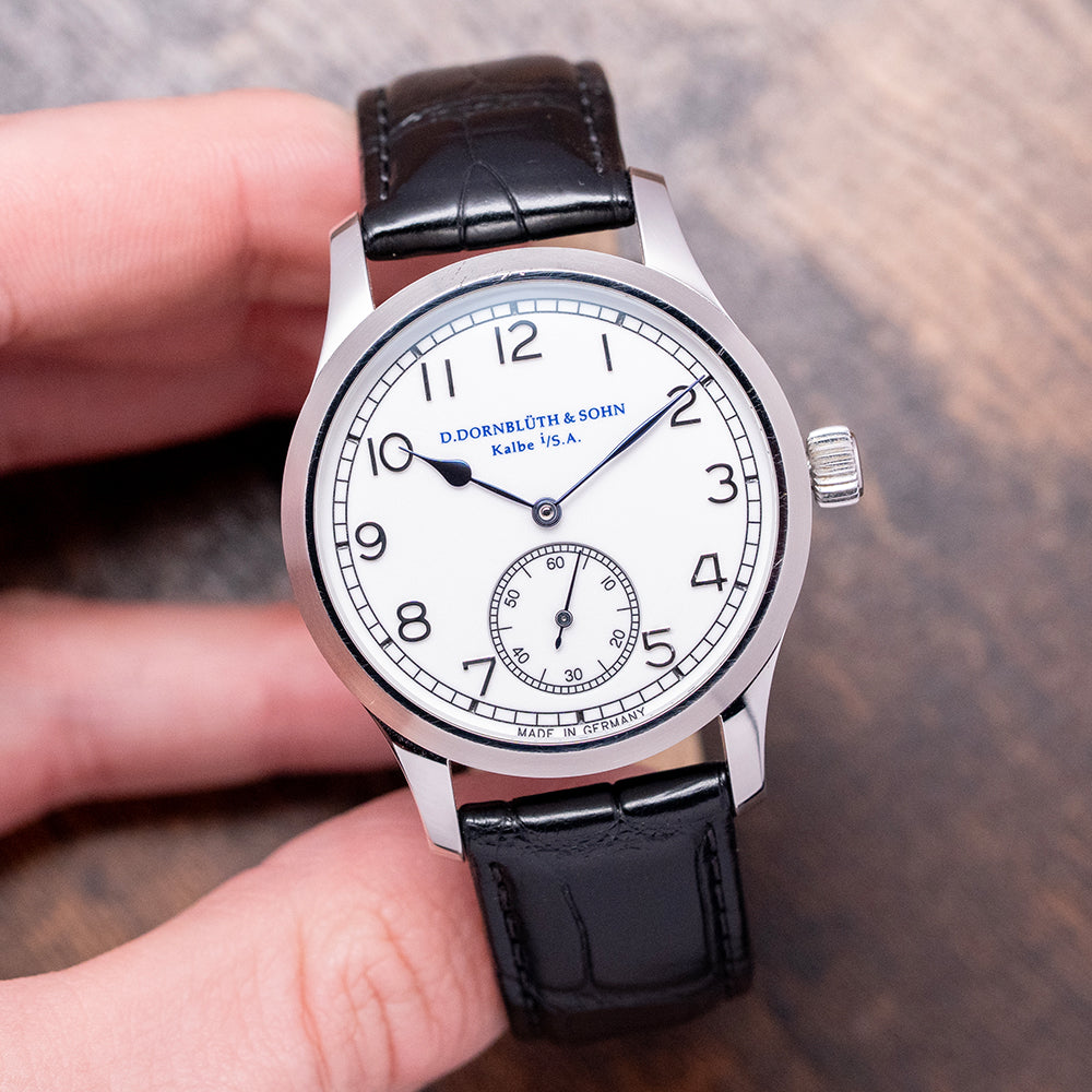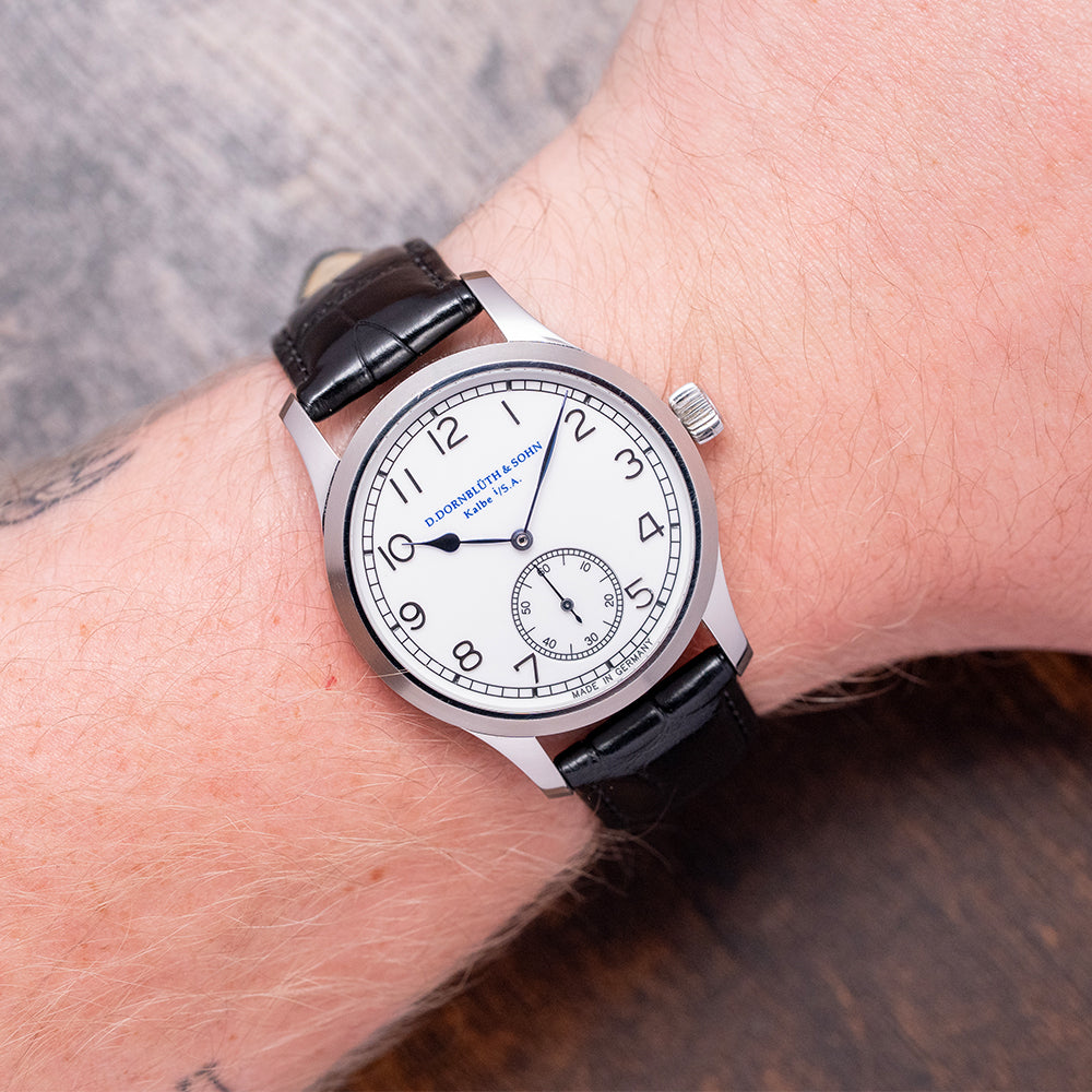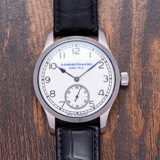 Here we have a distinguished 2022 D.Dornblüth & Sohn Quinus-2010.1 Klassik featuring a satin brushed and polished 38.5mm stainless steel case that gently curves over your wrist, thanks to the tapered drilled screwed lugs. Its curved, polished chamfer edge flanks lead to a lug-to-lug length of 48.5mm and a case thickness of 11.5mm, ensuring a comfortable fit. On the right side, there is a signed coin-edged crown. The smooth satin-brushed bezel holds a slightly domed sapphire crystal, AR-coated on the inside, above a spectacular matte white, grain-textured dial. An outer minute railroad surrounds applied Arabic indices marking the hours, delicate thermally blued hands sit majestically above a recessed running seconds at 6 o’clock, across the dial, we have D.Dornblüth & Sohn Kalibe i/S.A motif completes this sophisticated dress watch. On the reverse, a screw-down exhibition case back is engraved with the watch's details around its edge, housed within an upgraded manually wound Q-2010.1 Klassik. This watch is beautifully engraved and decorated in Côtes de Genève, making it mesmerising from both the front and the back. It comes paired with its 20mm leather strap and signed pin buckle. The watch includes its D.Dornblüth & Sohn presentation box and paperwork.