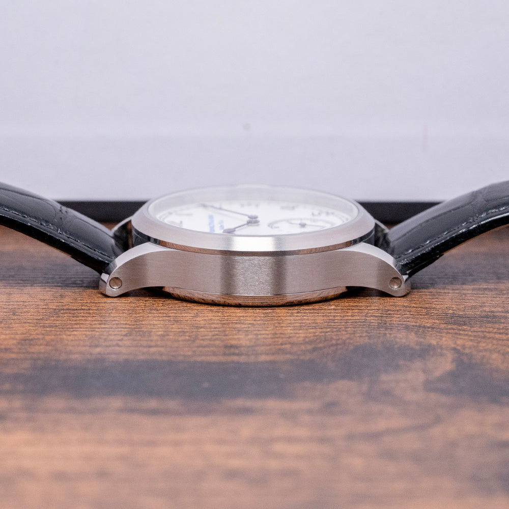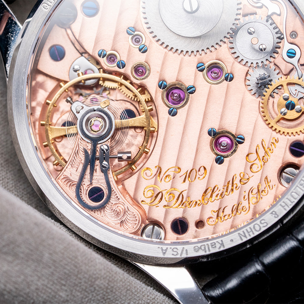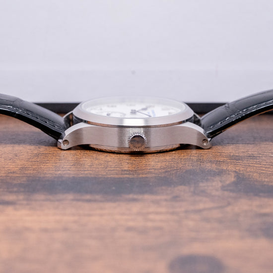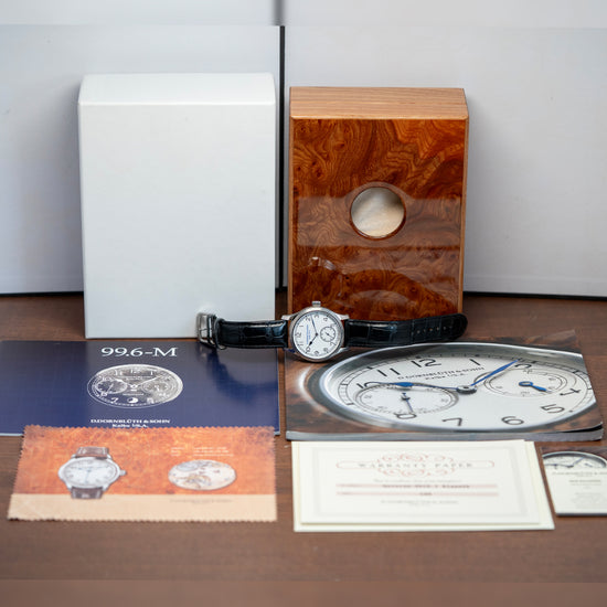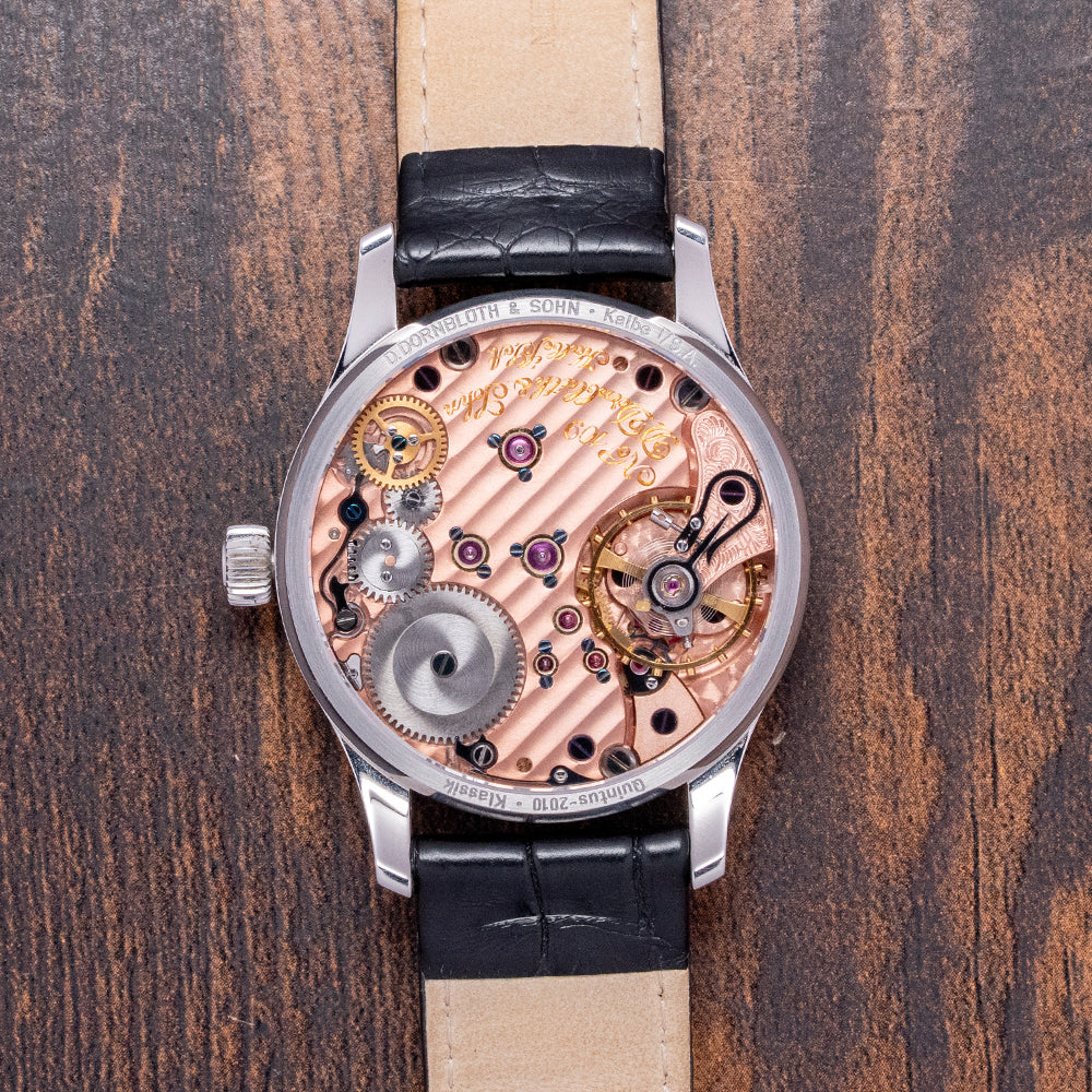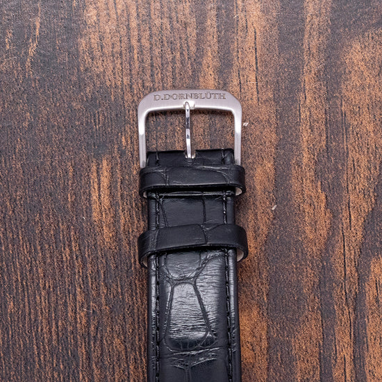 Here we have a distinguished 2022 D.Dornblüth & Sohn Quinus-2010.1 Klassik featuring a satin brushed and polished 38.5mm stainless steel case that gently curves over your wrist, thanks to the tapered drilled screwed lugs. Its curved, polished chamfer edge flanks lead to a lug-to-lug length of 48.5mm and a case thickness of 11.5mm, ensuring a comfortable fit. On the right side, there is a signed coin-edged crown. The smooth satin-brushed bezel holds a slightly domed sapphire crystal, AR-coated on the inside, above a spectacular matte white, grain-textured dial. An outer minute railroad surrounds applied Arabic indices marking the hours, delicate thermally blued hands sit majestically above a recessed running seconds at 6 o’clock, across the dial, we have D.Dornblüth & Sohn Kalibe i/S.A motif completes this sophisticated dress watch. On the reverse, a screw-down exhibition case back is engraved with the watch's details around its edge, housed within an upgraded manually wound Q-2010.1 Klassik. This watch is beautifully engraved and decorated in Côtes de Genève, making it mesmerising from both the front and the back. It comes paired with its 20mm leather strap and signed pin buckle. The watch includes its D.Dornblüth & Sohn presentation box and paperwork.