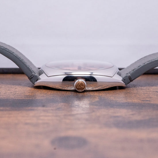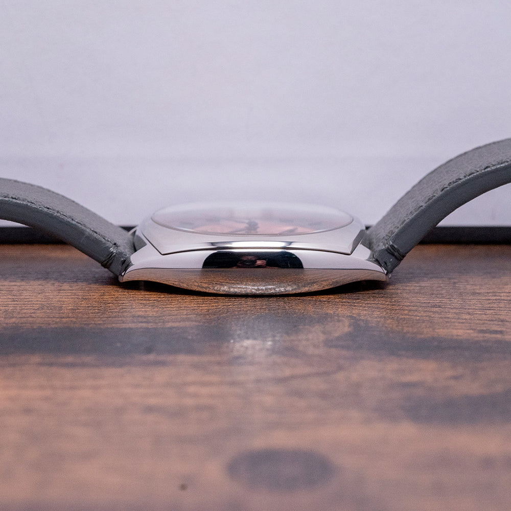 Here, we have a curvaceous 2022 Farer Durham Salmon Dial with a 38.5mm polished 316L stainless steel three-part Cushion Case that gently curves over your wrist, thanks to the thick tapered lugs, and a lug-to-lug length of 44mm and a case thickness of 10.5mm ensure a comfortable fit. On the right side, a coin-edged bronze capped signed crown. The bevel-edged bezel holds a sapphire crystal above a stunning Salmon and slate grey sector dial. An outer minute track surrounds a floating slate grey ring with applied Roman numeral and baton indexes marking the hours, elegant black sword hands sit above a recessed concentric circular sub-second dial, and at noon, we have the Farer motif completing this sophisticated dress watch. On the reverse, a screwed-down exhibition case back with the details of the watch engraved around its edge, inside a manually wound Sellita Cal. SW216-1 Elaboré, 24 jewels, beating at 28,800 beats per hour, decorated with blued screws and elaborate engraving. The watch comes with its quick-release 20mm Farer leather strap with a signed pin buckle and its Farer presentation box, swing tag and paperwork.