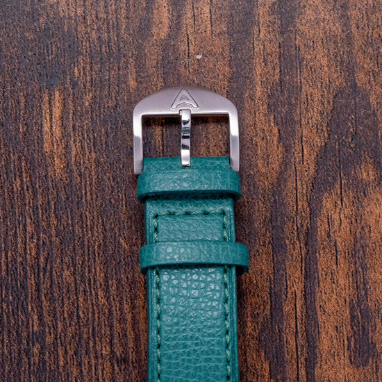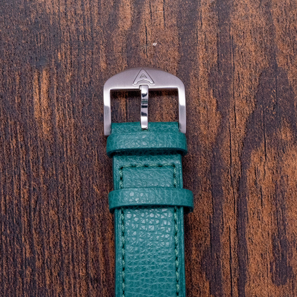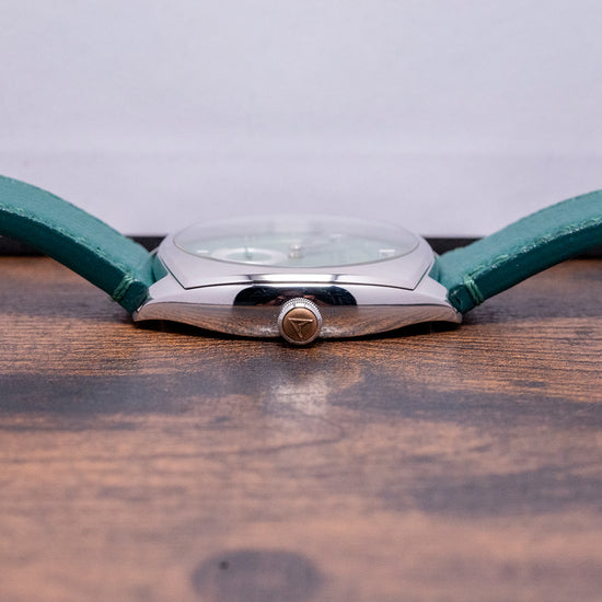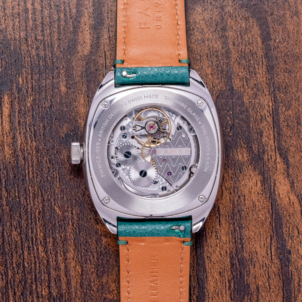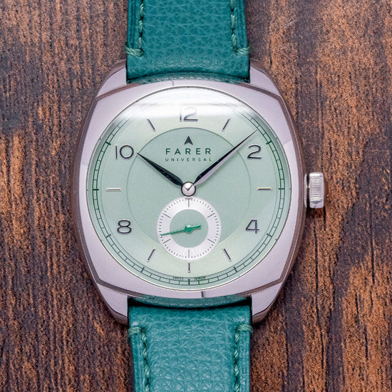 Here, we have a curvaceous 2022 Farer Mansfield Green with a 38.5mm polished 316L stainless steel three-part Cushion Case that gently curves over your wrist, thanks to the thick tapered lugs, and a lug-to-lug length of 44mm and a case thickness of 10.5mm ensure a comfortable fit. On the right side, a coin-edged, bronze-capped, signed crown. The bevel-edged polished bezel holds a sapphire crystal above a stunning, pale, matcha tea-green sector dial. An outer minute track surrounds a floating pale, matcha tea-green ring with applied Arabic numerals and baton indexes marking the hours. Elegant, polished sword hands sit above a recessed, concentric circular sub-second dial. At noon, the Farer motif completes this sophisticated dress watch. On the reverse, a screwed-down exhibition case back with the details of the watch engraved around its edge, inside a manually wound Sellita Cal. SW216-1 Elaboré, 24 jewels, beating at 28,800 beats per hour, decorated with elaborate engraving. It comes paired with its quick-release 20mm Farer St. Venere leather strap, featuring a signed pin buckle, as well as its Farer presentation box, swing tag, and paperwork.