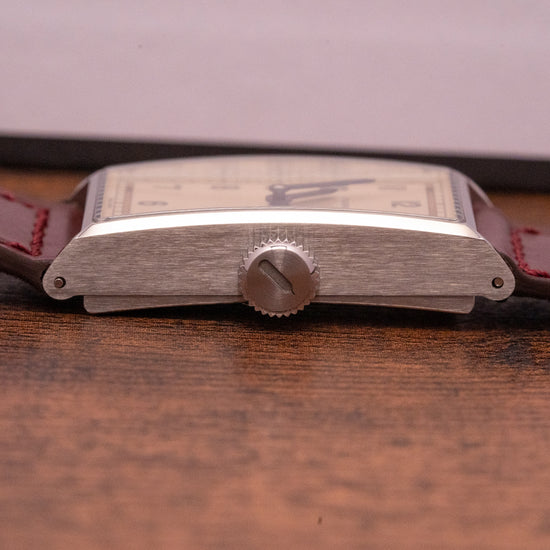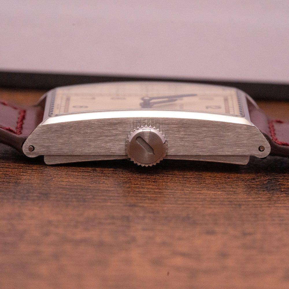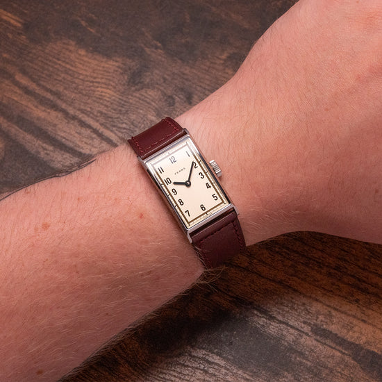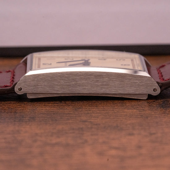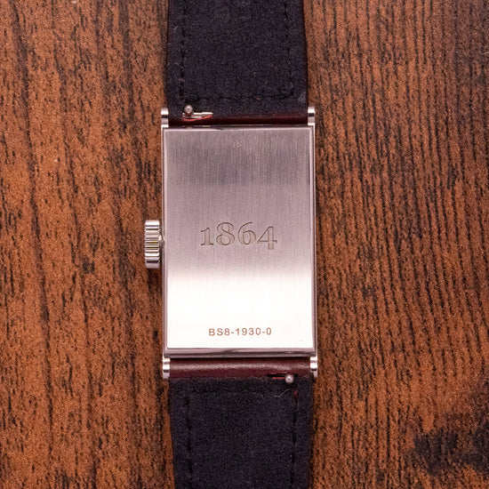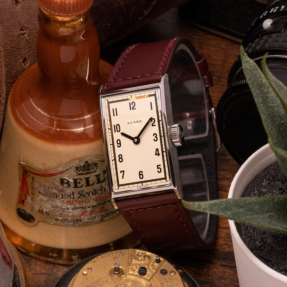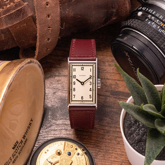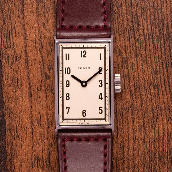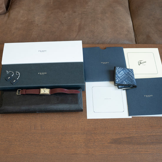 Created to coincide with the 175th Anniversary of the founding of Fears, the Archival 1930 is a proportional recreation of an art deco watch Fears made in 1930, true to the original, each watch features an original vintage movement. Its elegant form makes it a perfect luxury rectangular watch for men or women, made in a strictly limited run of 175, each piece has a unique serial number engraved between the lugs at 12 o’clock, this number can identify the watch's history from its master database. The Archival 1930 features the years the company was operational; 1846-1976 and 2016-2021, proudly engraved on the case back. The case is expertly machined from 316L Stainless Steel, in Germany, to a level usually reserved for precious metals, proportionally the same as the original but slightly larger to make it more contemporary. The long slim case and crystal have a subtle curvature that beautifully follows the curve of your wrist, and a large crown has a deeply engraved tip with the Fears Pipette logo. The dial’s base is polished and plated in 18ct Yellow Gold, with the rest of the dial layered over the top. An outer minute track is precisely printed, and a real gold border shines through the matte Champagne finish that is subjected to a light 18t yellow gold plating. In contrast, the crisp glossy black Art Deco numerals mark the hours for that vintage aesthetic, the solid Fears-shaped hands are hand polished and shaped, and their rich blue colour makes for a highly legible dial. On the reverse, we have a snap-off stainless steel case back with attractive vertical brushing and deep engraving of “1864”. Inside The Archival 1930, is an original ‘new old stock’ movement that Fears used in the past, the manually wound ETA 2360 movements date back to the 1960s and having never been used previously have undergone full reconditioning in the workshop while receiving an upgraded mainspring to improve reliability, each of these original rectangular movements is thus effectively hand-built in the traditional way with each movement taking days to assemble and regulate. Fitted on a handmade Bristol Leather strap in a traditional Oxblood Red and lined in soft Fears, Blue Alcantara, its calf leather is vegetable tanned in one of Britain's oldest tanneries in Bristol- Thomas Ware & Sons. The stainless steel pin buckle has its 1930s Fears logo deeply engraved on the polished top of the buckle. The Fears Archival 1930 is presented in a rectangular, wooden box made of solid English ash and stained in our bespoke Fears Blue colour and on the top of the box, the Fears logo is subtly engraved.