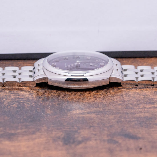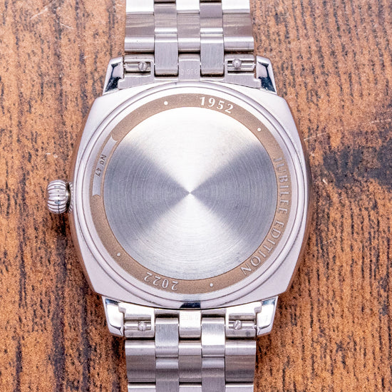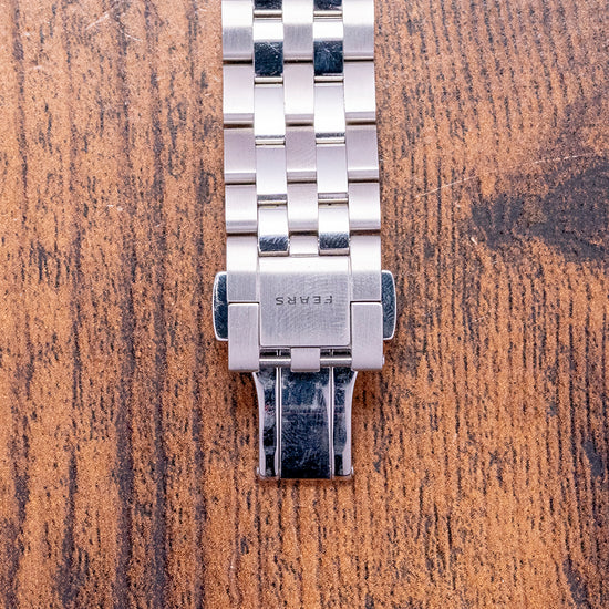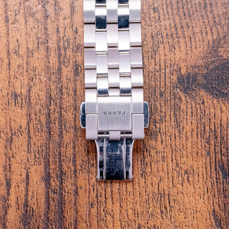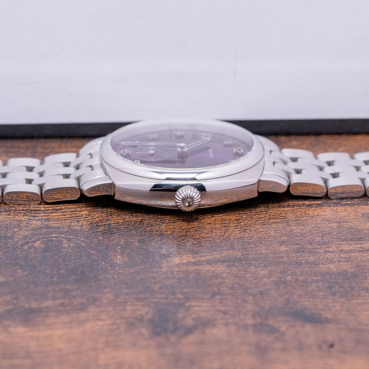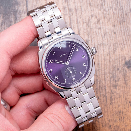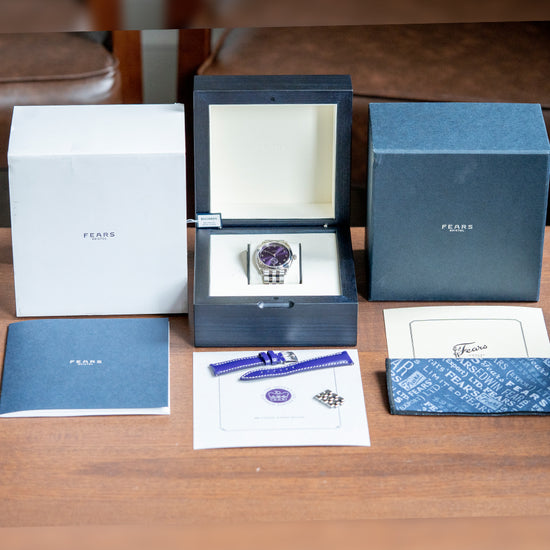 Here we have a 2022 Fears Brunswick "Jubilee Edition" Royal Purple made in small batches. This special piece was only made and sold during the Jubilee year of 2022. The inspiration for the case for this watch comes from a Fears watch originally made in 1924 and manufactured in Germany; its wonderfully curvaceous 38mm case is made from 316L stainless steel, and the finish and depth of polishing are quite exquisite and showcase the skill and attention to detail of the German manufacturers. To facilitate daily winding, the watch features a traditional “onion” shaped crown made in Switzerland. On the dial, numerals expertly applied by hand, capture and play with the light as you gently wind the crown to begin your day. A domed sapphire crystal sits above an incredible Royal Purple dial that perfectly replicates the historic colour of royalty. It was expertly made in Germany by one of the world’s best dial makers. As you rotate your wrist, the rich tones of the Royal Purple lacquer magically change from light to dark, something you must experience in person to appreciate. This striking dial is complemented by the concentric circle finishing on the sunken sub-seconds at 6 o’clock. The numerals are applied to the dial by hand, machined from brass and mirror polished before being coated in Rhodium to give them a brilliant shine. Inspired by the many different typefaces Fears has used throughout its history, they were designed especially for Fears by a horological typographer. It is truly a masterclass in dial manufacturing. Each set of hands is subtly skeletonised and mirror-polished before being coated in Rhodium to give them a brilliant shine. On the reverse, we have a special engraving celebrating The Queen’s Platinum Jubilee, each piece with a unique serial number engraved; this number can identify the watch's history from its master database. Inside, we have a hand-wound ETA 7001, 17 jewels, and 18,000 beats per hour; first introduced in the 1970s, it quickly gained a reputation for being reliable; its slim design incorporates an Incabloc shock system, and each movement is serviced and hand-finished here in Britain, applying Côtes de Genève striping and Rhodium plating. Once reassembled and thoroughly tested, it receives its “Golden Pipette”, which is handmade and applied to the bridge; the watch comes paired with a 20mm handmade Royal Purple with platinum-coloured stitching lined with Alcantara dyed a deep shade of blue with a stainless steel pin buckle carries the final flourish of an engraving of the Fears pipette logo. Plus, a Fears quick-release five-link bracelet in milled 316L stainless steel, its flush-fitting gives it an integrated aesthetic; the alternating polished and brushed finishing complements the case finishing, secured to the wrist with a push-button release butterfly clasp which, when opened, shows a decorative “Bristol Flower” motif. The Brunswick ’Jubilee Edition is presented in a bespoke wooden box crafted in Britain from English Ash, which is stained Fears Blue, lined in genuine cream suede; the watch sits proudly on a special cushion.