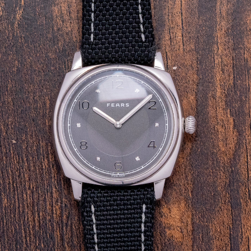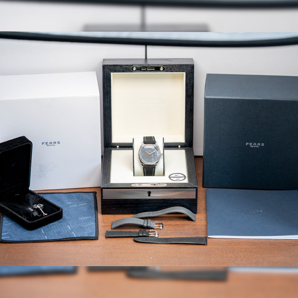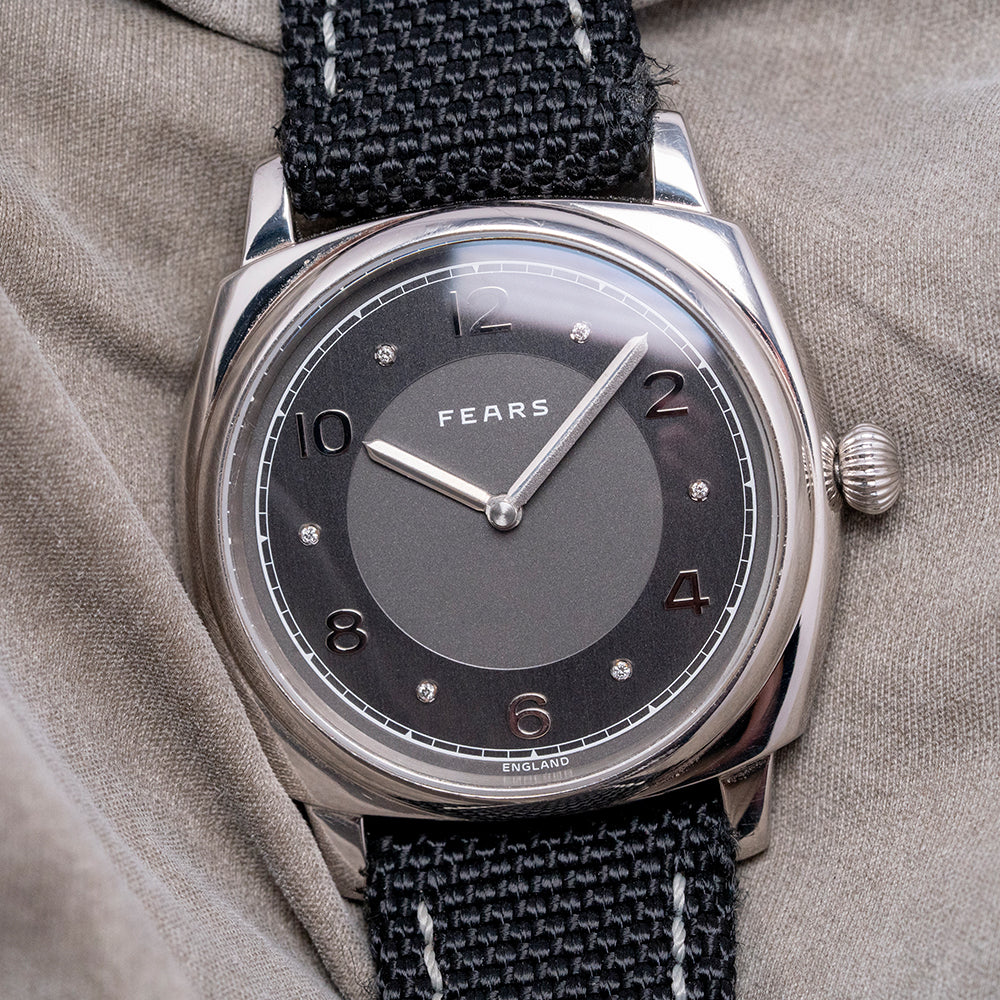 Here we have the beautiful 2022 Fears Brunswick Platinum Anthracite Grey Diamond dial. Taking up to 4 months to complete, the case and the solid case back each bear hallmarks from the London Assay Office. Each piece has a unique serial number engraved between the lugs at 12 o’clock. This number can identify the watch's history from its master database. The inspiration for this watch comes from a Fears watch originally made in 1924. Its wonderfully curvaceous 38mm cushion case is made from almost 100g of solid Platinum (950/1000 purity). Sitting comfortably on your wrist, thanks to its short, straight lugs, its curved flanks lead to a lug-to-lug length of 43mm and a case thickness of 12.5mm, ensuring a comfortable fit on your wrist. On the right side, there is a traditional “onion” crown made of solid platinum, into which a D-colour, flawless diamond is set. A domed sapphire crystal sits above an incredible Anthracite Grey. The natural colour of a coating of real Anthracite combines with three surface finishes to result in a dial that changes in the light, giving a two-tone effect. This striking dial is complemented by the concentric circle finishing on the sunken sub-seconds, at 6 o’clock. The numerals are applied to the dial by hand, platinum-plated with alternating D-colour flawless diamonds. Inspired by the many different typefaces Fears has used throughout its history. Each set of hands has Platinum plating and bevelled edges. At noon, we have the Fears motif completing this very distinctive dress watch. On the reverse, a screwed-down case back with vertical brushing. Inside, we have a manually wound LJP Cal. D100, 18 jewels, 21,600 beats per hour. This movement is based on the Peseux 7001. La Joux-Perret is part of the Citizen Group. It comes paired with three 20mm Fears straps and signed pin buckles, including a Platinum pin buckle. The Brunswick Pt is presented in an impressive wooden box with a locking key and includes Fear's paperwork.