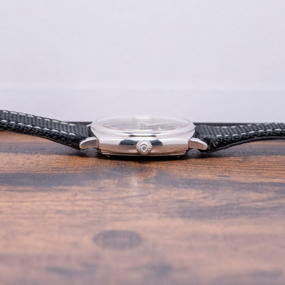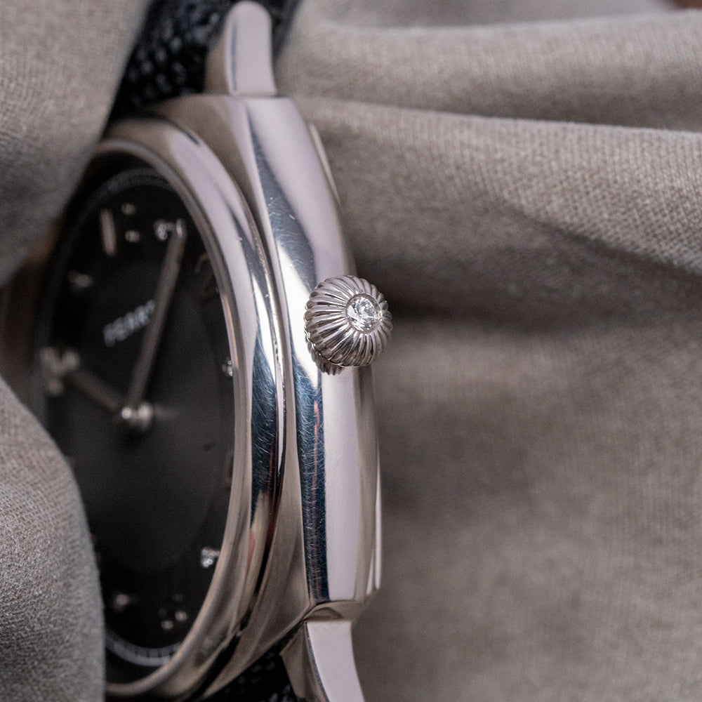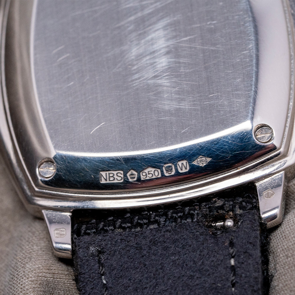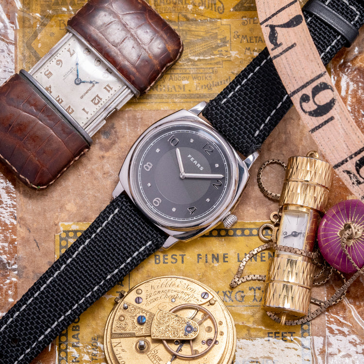 Here we have the beautiful 2022 Fears Brunswick Platinum Anthracite Grey Diamond dial. Taking up to 4 months to complete, the case and the solid case back each bear hallmarks from the London Assay Office. Each piece has a unique serial number engraved between the lugs at 12 o’clock. This number can identify the watch's history from its master database. The inspiration for this watch comes from a Fears watch originally made in 1924. Its wonderfully curvaceous 38mm cushion case is made from almost 100g of solid Platinum (950/1000 purity). Sitting comfortably on your wrist, thanks to its short, straight lugs, its curved flanks lead to a lug-to-lug length of 43mm and a case thickness of 12.5mm, ensuring a comfortable fit on your wrist. On the right side, there is a traditional “onion” crown made of solid platinum, into which a D-colour, flawless diamond is set. A domed sapphire crystal sits above an incredible Anthracite Grey. The natural colour of a coating of real Anthracite combines with three surface finishes to result in a dial that changes in the light, giving a two-tone effect. This striking dial is complemented by the concentric circle finishing on the sunken sub-seconds, at 6 o’clock. The numerals are applied to the dial by hand, platinum-plated with alternating D-colour flawless diamonds. Inspired by the many different typefaces Fears has used throughout its history. Each set of hands has Platinum plating and bevelled edges. At noon, we have the Fears motif completing this very distinctive dress watch. On the reverse, a screwed-down case back with vertical brushing. Inside, we have a manually wound LJP Cal. D100, 18 jewels, 21,600 beats per hour. This movement is based on the Peseux 7001. La Joux-Perret is part of the Citizen Group. It comes paired with three 20mm Fears straps and signed pin buckles, including a Platinum pin buckle. The Brunswick Pt is presented in an impressive wooden box with a locking key and includes Fear's paperwork.