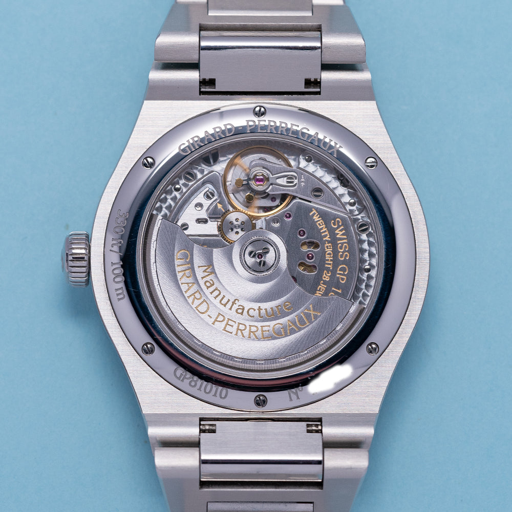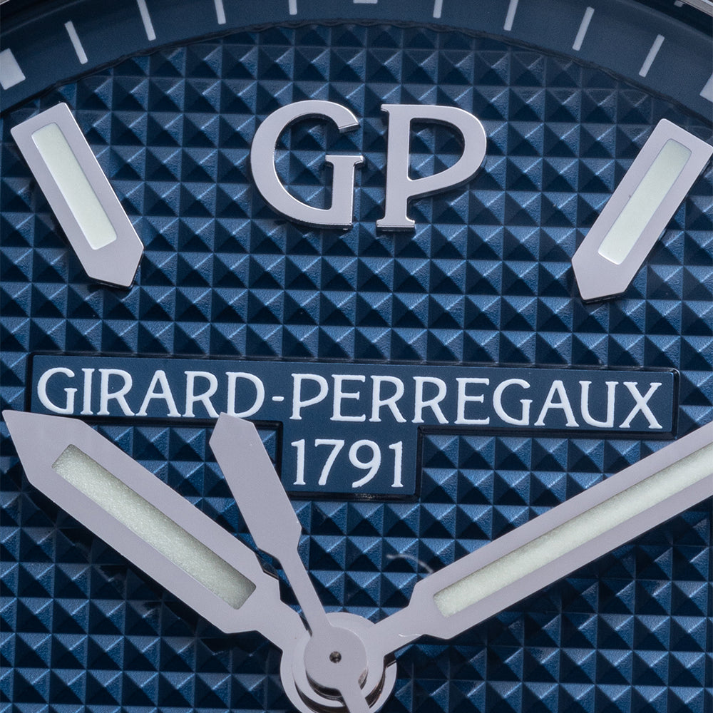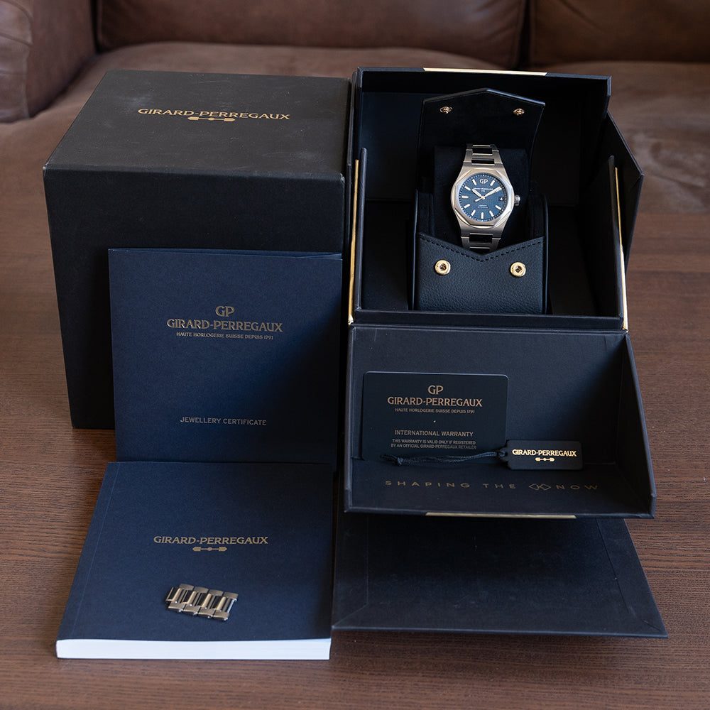This watch is sold with its original Girard Perregaux Box & Paperwork. The watch comes paired with its original Girard Perregaux polished and brushed integrated bracelet with a push-button release deployment clasp, all links included. The watch is from September 2022 and is sold in worn but overall very fair condition as you can see from the photographs. The watch comes with its Manufacturer's Warranty.