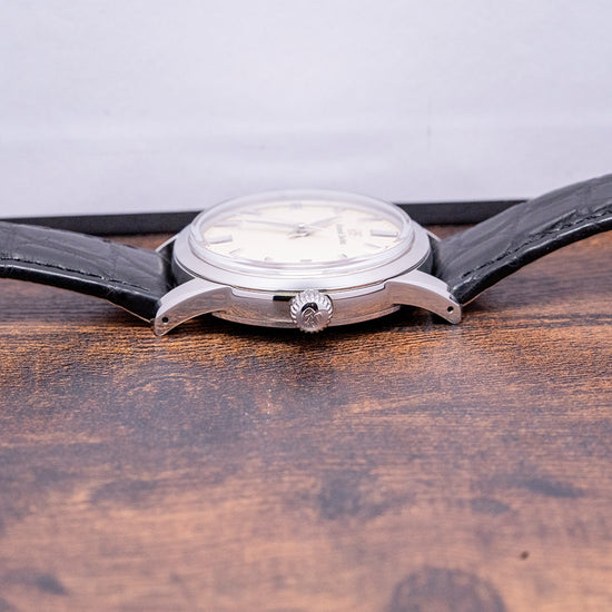 Here we have a 2022 Grand Seiko Elegance Manually Wound SBGW231G, bringing together the sophistication of a dress watch with the craftsmanship of true experts at Grand Seiko. The 37mm stainless steel case has perfect polishing, something we sometimes take for granted on a Grand Seiko; it’s not until we have one on the wrist that we can truly appreciate the sheer brilliance of the Zaratsu polishers. A lug-to-lug length of 44mm and a thickness of 11.5mm give the watch excellent wrist presence; the drilled lugs gently curve over your wrist for a comfortable fit, and on the right side, a signed crown. A stepped polished bezel holds a slightly domed box-shaped sapphire crystal with an AR coating on the inside; the cream dial has an outer minute track with applied steel batons precisely chamfered edges Zaratsu polished. As you rotate your wrist, the dial magically plays with the light, steel dauphine hands that have been Zaratsu polished, complemented by a tapered, sweeping seconds hand, an applied GS, and precisely printed Grand Seiko at 12. On the reverse, a screw-down exhibition case with sapphire crystal showcases the movement, inside a manually wound Grand Seiko Cal. 9S64, 24 jewels, 28,800 beats per hour, and an impressive 72-hour power reserve, the movement has been adjusted to six positions and temperatures at the factory, finished with attractive Cotes de Geneve decoration, the movement has been developed with Micro Electro Mechanical Systems (MEMS) Technology where precise components are produced using advanced semiconductor manufacturing. The watch comes fitted on a 19mm Grand Seiko strap with a signed buckle, and it comes with its Grand Seiko presentation box, swing tags and paperwork.