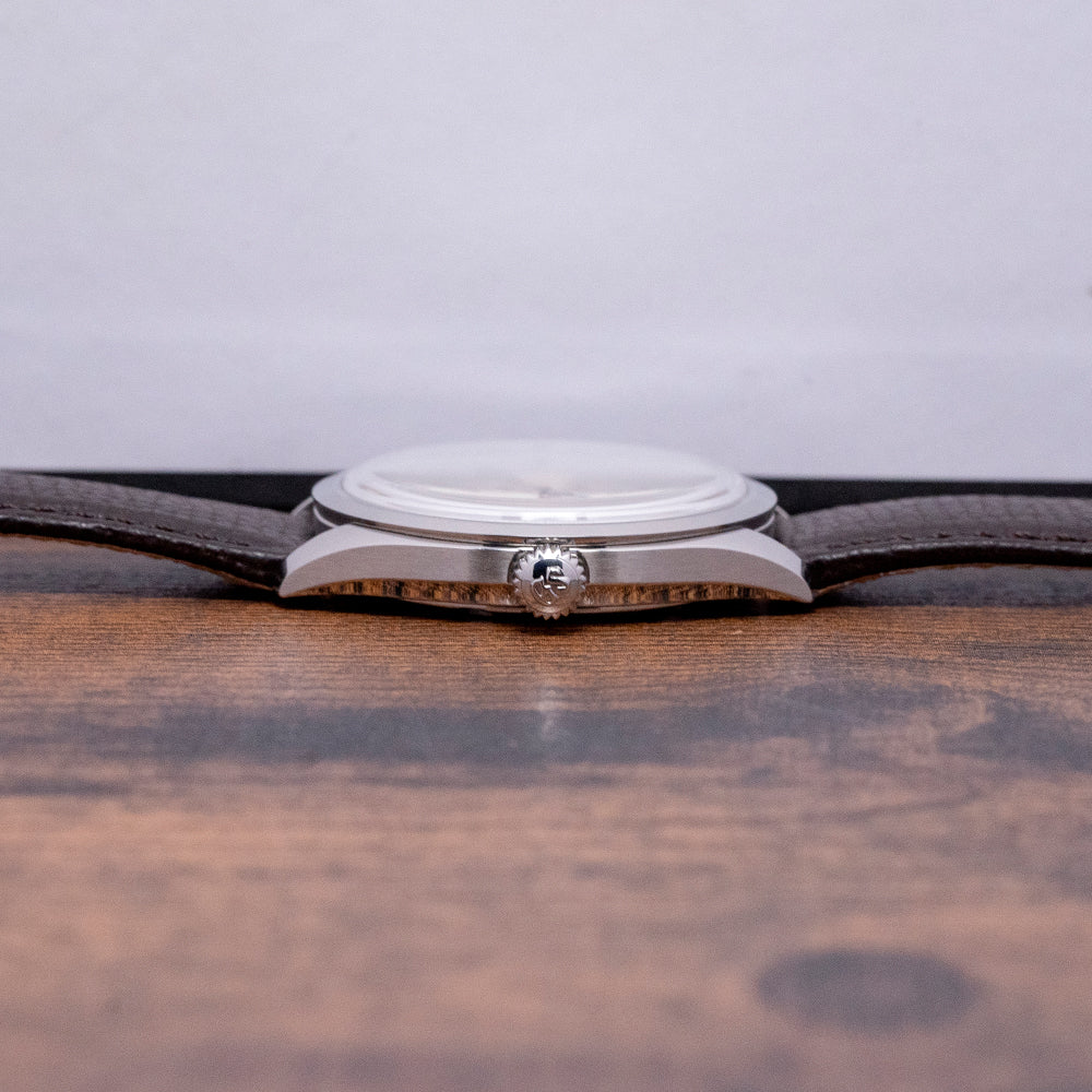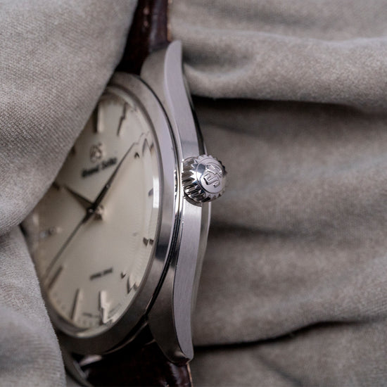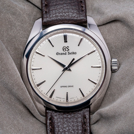 Here we have the incredible 2022 Grand Seiko Spring Drive Karesansui SBGY029G Limited Edition of 36/50 pieces, launched to celebrate the grand opening of their flagship London, Bond Street Boutique in 2022. The impressively sculptured 38.5mm stainless steel case has perfect polishing, something we sometimes take for granted on a Grand Seiko; it’s not until we have one on the wrist that we can truly appreciate the sheer brilliance of the Zaratsu polishers; the curvaceous brushed flanks lead to a lug-to-lug of 43mm and a case thickness of 10mm, giving the watch an impressive wrist presence. A signed crown sits slightly recessed on the right side, and a smooth, chamfered bezel holds a box-shaped sapphire crystal. The cream dial has a mesmerising spiral effect inspired by Karesansui, the distinctive arrangement of a Japanese Zen garden with its curving lines of sand, positioning of its moss and rocks to provide the perfect place to relax and meditate, an outer minute track surrounds applied Zaratsu polished facet-edged indexes marking the hours, elegant Dauphine hands are Zaratsu polished with razor edges complemented by a black tapered sweeping second hand. At noon, an applied “GS” and “Grand Seiko” underneath, and at 6 o'clock, " Spring Drive” completes this beautifully executed, versatile timepiece. On the reverse, we have a screw-down exhibition case back, the details of the watch engraved around the edge and the limited number, inside a manual-winding Spring Drive Grand Seiko Cal. 9R31, this innovative Spring Drive movement released in 2019 to celebrate the 20th Anniversary of the first Spring Drive; this 30-jewel manual wind spring drive movement has been designed and developed at the Shinshu Watch Studio in Japan; it has a Dual-Spring Barrel with two mainsprings set in parallel within a single barrel to achieve its long power reserve, which has a scale on the movement, keeping the incredible dial uncluttered. The movement has hacking for your convenience. The high torque movement has 200 components and is Grand Seiko's second thinnest movement, expertly decorated with blued screws. It comes paired with its original Grand Seiko 19mm leather strap secured by a signed push button buckle and comes with its Seiko presentation box, swing tag and papers.