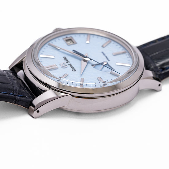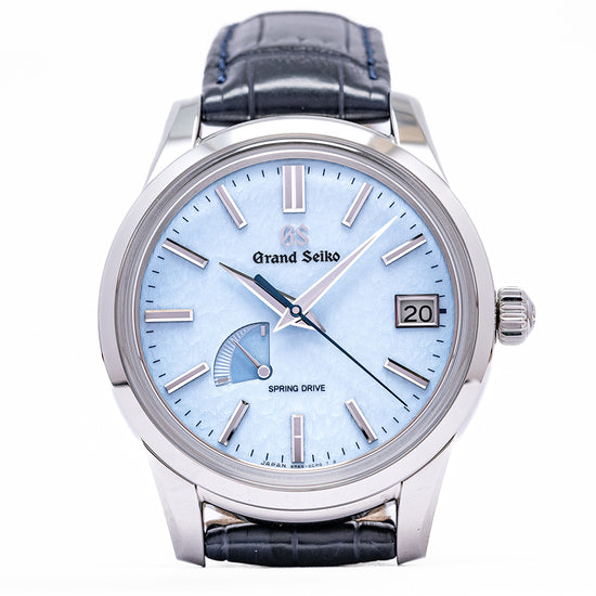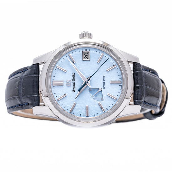 Here we have a 2022 Grand Seiko Spring Drive "Skyflake" SBGA407G that has a 40mm stainless steel case, its angles and edges are exquisitely Zaratsu polished by masters of the art, the curved faceted lugs gently taper, a lug-to-lug length of 48mm and a case thickness of 13mm ensures a comfortable fit on the wrist. On the right side a large signed screw-down crown. A flat bevel-edged Sapphire crystal protects the sky-blue Japanese paper textured dial, it's inspired by the windswept snow-capped mountains of Shinshu, hence the name “Skyflake”. The baton indexes have razor-sharp edges that are expertly polished to an incredible standard, at 3 o’clock a framed date window and between the 7 and 8 positions sits an elegant power reserve. The dauphine hands are again highly polished with razor-sharp edges that catch the light perfectly, and a blued sweeping seconds hand tapers to a point. On the reverse, a screwed-down exhibition case, showcasing the Côtes de Genève finished Spring Drive, Grand Seiko Cal. 9R65, the innovative Spring Drive movement which is mechanical, but with an electromagnetic escapement regulated by a quartz oscillator, it has 30 jewels and a power reserve of an impressive 72 hours, its sole power source is a mainspring that drives a series of gears, a rotor connected to the end of these gears generates a small electrical charge that activates an electronic circuit and quartz oscillator, therefore there is no need for a battery. Fitted on a dark blue crocodile leather strap with a signed double folding buckle and the watch comes with its box and paperwork.