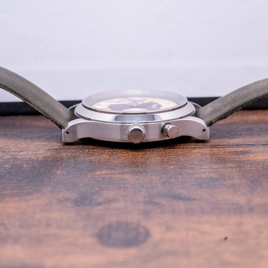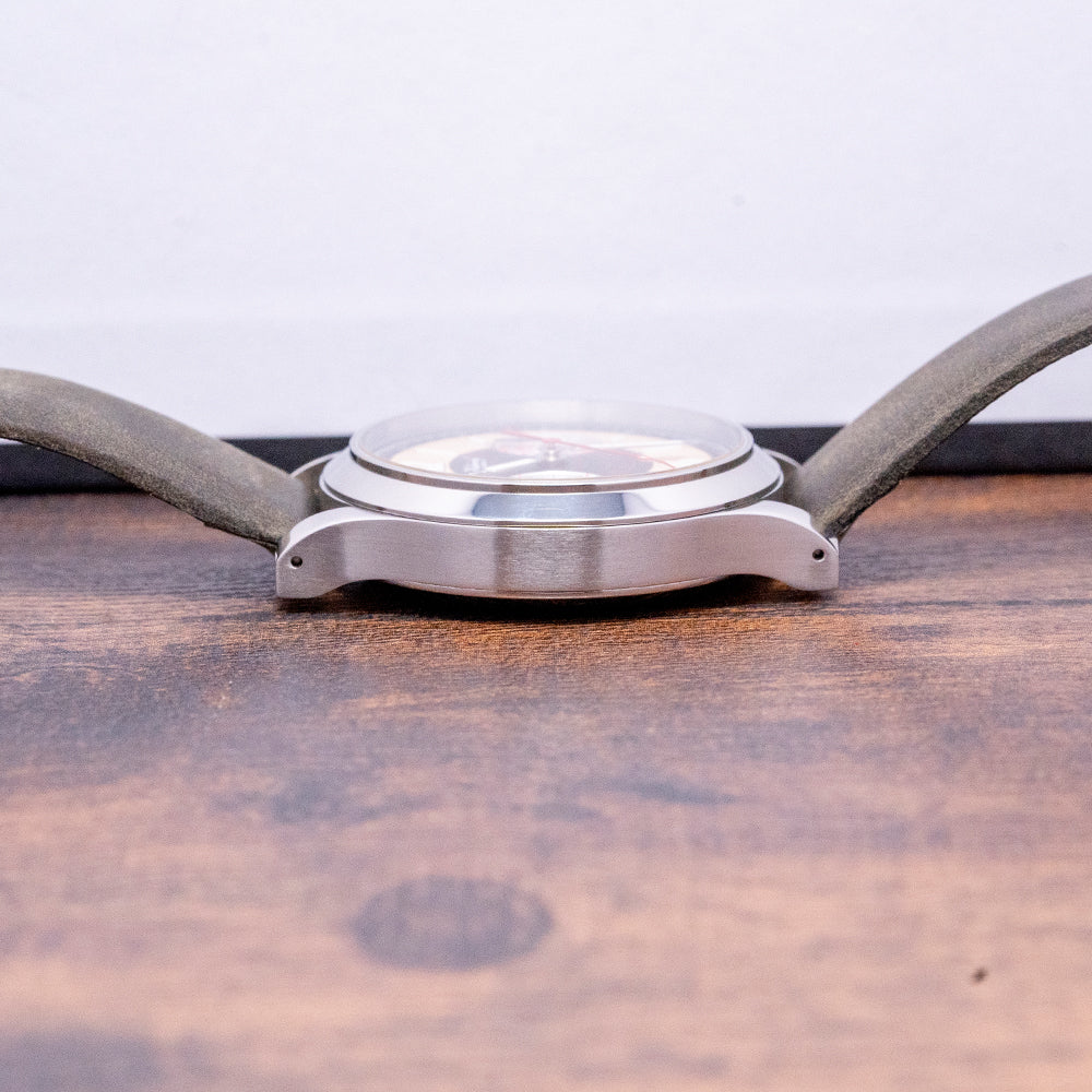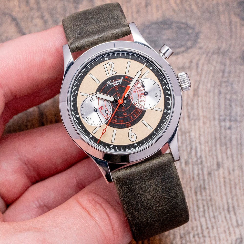 Here we have a 2022 Habring2 Chrono-Felix Sport Manually Wound; its 38.5mm round stainless steel case has tapering curved drilled lugs, the polished and brushed surfaces capture the light perfectly as you rotate your wrist, and a lug-to-lug length of 46mm and a case thickness of 11.5mm ensures a comfortable fit. Between the bottom lugs, you find the engraved consecutive serial number this one is No.#82. On the right side, we have a single pusher at 2 o’clock with a crown double-sealed just below at 3 o’clock. A slim polished bezel holds the domed sapphire crystal with AR coating on both sides to help with reflections. The stunning “Sport” dial has an outer minute track surrounding a beige ring with Arabic”12” and “6” alongside baton indexes coated in thick Super-LumiNova marking the hours. In the centre, a black disc with a spiral Tachymetre KM/H in red intersected by silver registers at 3 o’clock, 30 minutes and at 9 o’clock, small seconds, each with blued hands. Elegant syringe hands filled with Super-LumiNova are complemented by a fine red tapered chronograph hand, completing this dynamic Bicompax. On the reverse is an exhibition case with a sapphire crystal. Inside an in-house Manually Wound Habring² A11C-H1, 25 jewels, 28,800 beats per hour. An antimagnetic escapement with a Carl Haas hairspring to Chronometer standards. KIF shock protection complies with DIN and NIHS standards. The movement has hand-applied perlage finishing and is mesmerising to watch its beating heart. The watch comes fitted on a Habring 20mm leather strap with a pin buckle and comes with its Habring presentation box and papers.