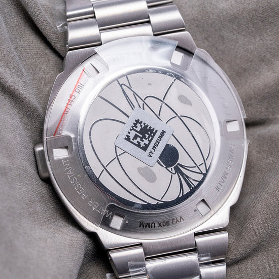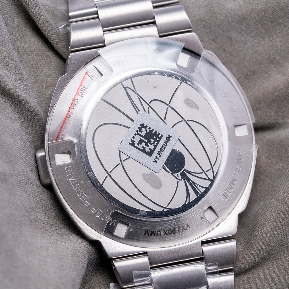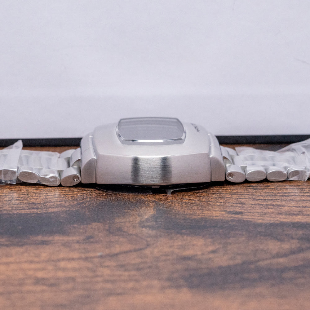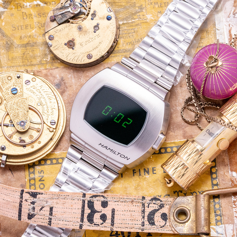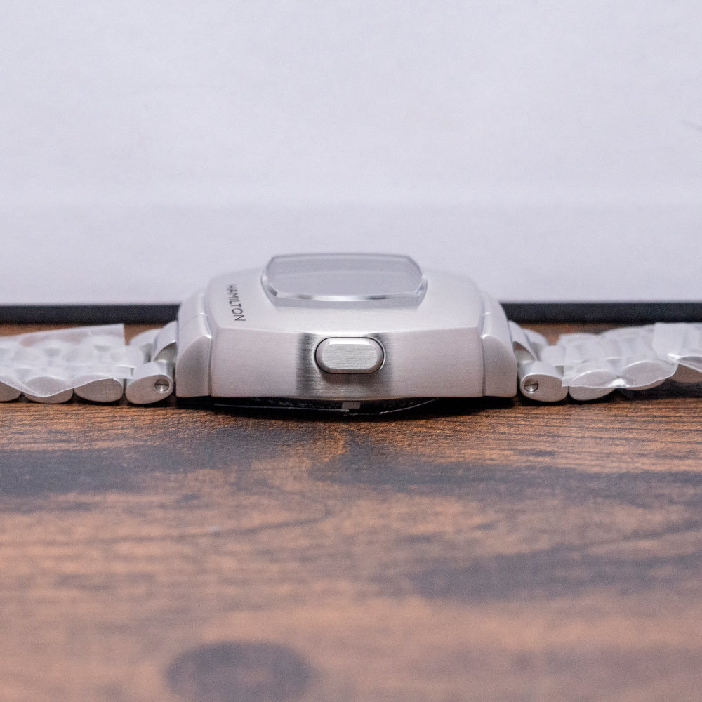 Here we have the charismatic, unworn 2022 Hamilton American Classic PSR Digital Quartz 'Green' H52414131, a modern reinterpretation of the world's first digital quartz watch, the Hamilton Pulsar, with its LED display launched in 1970, at the height of the space race between America and the USSR and was worn by many celebrities including Elvis, Elton John, Jack Nicholson. Its 41mm cushion-shaped brushed stainless steel and chromium case covers the lugs for a flowing, integrated aesthetic. Chromium is a highly resistant alloy to rust, tarnishing and corrosion. The curved brushed flanks lead to a lug-to-lug length of 35mm and a case thickness of 13.5mm, giving the watch an impressive wrist presence. On the right side is a single pusher; the brushed top surface surrounds a sapphire crystal AR coated above a hybrid LCD and OLED digital display with LCD green digital numerals on all the time, and when you push the button in the OLED illuminated dot numerals appear, perfect at night, push the button again for the seconds. We have the Hamilton motif on the bottom right corner of the case. On the reverse, we have a screw-down case back with the details of the watch engraved around its edge and a depiction of a pulsar short for a pulsating star. This spinning neutron star emits pulses of radiation inside a Quartz movement. It comes paired with its 24-mm integrated brushed stainless steel president-style bracelet secured by a signed butterfly clasp. All links are included, and it comes with its Hamilton presentation box and booklets.