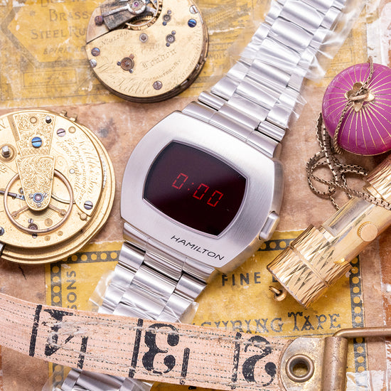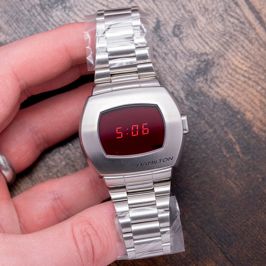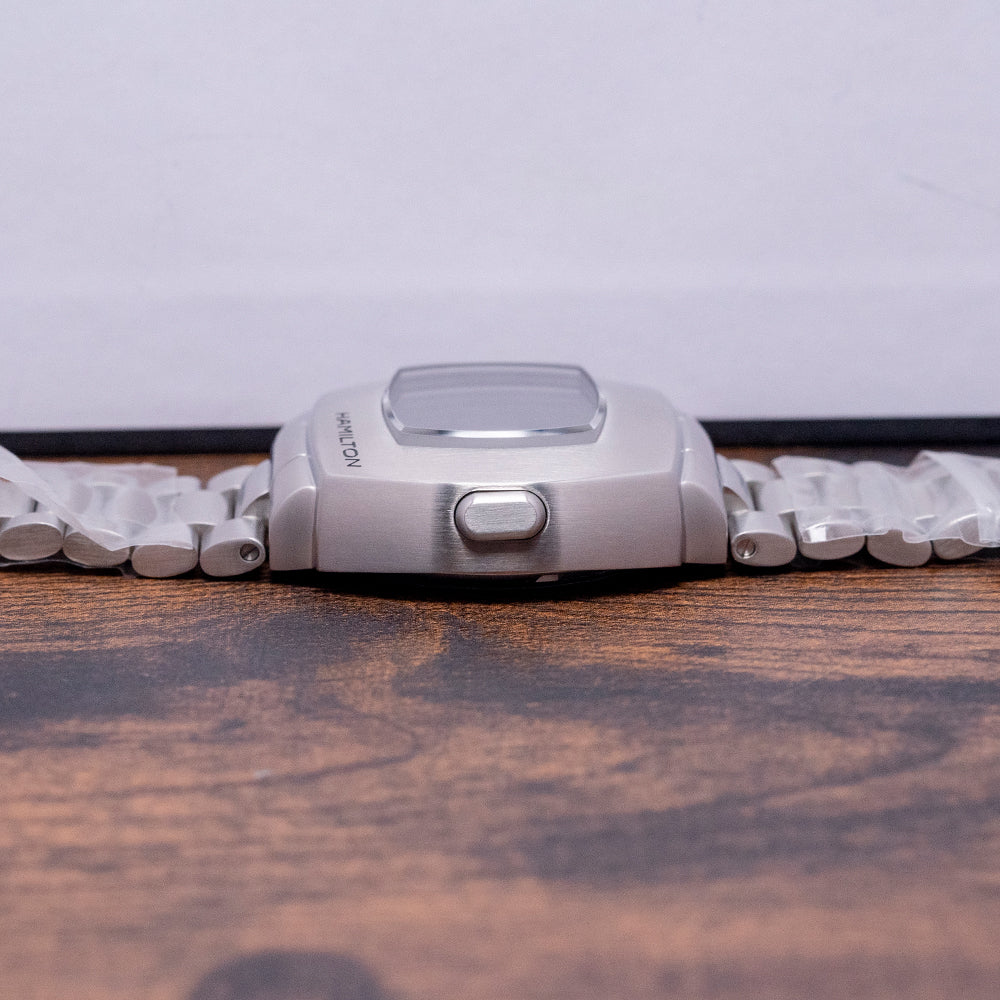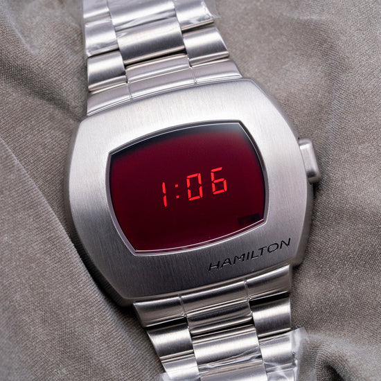 Here we have the charismatic, unworn 2022 Hamilton American Classic PSR Digital Quartz 'Red' H52414130, a modern reinterpretation of the world's first digital quartz watch, the Hamilton Pulsar, with its LED display launched in 1970, at the height of the space race between America and the USSR and was worn by many celebrities including Elvis, Elton John, Jack Nicholson. Its 41mm cushion-shaped brushed stainless steel and chromium case covers the lugs for a flowing, integrated aesthetic. Chromium is a highly resistant alloy to rust, tarnishing and corrosion. The curved brushed flanks lead to a lug-to-lug length of 35mm and a case thickness of 13.5mm, giving the watch an impressive wrist presence. On the right side is a single pusher; the brushed top surface surrounds a sapphire crystal AR coated above a hybrid LCD and OLED digital display with LCD red digital numerals on all the time, and when you push the button in the OLED illuminated dot numerals appear, perfect at night, push the button again for the seconds. We have the Hamilton motif on the bottom right corner of the case. On the reverse, we have a screw-down case back with the details of the watch engraved around its edge and a depiction of a pulsar, short for a pulsating star, which is a spinning neutron star that emits pulses of radiation, inside a Quartz movement. It comes paired with its 24-mm integrated brushed stainless steel president-style bracelet secured by a signed butterfly clasp. All links are included, and it comes with its Hamilton presentation box and paperwork.