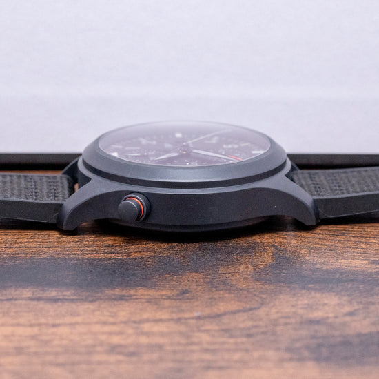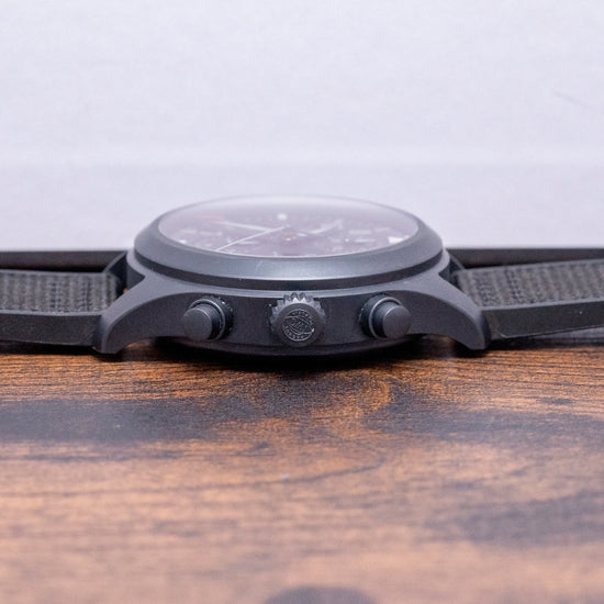 Made from a patented Titanium and Ceramic alloy IWC has developed called Ceratanium; it has the combination of lightness and strength with a hard scratch resistance and a stealthy black aesthetic. The curvaceous 44mm Ceratanium case curves over your wrist with thick tapered lugs, and its curved flanks lead to a lug-to-lug length of 53.5mm and a case thickness of 16mm, giving the watch an impressive wrist presence. Down the right side, we have the chronograph pushers and a signed crown made of Ceratanium; on the left side, at 10 o’clock rattrapante or split-seconds pusher, the stepped smooth bezel holds a convex sapphire crystal AR coated on both sides above a dynamic black dial. An outer minute track has applied baton and triangle with pips surrounding grey Arabic numerals marking the hours, at 12 o’clock, a 30-minute recessed register, at 3 o’clock, a colour-matched day/date window, at 6 o’clock, a 12-hour recessed register and finally, at 9 o’clock a small seconds register, each with a concentric circular pattern and grey sword hand, the Hour and minute sword hands are filled with grey lume and complemented by a black split seconds hand with red tip and a grey tapered chronograph hand, at 3 o’clock we have the IWC motif completing this distinctive pilot's double chronograph. On the reverse, a Ceratanium screw-down case back with the iconic Top Gun logo engraved in the centre with the details of the watch engraved around its edge, inside a soft-iron inner case resistant to magnetic fields, an Automatic IWC Cal. 79420, 29 jewels, beating at 21,600 beats per hour, it has a base of the ETA 7750 with a Rattrapante/split seconds. The Doppelchronograph (Double Chronograph) was first introduced in 1831 by Joseph-Thaddeus Winnerl, who went on to develop a split-second mechanism heart cam in 1838. In 1923 Patek Philippe made one to fit inside a wristwatch, and today, they still make the smallest Rattrapante chronograph in the world in reference 5959. To activate the split seconds, you push the pusher at 10 o’clock this stops the lower hand, while the top chronograph continues on, when released, the lower hand catches up with the top hand, and when you reset, you reset both hands at the same time. This mechanism, consisting of a heart cam and roller, acts as a memory for the split-second wheel, which allows it to instantly catch up to the top chronograph hand. It comes paired with its original 21mm IWC black rubber strap with Ceratanium hardware and comes with its IWC presentation box and paperwork.