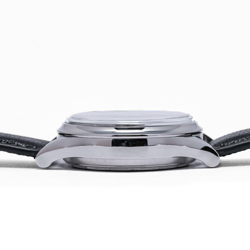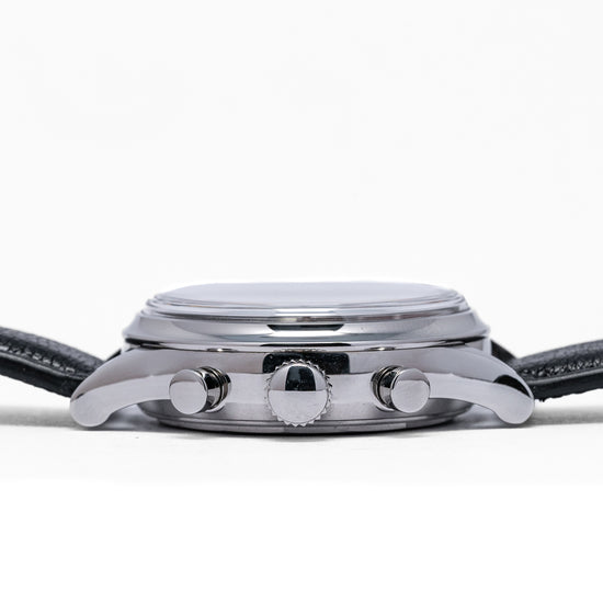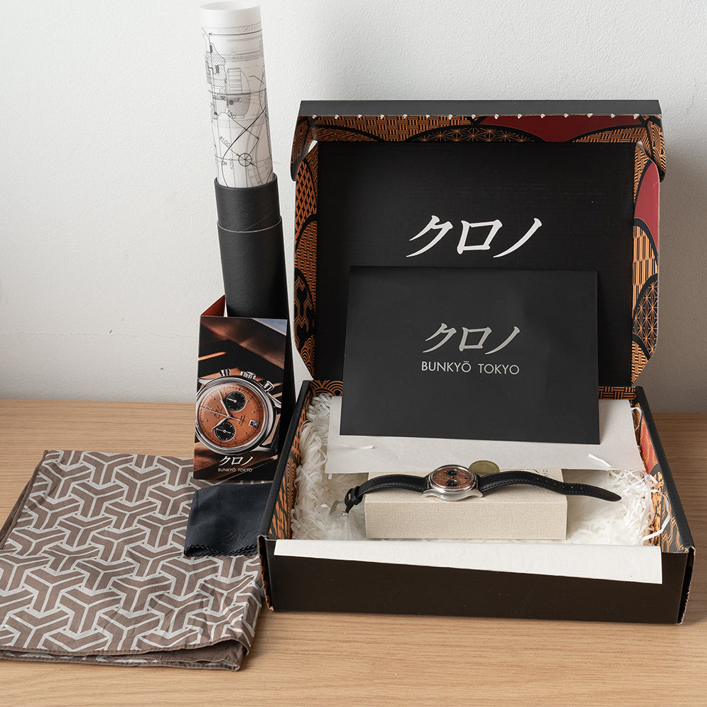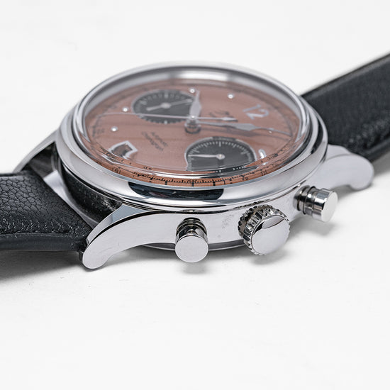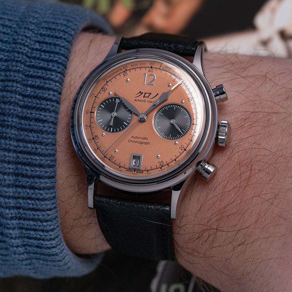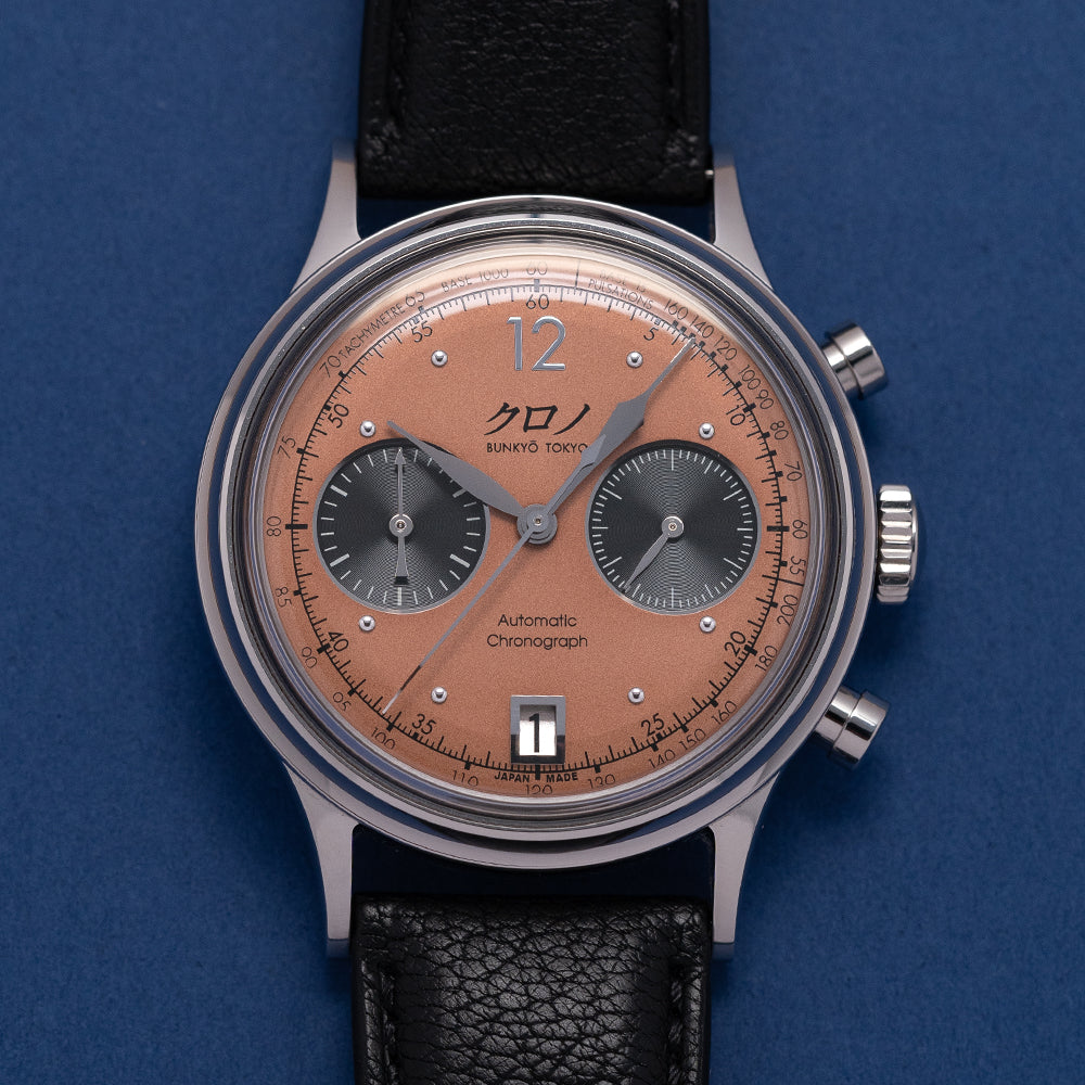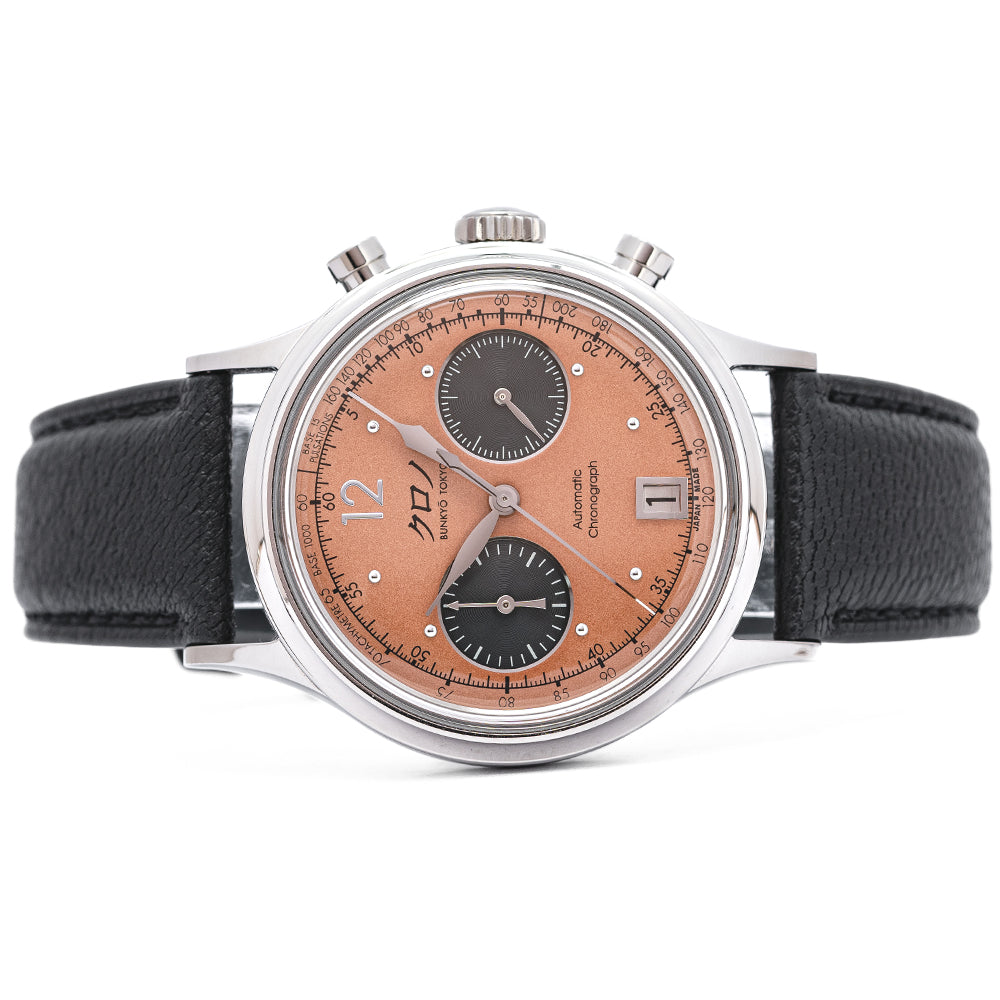 Here we have a 2022 Kurono Tokyo Chronograph 1 MK.2 with a newly designed polished 38mm three-part stainless steel case and curvaceous tapered lugs, a lug-to-lug length of 46mm and a case thickness of 13mm ensures a comfortable fit on your wrist. On the right side, we have the chronograph piston pushers and a large crown in the centre. The smooth polished bezel holds a sapphire box crystal above a stunning salmon-coloured dial that has a subtle curve to it from the centre to its edge, pulsation and tachymeter scales surround a minute track precisely executed with Arabic numerals printed in black, applied polished steel 12 and the characteristic steel studs mark the hours, at 6 o’clock a framed date window, the black recessed sub-dials consist of a 30-minute and continuous second counter with a traditional Japanese 'kyudo' arrow at 9 o’clock. Elegant signature Kurono Tokyo hands, and at 12 o’clock we have the Kurono Tokyo motif and at 6 o’clock “Automatic Chronograph”. On the reverse, a screw-down case back with the details of the watch embossed around its edge, inside an automatic Caliber NE86, 34 jewels, beating at 28,800 beats per hour, a true workhorse flagship column-wheel chronograph movement made by Seiko. The watch comes fitted on a 20mm black leather strap and the watch comes with its Kurono Tokyo presentation box and paperwork.