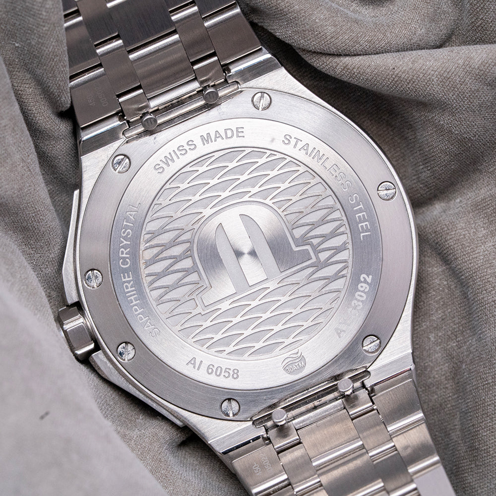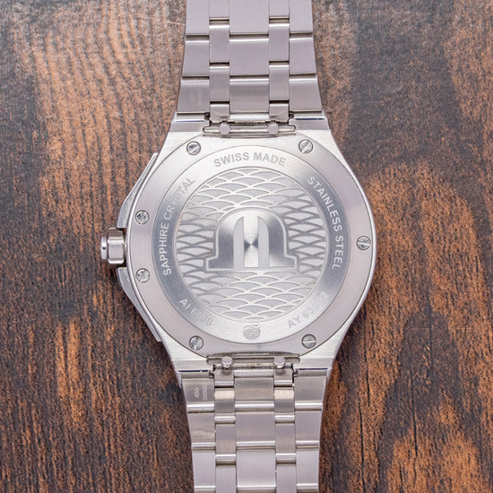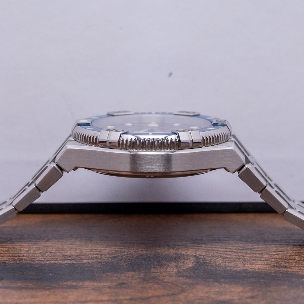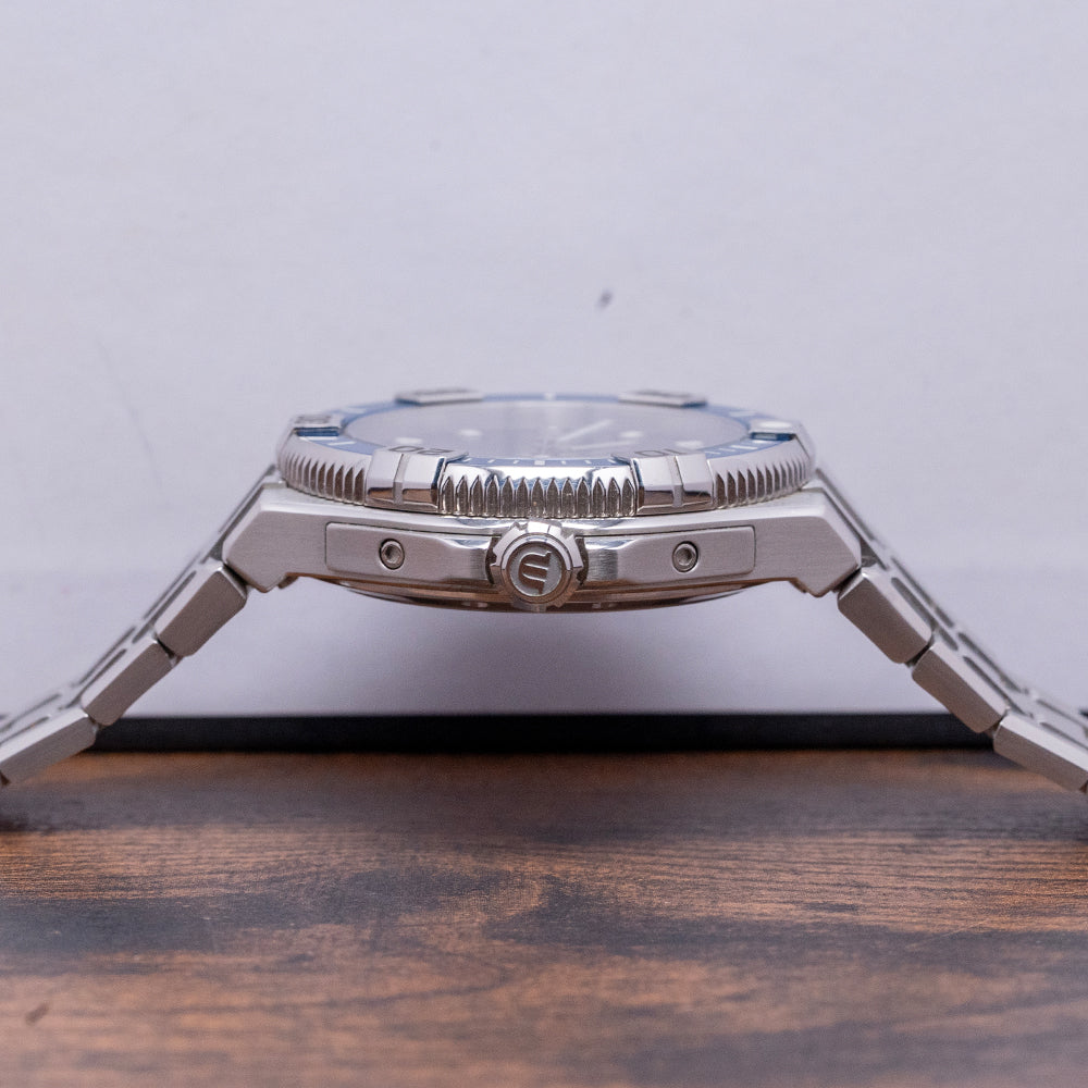 Here we have a 2022 Maurice Lacroix Aikon Venturer Automatic Blue, featuring a 43mm brushed stainless steel case that seamlessly flows over your wrist, paired with an integrated bracelet and angled, flat-ended lugs. Its polished bevel-edged flanks lead to a lug-to-lug length of 48.5mm and a case thickness of 12mm, giving the watch an impressive wrist presence. On the right side, a signed, deeply knurled crown is protected by hex bolted crown guards. A unidirectional bezel features deep knurling for enhanced grip and a blue ceramic 60-minute dive insert with prominent claw sections every 10 minutes marked in engraved numerals, along with a lume pip at 12. A sapphire crystal sits above a striking sunburst blue dial. An outer minute chapter ring surrounds the applied disc and baton indexes, filled with Super-LumiNova, marking the hours. At 3 o’clock, a framed date window is located. Steel hands filled with the same lume are complemented by a lollipop counterweighted sweeping second hand. At noon, the Maurice Lacroix motif, and at 6 o’clock, the ‘Automatic 30ATM’ completes this rugged sports watch. On the reverse, a screwed-down solid case back engraved with the details of the watch around its edge and an engraved Maurice Lacroix ‘M’ inside ‘Vagues du Jura’ pattern design in the centre, inside an automatic ML Cal. ML115, 26 jewels, beating at 28,800 beats per hour. It comes paired with its 24mm integrated polished and brushed stainless steel five-link bracelet, secured by a signed push-button butterfly clasp and an easy-release system; all links are provided, along with an additional Maurice Lacroix fitted blue rubber strap and pin buckle. This watch is sold with its original Maurice Lacroix presentation box, swing tag and paperwork.