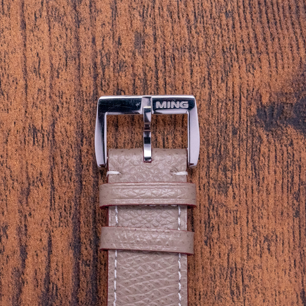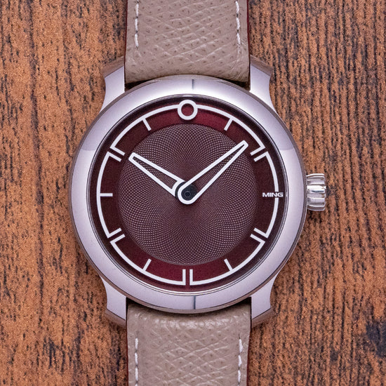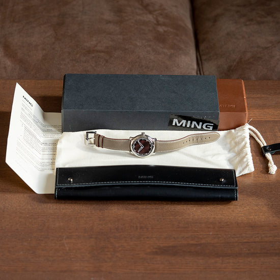 This watch is sold with its original Ming box, travel case and paperwork. The watch comes paired with its original 20mm Jean Rousseau Paris textured calf in taupe with a brown Alcantara lining strap with a signed buckle. The watch is from June 2022 and in worn condition but overall in very fair condition as you can see. The watch comes with its Manufacturer's Warranty.