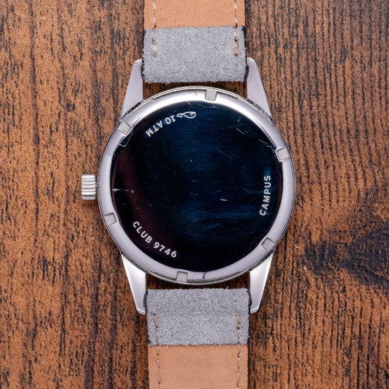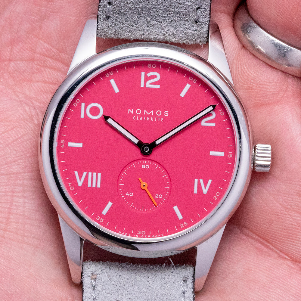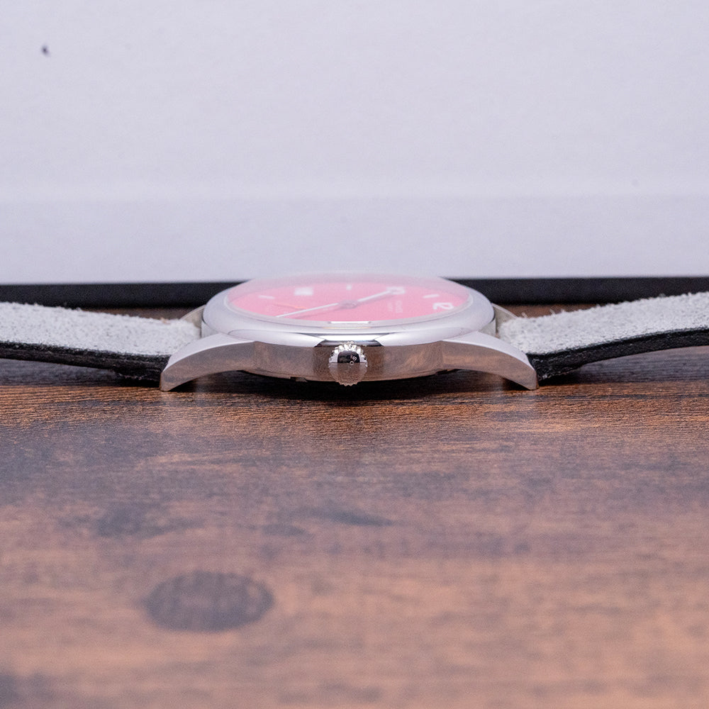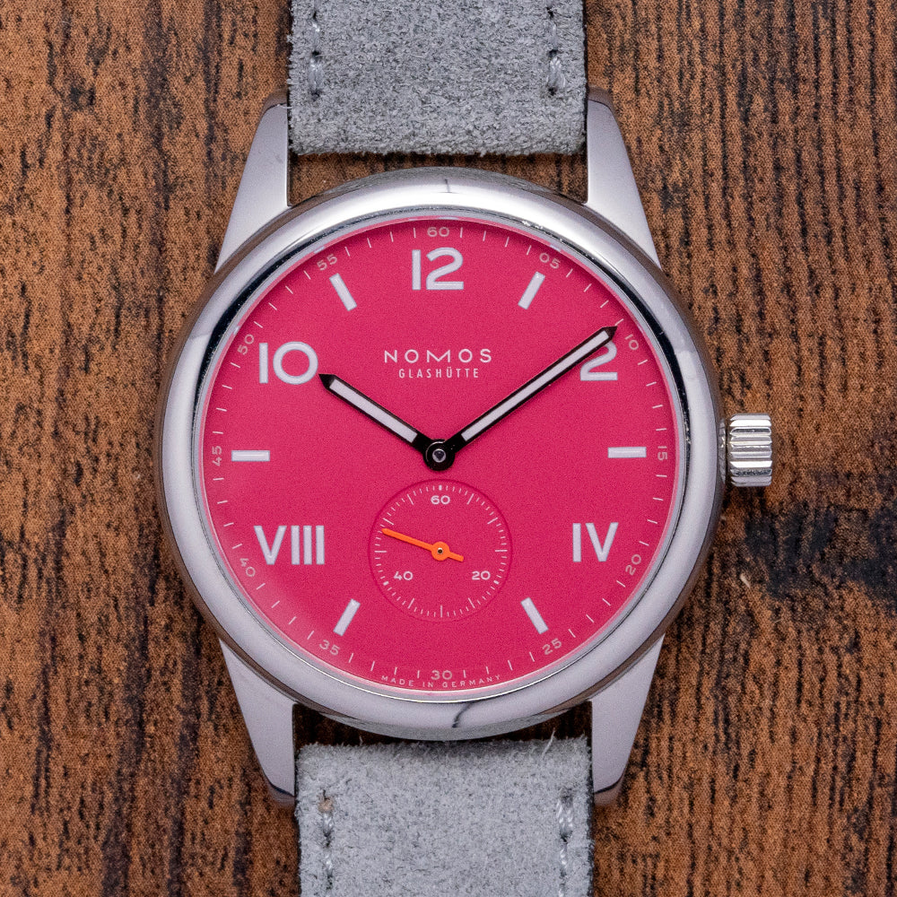 This Nomos Club Campus 38mm, reference 728, features their "Deep Pink" dial and it truly is deep pink! It plays with the light beautifully and as that forever elusive sun begins to appear in the UK sky, this will be a wonderful option to wear and enjoy! Paired with the perfect grey suede, it is ready to wear and be enjoyed.