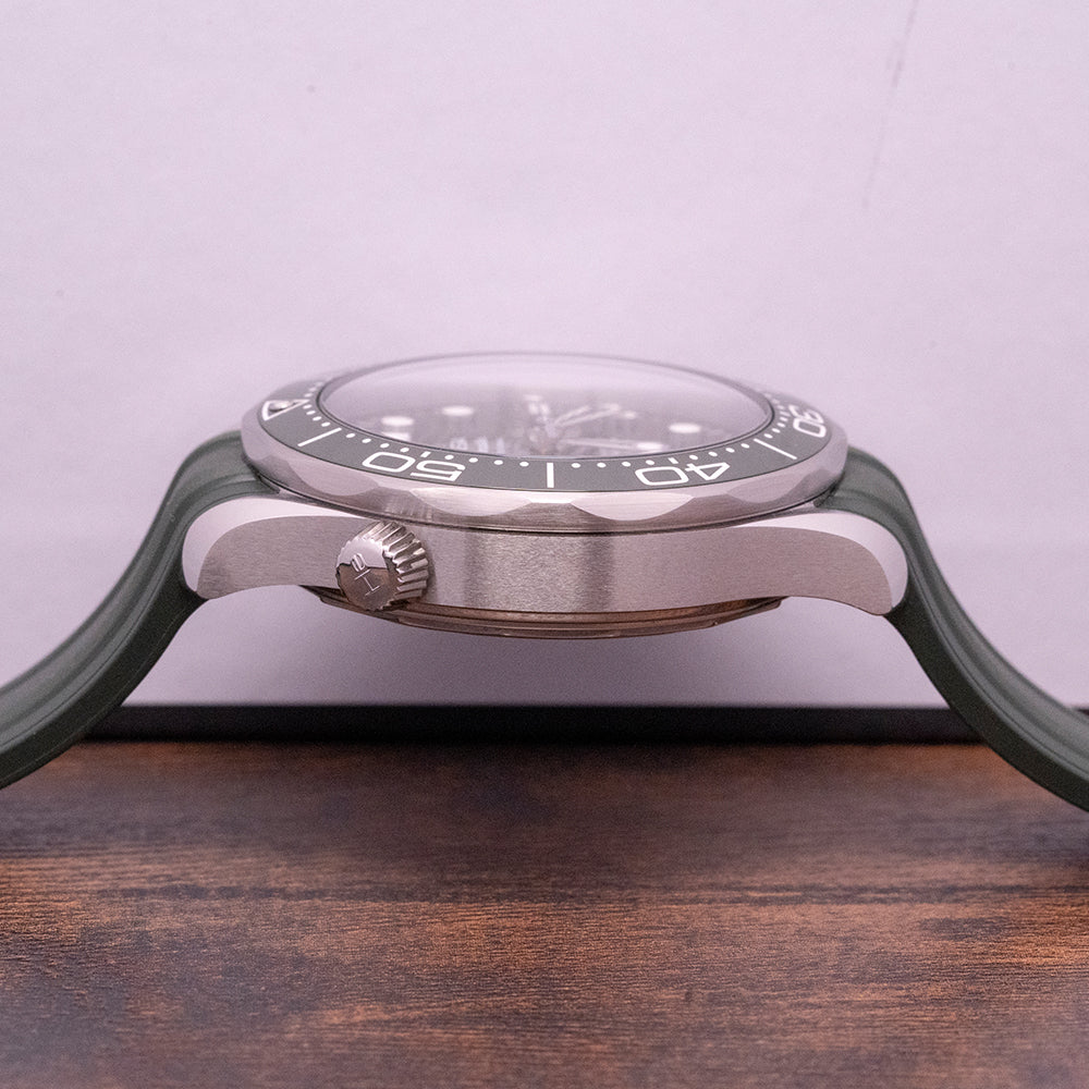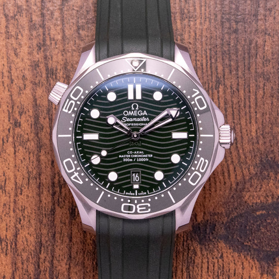 Here we have a 2022 Omega Seamaster 300M Co-Axial Green 210.32.42.20.10.001 with a 42mm polished and brushed stainless steel case that curves over your wrist with the characteristic twisted lugs associated with a modern Seamaster. Celebrating Omega’s maritime and dive heritage, in 1957 Omega introduced the 300 Seamaster series created for the professional diver. A lug-to-lug length of 50mm and a case thickness of 13.5mm give the watch an impressive wrist presence. At the 10 o’clock position a Manual helium escape valve, and on the right side is a signed screw-down crown protected by crown guards, the scalloped-edged green ceramic unidirectional bezel insert has white enamel dive minutes marked clearly, holding a domed AR-coated sapphire crystal above the dramatic polished dark green ceramic dial with a laser engraved wave pattern, applied baton and discs coated in Super LumiNova mark the hours. Skeletonised hands are Rhodium plated tipped with Super LumiNova, making low-light visibility impressive. At the 6 o'clock position sits the date window, at 12 o’clock we have the Omega motif with “Seamaster Professional” printed underneath and at 6 o’clock “Co-Axial Master-Chronometer” 300m/1000ft completes this dynamic dive watch. On the reverse an exhibition sapphire case back with wave edging showcasing the automatic Omega Co-Axial Cal. 8800, 35 jewels, 25,200 beats per hour, a Certified Master Chronometer, approved by METAS, "Swiss National Metrology Institute", the watch goes through COSC certification before being selected for the eight tests run by METAS, this movement is resistant to magnetic fields. It has a silicon balance spring that winds in both directions, finished in Rhodium plating and decorated with Geneva waves. The watch comes fitted on its 20mm Omega green rubber strap with a signed buckle and the watch comes with its Omega presentation box, travel case and papers.