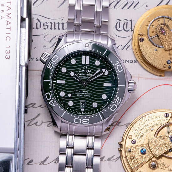 Here we have a 2022 Omega Seamaster 300M Green Bracelet & Rubber 210.30.42.20.01.001 with a 42mm polished and brushed stainless steel case that curves over your wrist with the characteristic twisted lugs associated with a modern Seamaster. Celebrating Omega’s maritime and dive heritage, in 1957 Omega introduced the 300 Seamaster series created for the professional diver. A lug-to-lug length of 50mm and a case thickness of 13.5mm give the watch an impressive wrist presence. At the 10 o’clock position a Manual helium escape valve, and on the right side is a signed screw-down crown protected by crown guards, the scalloped-edged green ceramic unidirectional bezel insert has white enamel dive minutes marked clearly, holding a domed AR-coated sapphire crystal above the dramatic polished dark green ceramic dial with a laser engraved wave pattern, applied baton and discs coated in Super LumiNova mark the hours. Skeletonised hands are Rhodium plated tipped with Super LumiNova, making low-light visibility impressive. At the 6 o'clock position sits the date window, at 12 o’clock we have the Omega motif with “Seamaster Professional” printed underneath and at 6 o’clock “Co-Axial Master-Chronometer” 300m/1000ft completes this dynamic dive watch. On the reverse an exhibition sapphire case back with wave edging showcasing the automatic Omega Co-Axial Cal. 8800, 35 jewels, 25,200 beats per hour, a Certified Master Chronometer, approved by METAS, "Swiss National Metrology Institute", the watch goes through COSC certification before being selected for the eight tests run by METAS, this movement is resistant to magnetic fields. It has a silicon balance spring that winds in both directions, finished in Rhodium plating and decorated with Geneva waves. The watch comes fitted on its polished and brushed 20mm Omega stainless steel bracelet with a signed push button release folding clasp, all links provided plus an additional 20mm Omega rubber strap with a deployment clasp and the watch comes with its Omega presentation box and papers.