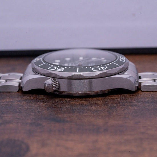 Is green the new blue? Omega certainly thinks so with the releases of Green over the past few years, and I'm personally all for it. I'm not typically a massive green fan in watches, but this shade of green and how it plays with the light is wonderful and adds another level on the wrist that the picture just can't capture. The bracelet adds a real sturdy heft to the watch, but the fitted rubber strap from Omega adds a whole new level too. This is one to come to see in person if you are unsure, so book an appointment and see it for yourself!