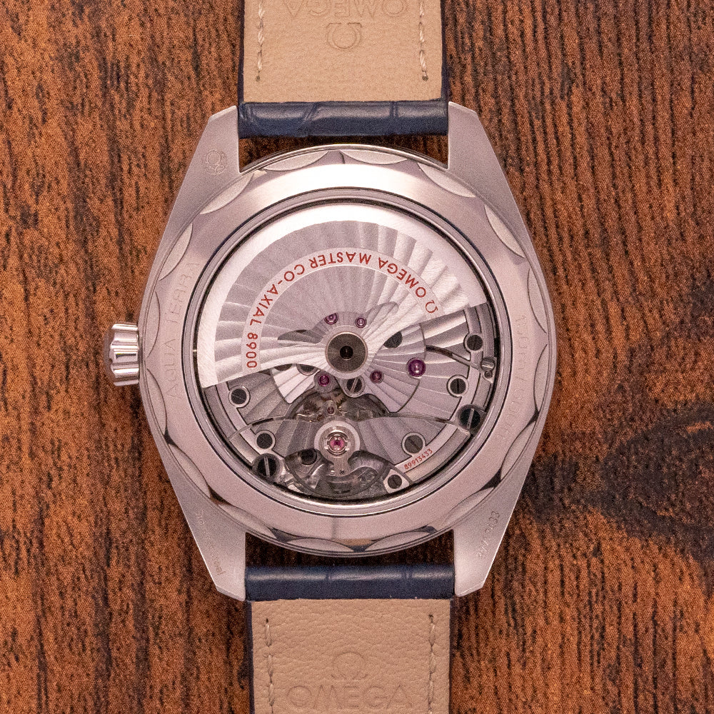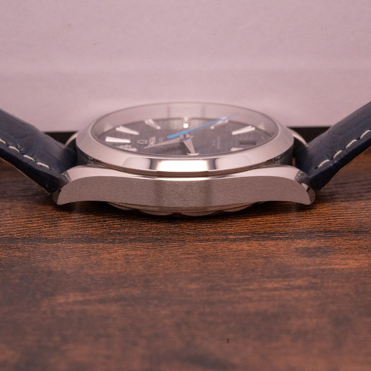 Here we have a 2022 Omega Seamaster Aqua Terra Co-Axial 220.13.41.21.03.002 that has a 41mm brushed and polished stainless steel symmetrical case, the case curves over your wrist with the characteristic twisted lugs, and a lug-to-lug length of 47.5mm and a case thickness of 13mm gives the watch an impressive wrist presence. The Aqua Terra family was launched in 2002 and in 2017 we saw this improved version launched at Baselworld. On the right side is a signed screw-down crown that sits slightly recessed. The polished smooth bezel holds a flat sapphire crystal AR coated on both sides above a blue dial with a horizontal striped pattern inspired by the wooden decks of sailing boats. An outer minute chapter ring has small Arabic numerals with blue numerals at the quarters surrounding applied arrow point indexes, that catch the light beautifully, coated in SuperLumiNova marking the hours. At 6 o’clock we have a framed date window. Rhodium-plated Arrow hands infilled with SuperLumiNova complemented by a blue sweeping second hand with arrow point filled with luminance. Text is precisely applied with the Omega motif "Seamaster'' at 12 o’clock and “Co-Axial Master Chronometer” at 6 o’clock. On the reverse is a screw-down exhibition sapphire case back with a wave pattern outer edge, inside an automatic Omega Co-Axial Cal. 8900, 29 jewels, 25,200 beats per hour, certified by the Swiss Federal Institute of Metrology (METAS), the watch goes through COSC certification before being selected for the eight tests run by METAS, this in-house movement released in 2015 is Chronometer Certified with a bi-directional rotor which reduces winding time and a Co-Axial Escapement, two barrels in series for excellent stability and durability and a silicon balance spring providing the movement resistance to magnetic fields of over 15,000 Gauss, decorated with Cotes de Geneve. The watch comes fitted on its Omega 20mm Alligator leather strap with a push-button deployment clasp and the watch comes with its Omega presentation box, swing tag and papers.