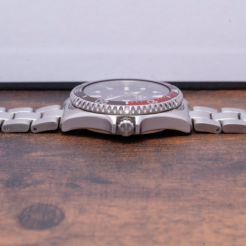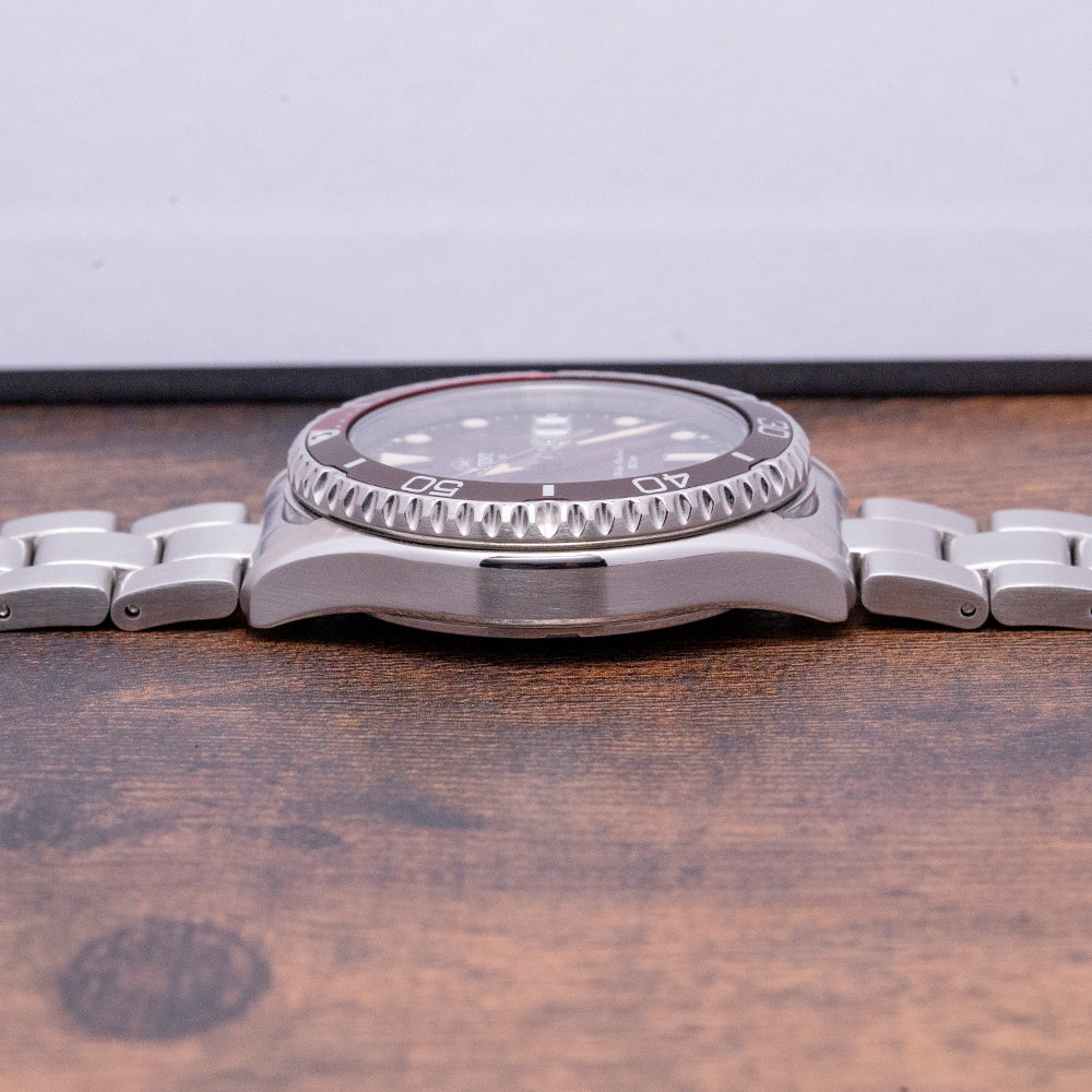 Here we have a 2022 Orient Kamasu Mako III Red/Brown Auto RA-AA0814R19B with a 42mm stainless steel case, polished and brushed surfaces transition with crisp edges, and a lug-to-lug length of 46mm and a case thickness of 13mm ensuring a comfortable fit on your wrist. On the right side is a signed screw-down crown protected by crown guards, and a unidirectional 120-click bezel that has a two-tone red aluminium 60-minute dive insert with a bright red 15-minute scale printed on it. A flat sapphire crystal sits above a striking sunburst deep red/brown dial and applied disc and baton indexes coated in luminance mark the hours. At 3 o’clock a day date framed the window. Broad sword hand and arrow hand filled with luminance are complemented by a sweeping arrow point second hand, the text is precisely executed on the dial with an applied Orient coat of arms at 12 o’clock. On the reverse a screw-down exhibition case back showcasing an automatic Orient Cal. F6922, 22 jewels, 21,600 beats per hour, the in-house movement has hand winding and hacking for your convenience. The watch comes paired with its Orient 22mm stainless steel bracelet with a signed flip-lock folding clasp and comes with its Orient presentation box and unsigned papers.