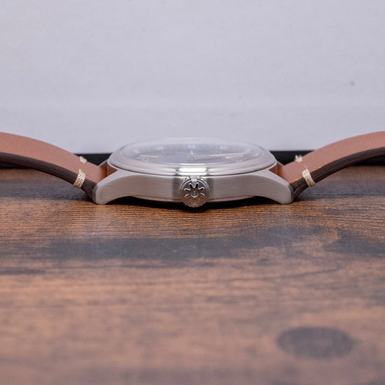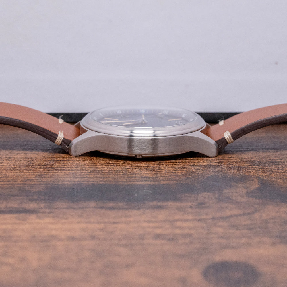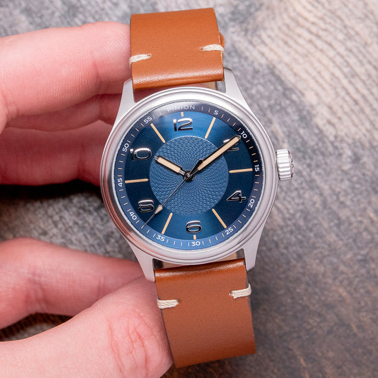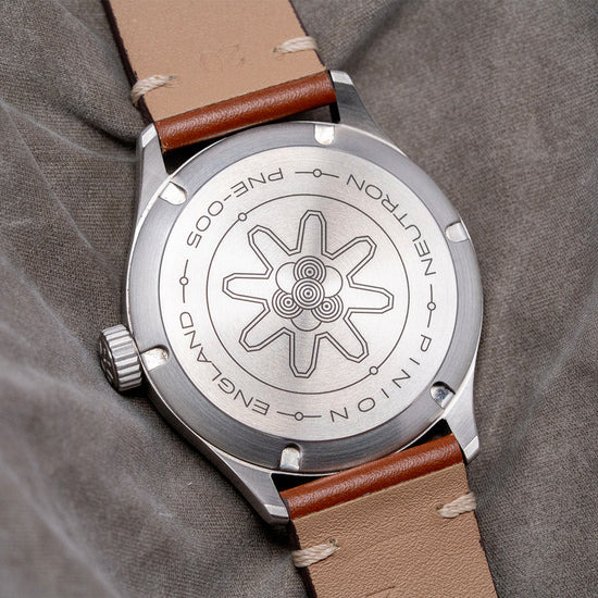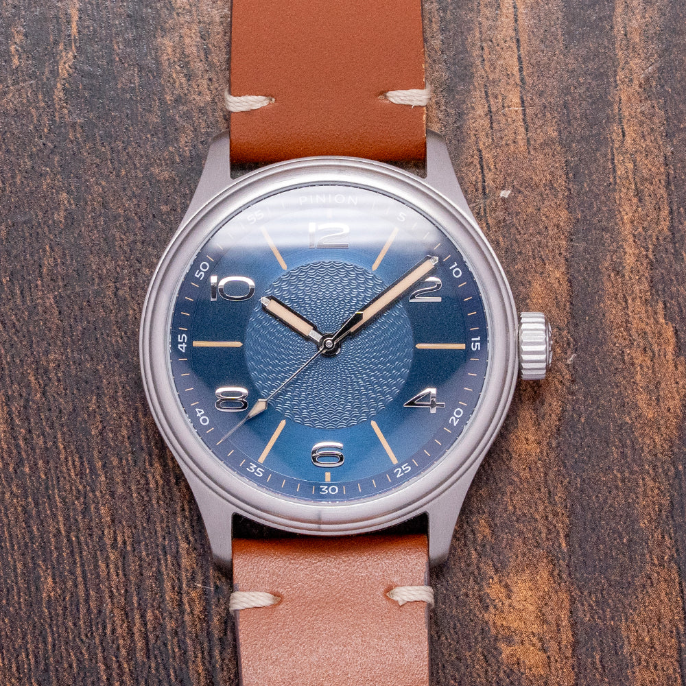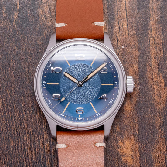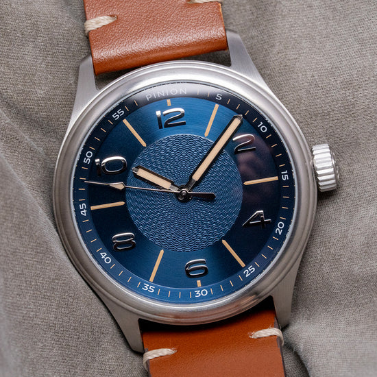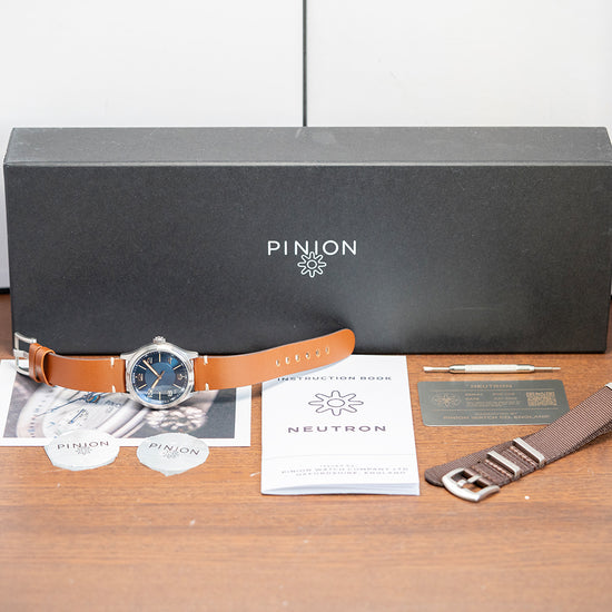 Here we have a 2022 Pinion Neutron ST-BL Blue 38.5mm Automatic on Strap. It has a 38.5mm brushed stainless steel case that curves over your wrist with finely tapered lugs. A lug-to-lug length of 45mm and a case thickness of 10.5mm ensure a comfortable fit on your wrist. On the right side, a signed push-down crown with a double o-ring, and the smooth stepped bezel holds a domed sapphire crystal AR coated on the inside above a striking Galvanic blue sector-style dial. A 60-minute chapter ring surrounds a brushed ring with applied polished steel numerals and “old-Radium” Super-LumiNova-coated baton indexes marking the hours, an attractive Guilloché centre has sword hands infilled with “old-Radium” Super-LumiNova complemented by an arrow-pointed sweeping second hand. At 12 o’clock, we have the Pinion motif completing this vintage-inspired timepiece. On the reverse, a screwed-down case back with the deep engraving of the Pinion motif and serial number, inside an automatic ETA Cal. 2824-2, 25 jewels, beating at 28,800 beats per hour, this workhorse movement has hacking seconds. The watch comes paired with a 20mm vintage-style leather strap and a signed buckle, plus a Pinion NATO strap with a signed buckle in the box. The watch comes with the Pinion presentation box, a strap-changing tool, and Pinion paperwork.