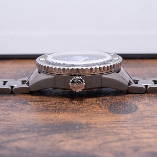 Here we have a 2022 Rado Captain Cook High-Tech Ceramic Diver Blue Dial R32144202 with a curvaceous 43mm monobloc case completely made of matte black plasma high-tech ceramic, Rado called Ceramos, each case is transformed from a powder through a series of processes in a plasma reactor where the powder is heated to an incredible 20,000 °C resulting in this scratch resistant and very light case. Made by ComaDur who are leading specialists in ceramic production and are part of the Swatch Group. A lug-to-lug length of 49mm and a case thickness of 14mm give the watch an impressive wrist presence, on the right side is a signed polished hardened stainless steel screw-down crown. The watch is ISO 6425 certified meeting their specified requirements. The polished rotating hardened stainless steel bezel has deep knurling for extra grip and a polished High-Tech Ceramic 60-minute insert with laser engraved metallic numerals and markers holding a domed box-style sapphire crystal AR coated on both sides for excellent visibility. The polished blue lacquer dial has a minute chapter ring surrounding the applied baton and triangular indexes coated in SuperLuminova marking the hours, at 3 o’clock a recessed date window with red numerals on a white background, the Rhodium-coloured hands consist of a sword and arrow hand filled with SuperLuminova and complemented by an arrow pointed sweeping second hand, at 12 o’clock we have the rotating Rado anchor and at 6 o’clock “Captain Cook 300m/1000ft” completing this incredibly durable dive watch. On the reverse, a screw-down case with the Rado seahorse motif embossed in the centre, inside an automatic Rado Cal. 03.763.735 based on the ETA Cal.C07.611 with an upgraded Nivachron hairspring. The watch comes paired with its High-Tech Ceramic matte outer links, polished centre link bracelet and a signed Titanium three-fold clasp with a ceramic opener, and this watch is sold with its original Rado presentation box, swing tag and Paperwork.