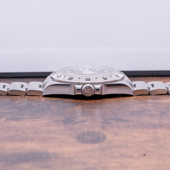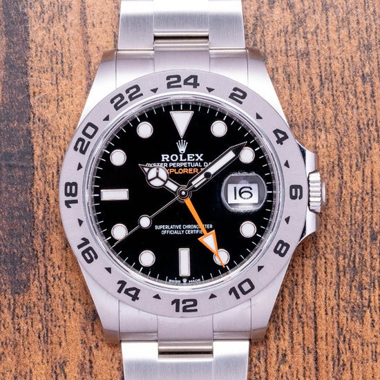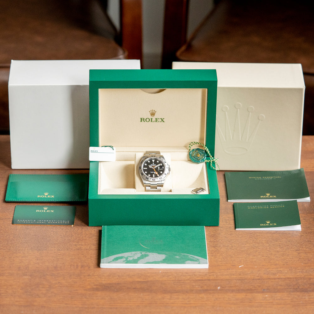 Here we have a 2022 Rolex Explorer II Black Dial New Reference 226570. The Explorer II was specifically made for Spelunkers who are cave explorers; this meant it was built with a particular specification and ultra-durability. A curvaceous 42mm Rolex OysterSteel Oyster case, the tapered lugs gently curve over your wrist with a lug-to-lug length of 49.5mm and a thickness of 12mm, giving the watch an impressive wrist presence. Polished and brushed surfaces transition with crisp flowing lines showcasing the understated profile. On the right side is a Twinlock screw-down signed crown protected by crown guards. The brushed steel fixed bezel has 24-hour engraved and painted black numerals. A sapphire crystal with a cyclops magnification at 3 o’clock sits above the black dial; an outer minute track surrounds the disc and baton indexes filled with Chromalight marking the hours, and at 3 o’clock, a large date window. A Rolex crown at 12 o'clock with “Rolex Oyster Perpetual Date” and “Explorer II” in orange, at 6 o’clock “Superlative Chronometer Officially Certified”. The White Gold Mercedes's hands are filled with Chromalight complemented by an arrow-tipped orange GMT hand and lollipop sweeping second-hand; the GMT hand circles the dial once every 24 hours, and the hour hand can be adjusted forwards or backwards independently of the minute and second hands. On the reverse, a coin-edged screw-down case back, inside an automatic Rolex Cal. 3285, 31 jewels, 28,800 beats per hour, Superlative Chronometer is their in-house version of testing that goes beyond COSC specifications. The watch comes paired with its brushed Rolex 21mm three-piece OysterSteel Oyster bracelet; the folding OysterLock clasp has 5mm Easylink micro-adjustments that simplify adjusting the bracelet; all links are provided and also comes with its Rolex presentation box, swing tag and papers.
