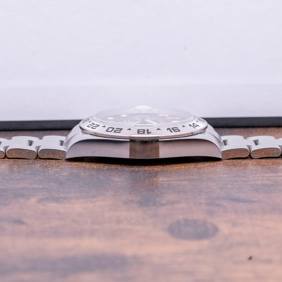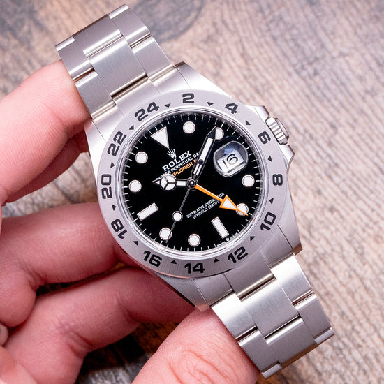 Whilst I do personally prefer the older 40mm Explorer II on my wrist, I cannot deny the surprising comfort of this new reference 226570 in 42mm! This is definitely a watch to try on before ruling it out for you if you feel it may be too large for your wrist, with under 50mm lug to lug it is rather compact. The black dial works beautifully, as you would expect, especially with the super bold hands and indices throughout contrasting perfectly with the iconic pop of orange. Do not hesitate to add this watch to your collection today!