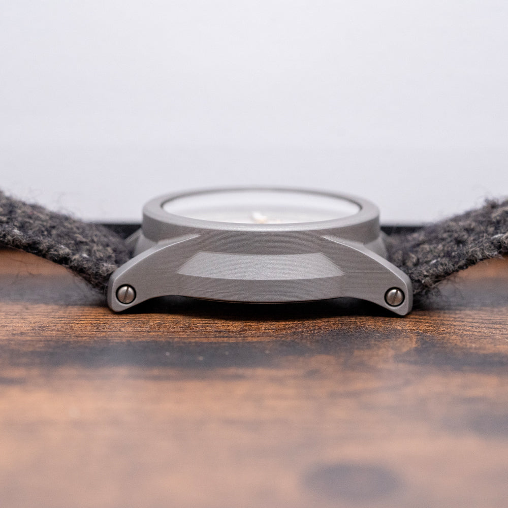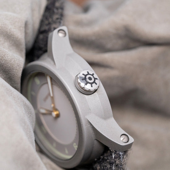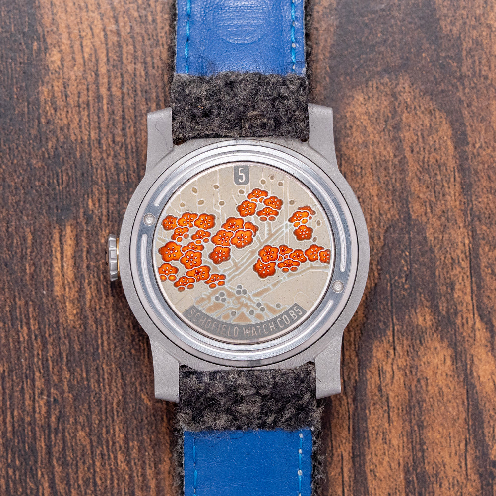 Here we have an exquisite 2022 Schofield B5 Japanese Sakura Automatic Limited to 24 featuring a 44mm sculpted stainless steel case expertly textured by vapour-blasting. Its industrial design adds character and uniqueness to the watch. Sloping wide screw-in lugs with a lug-to-lug length of 52mm and a thickness of 14.5mm give the watch an impressive wrist presence. On the right side, a deeply knurled double o-ring pull-out crown with a gold ring. A smooth bezel holds a flat sapphire crystal AR-coated in nine layers. An outer ring in a pale green was made of a specially commissioned custom SuperLumiNova C3. The sector dial has an outer muted blossom ring with applied numeral and dagger indexes marking the hours coated in C3 SuperLumiNova. An inner minute track surrounds its paler, muted blossom centre, a nice contrast, and brushed gold skeletonised sword hands with SuperLumiNova C3 tips. In the centre, the cap has a lollipop balance, which they call “Sign-of-Life” second hand. At 12 o’clock, the Schofield logo. On the reverse, a screw-down case back. The intricate engraving is a stylised old plum tree in sterling silver and glass enamel, inspired by a Fuchū manhole cover. Inside an automatic STP 1-11, 26 jewels, 28,800 beats per hour, this movement was first released in 2012 and features hand-winding and hacking for your convenience. It comes with two 24mm Schofield straps with a single signed pin buckle. The watch also comes with its Schofield presentation box and papers.