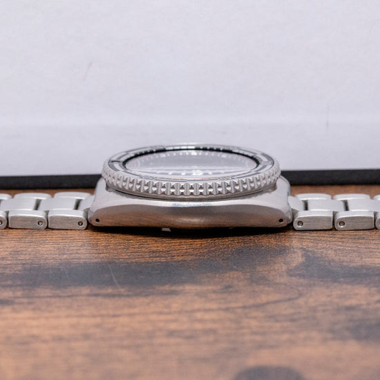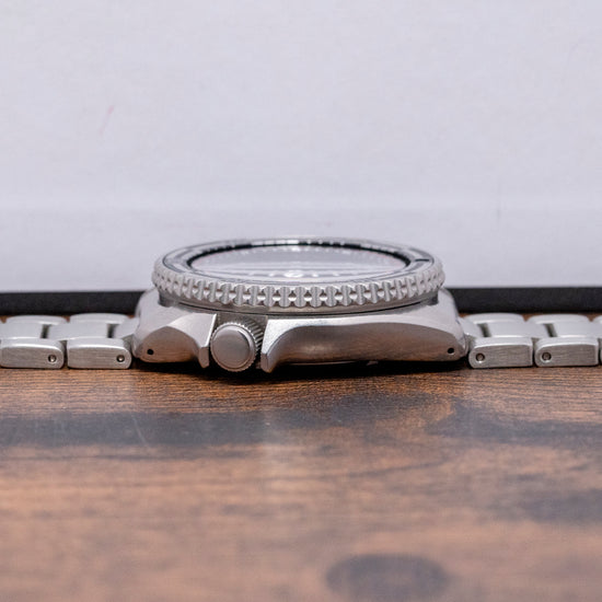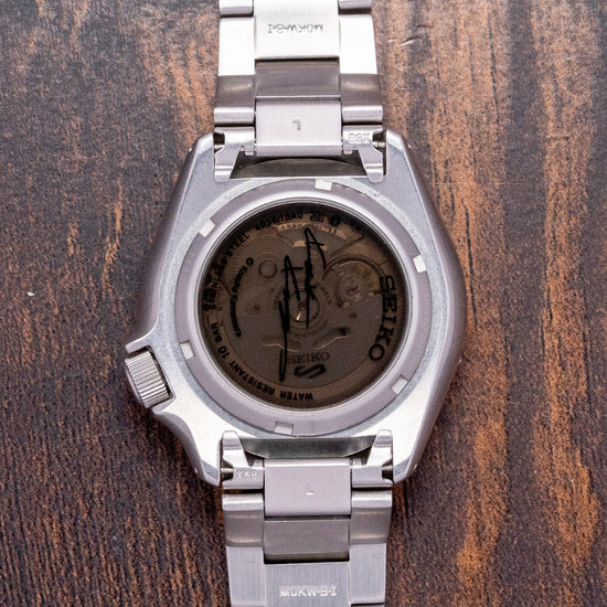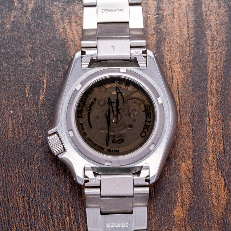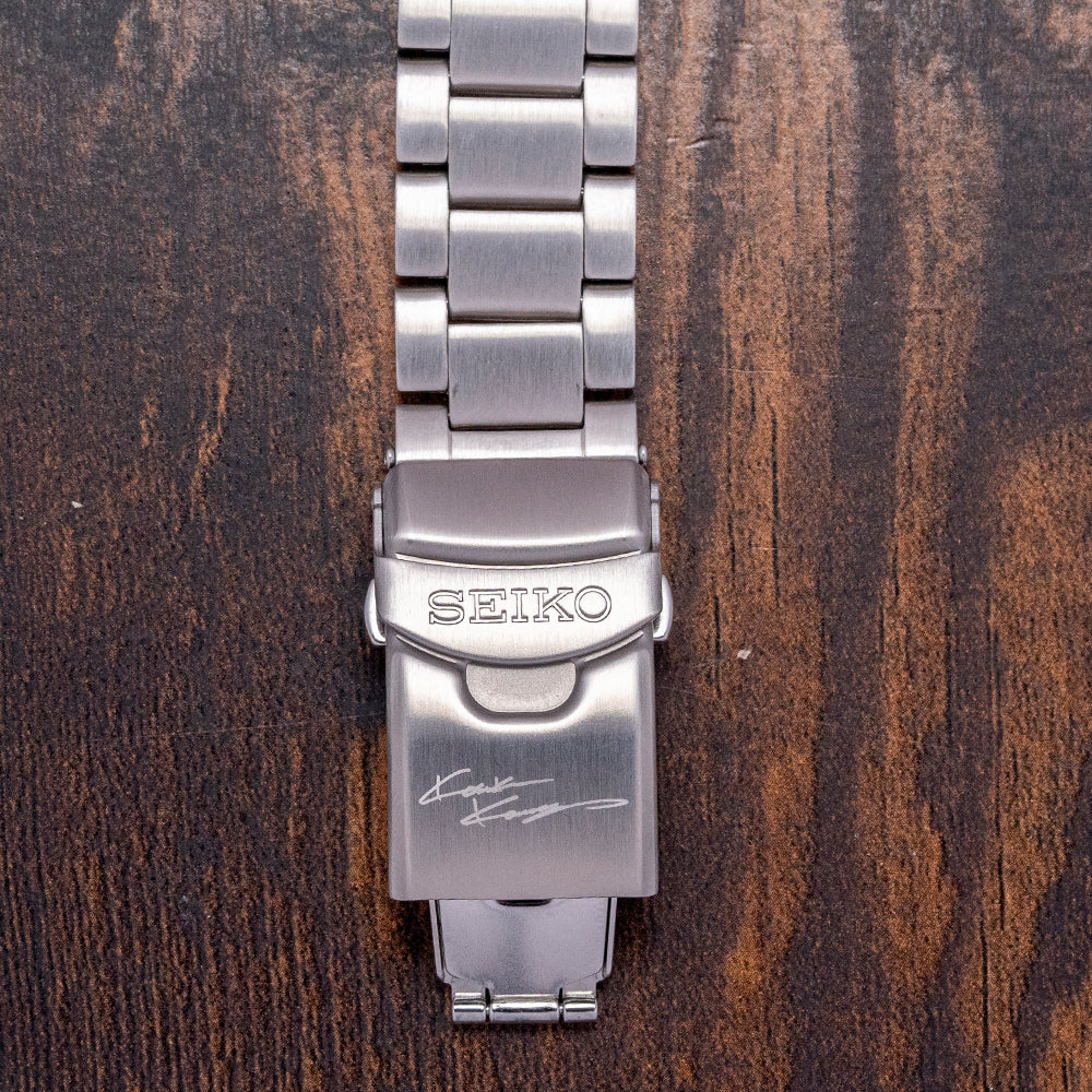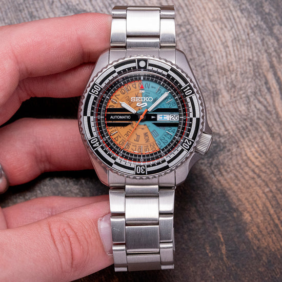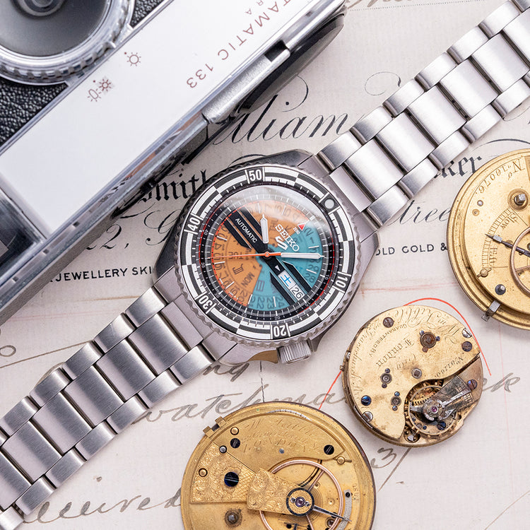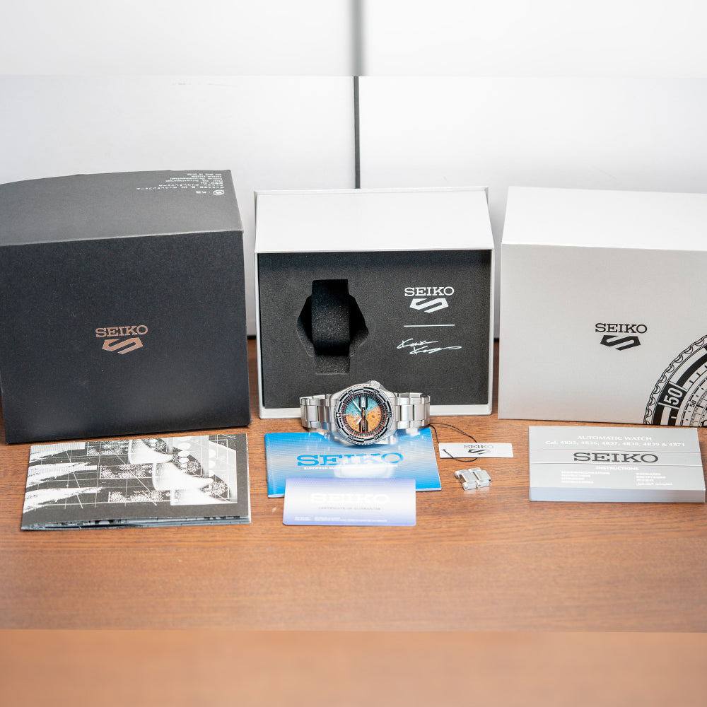 Here we have a 2022 Seiko 5 'Kosuke Kawamura' SKX SRPJ41K1 Limited Edition 1185/3000 pieces. Made in collaboration with Japanese Graphic designer, art director, and collage artist Kosuke Kawamura, he has been inspired by various Seiko 5 references from the 1960s and 1970s. The 42.5mm curvaceous stainless steel case curves over your wrist, featuring thick, tapered, and drilled lugs. At 4 o’clock, we have the coin-edged crown protected by crown guards. The rotating bezel features double knurling for a secure grip, and it has a 60-minute scale with alternating silver and black markings. A hardlex crystal sits above a striking transparent day/night dial. It's a 60-minute chapter ring, precisely executed, that surrounds thin applied markers for the hours; at 3 o’clock, we have the Kanji/Eng day/date window. Slender hands filled with LumiBrite are complemented by an orange, tapered, sweeping second hand. At noon, we have the Seiko 5 motif and framed by a black band through the centre of the dial, “Automatic” completes this fusion of classic Seiko 5 Sports timepieces. On the reverse, an exhibition case back with smoked Hardlex, printed with the watch's details around its edge and Kosuke Kawamura's signature in the centre. Inside an Automatic Seiko Cal. 4R36, 24 jewels, 21,600 beats per hour. This movement was released in Circa. 2011, with hacking and hand-winding for your convenience. Pull out the crown to the first position and rotate it anti-clockwise to change the date, and clockwise to change the day. Pull out the crown to its second position to set the hands. It comes paired with a 20mm brushed stainless steel bracelet, secured by a three-fold push-button release clasp featuring Kosuke Kawamura's signature; all links are provided. The watch comes with its original styled Seiko 5 presentation box and paperwork.