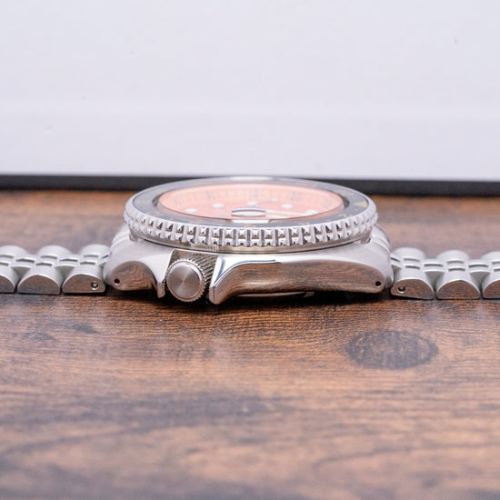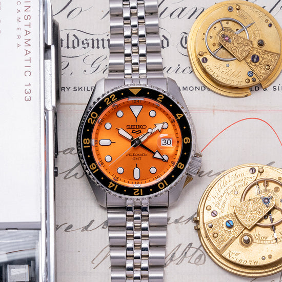 Here we have a 2022 Seiko 5 Sports Orange GMT Automatic SSK005K1 with a 42mm stainless steel case, this is the first GMT in the Seiko 5 Sports range and features polished and brushed surfaces that transition with crisp edges, and a lug-to-lug length of 46mm and a case thickness of 13.5mm give the watch an impressive wrist presence, Seiko gets their wrist ergonomics so right and you can expect a comfortable fit on your wrist. At 4 o’clock on the right side, a crown with deep knurling for extra grip is protected by crown guards. A Gold-tone 24-hour bezel with deep knurling for extra grip. A flat hardlex crystal sits above a vibrant orange sunburst dial, the 24-hour chapter ring is precisely printed with applied discs and rounded baton indexes marking the hours infilled with LumiBrite. At 3 o’clock a framed date window with cyclops magnification on the crystal. The Gold-toned hands coated in LumiBrite consist of an arrow and sword hand with a tapered sweeping second hand and a black arrow GMT hand. At 12 o’clock we have the Seiko motif and at 6 o’clock “Automatic GMT” completes this highly legible sports tool watch. On the reverse a screw-down exhibition case back and inside an automatic Seiko Cal. 4R34, 24 jewels, 21,600 beats per hour. This GMT movement was released in June 2022 and had hacking and hand-winding for your convenience, pull out the crown to the second position and rotate anti-clockwise to change the GMT hand in one-hour increments and clockwise to change the date. The watch comes fitted on a 22mm Seiko 5-link polished and brushed Jubilee stainless steel bracelet with a signed folding clasp and secure lock, all links are provided and comes with its Seiko presentation box, swing tag and paperwork.