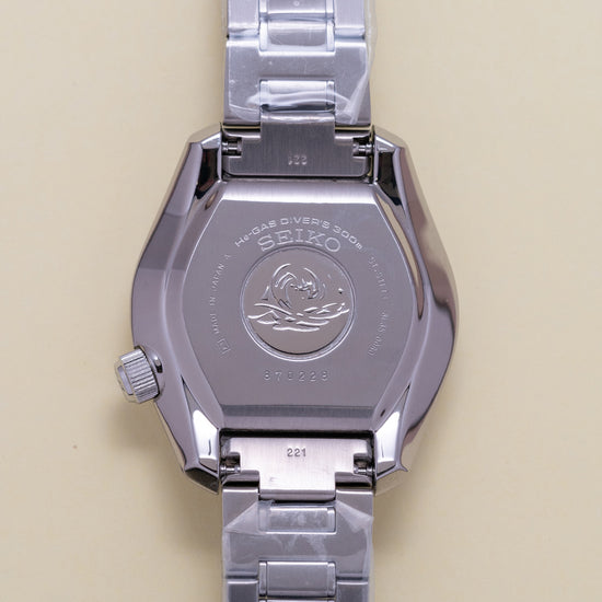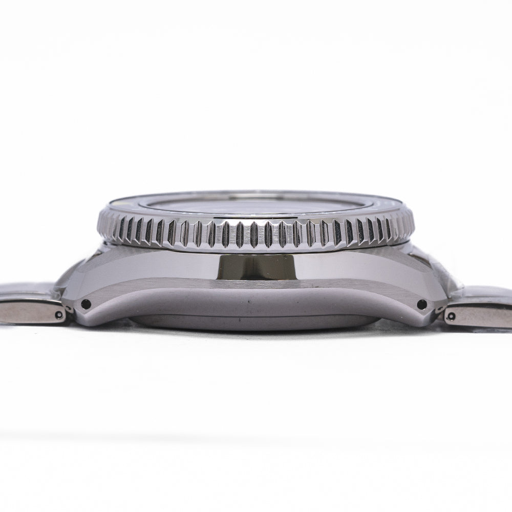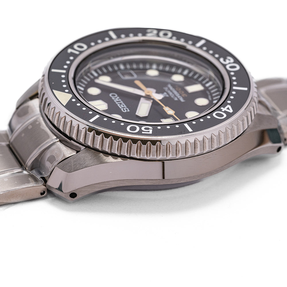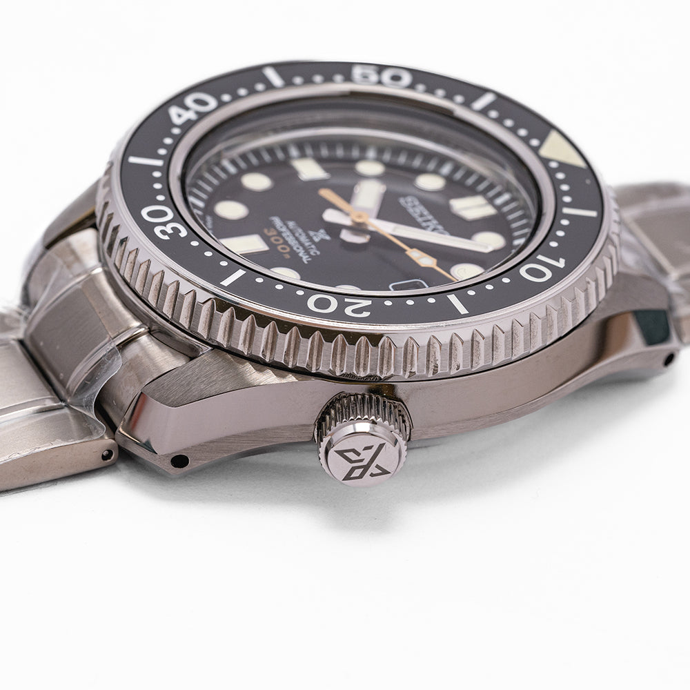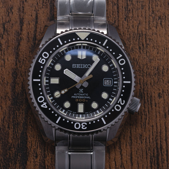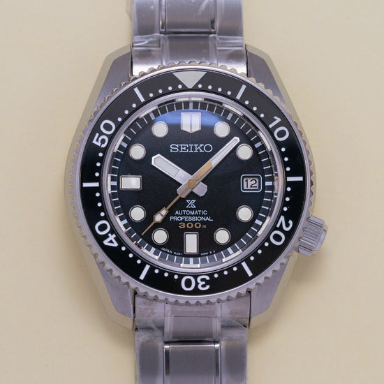Here we have a 2022 Seiko Marine Master Professional 300M SBDX023, a modern interpretation of Seiko's first "Professional" dive watches such as the famous 62MAS. A 43.5mm brushed and zaratsu polished stainless steel monobloc case coated in Seiko’s Diashield super-hard coating. To get to the movement you have to go in from the crystal side, the case shape sits on the wrist like a cushion, and Seiko gets ergonomics so right, and a lug-to-lug length of 50mm and a thickness of 15mm gives the watch an impressive wrist presence. Chamfered polished edges lead the eye towards the broad drilled lugs, on the right side at 4 o’clock a screw-down crown with the Prospex logo stamped into it. The unidirectional bezel has a black ceramic insert with a 60 minutes scale in white numbers and deep knurling for extra grip. A domed sapphire crystal AR coated on the inside sits above a matte black dial, an outer minute chapter ring surrounds the applied disc and baton indexes are outlined in stainless steel coated in LumiBrite to mark the hours. At 3 o’clock a framed date window, broad sword hands expertly brushed are coated in LumiBrite complemented by a lume-tipped gold-toned sweeping seconds hand and text is applied to the dial with a gold-toned 300m highlighting its impressive water resistance. On the reverse, an embossed Seiko Tsunami is in the centre, inside an automatic Seiko 8L35, 26 jewels, 28,800 beats per hour, the movement has hand winding and hacking functionality for your convenience, based on the Grand Seiko calibre 9S55 it is hand-assembled at the Shizuku-Ishi Watch Studio in Morioka. The watch comes fitted on a Seiko 20mm stainless steel brushed links and polished inner links bracelet with a signed fold clasp and a dive extension and is coated in Seiko’s Diashield which is scratch resistant plus a cut “crafter blue” strap and a Seiko rubber strap with a Seiko keeper and buckle, and the watch also comes with its Seiko presentation box and papers.