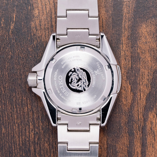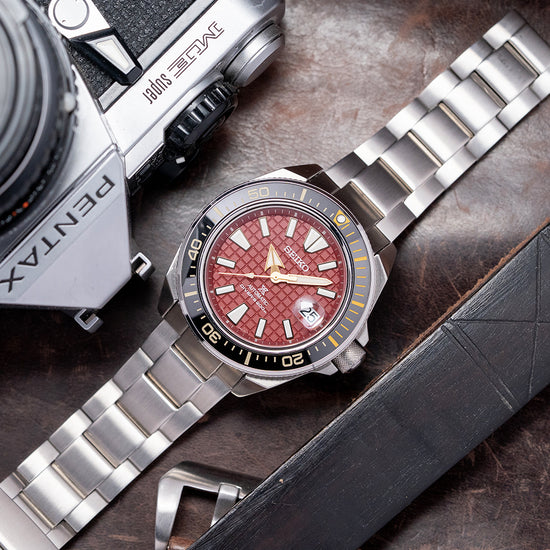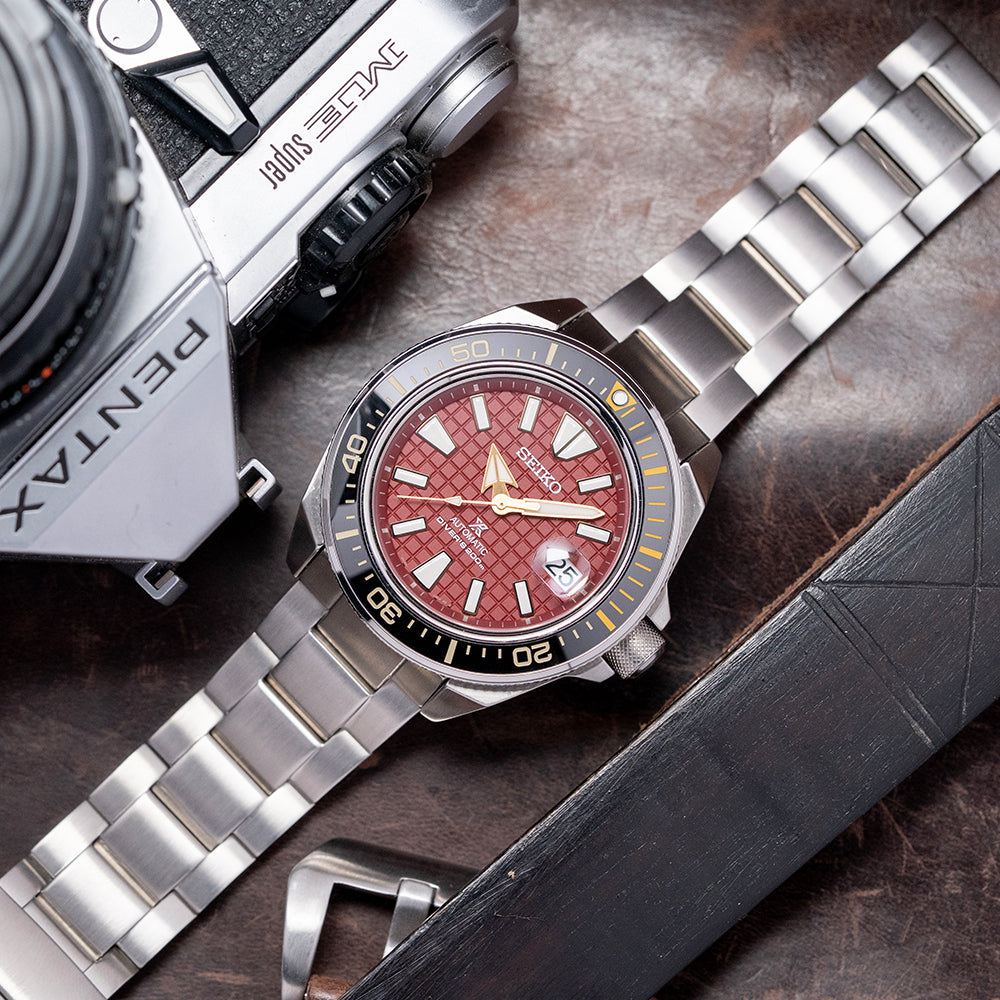 Here we have a 2022 Seiko Suigun “Samurai” Red SRPH61K1 Limited Edition of 3500 pieces. Taking its inspiration from the ancient Japanese naval forces called “Suigun”, the traditional armed forces on water. This 44mm brushed and polished stainless steel cushion case features the characteristic, aggressive angles and drilled lugs that curve over your wrist for a comfortable fit. Its curvaceous, polished flanks lead to a lug-to-lug length of 48mm and a case thickness of 13mm, giving the watch an impressive wrist presence. On the right side, a protected screw-down crown with knurling for extra grip. A unidirectional bezel features a diamond-patterned edge that is reminiscent of the handles of the Japanese sword. It has a black ceramic dive insert (with the first 15 minutes of the 60-minute scale highlighted in dark yellow). Protected by the dive bezel, its flat sapphire crystal is AR-coated on the inside above a stunning Red vermilion grid embossed dial that captures the deep Red vermilion of the coloured-lacquered armour worn by the “Suigun”. A red sloping outer minute chapter ring surrounds the applied gold-coloured trapezoidal and baton indexes filled in LumiBrite, marking the hours. At 3 o’clock, a date window with Cyclops magnification. The gold-coloured arrow hands are filled in LumiBrite and are complemented by a sweeping second hand. On the reverse, a screw-down case back with the details of the watch etched around a Seiko tsunami wave embossed in the centre, inside an automatic Seiko 4R35, 23 jewels, 21,600 beats per hour, this workhorse movement has hacking seconds, quick-set date and hand winding for your convenience. It comes paired with its original Seiko 22mm brushed 3-link stainless steel bracelet secured by a signed fliplock three-fold clasp and dive extension; all links are provided, plus an additional black silicon strap and signed pin buckle in the box. This watch is sold with its original Seiko box, swing tag and Seiko paperwork.