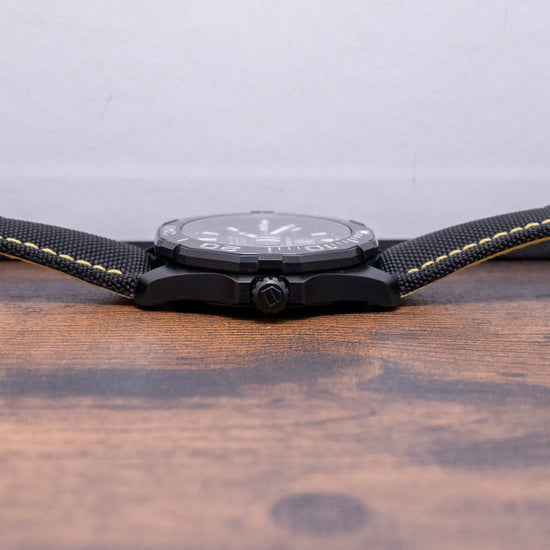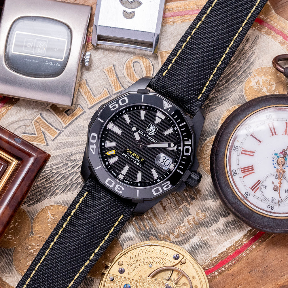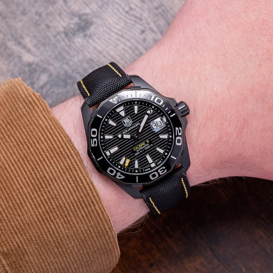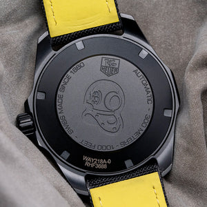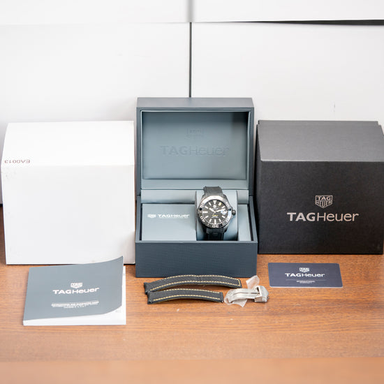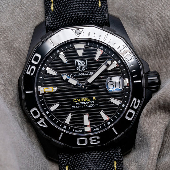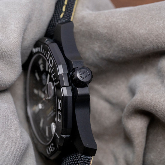 Here we have a 2022 TAG Heuer Aquaracer Automatic Black WAY218A-0 with a 41mm black carbide-coated stainless steel case that curves over your wrist with thick tapered lugs, a lug-to-lug length of 46.5mm and a case thickness of 11.5mm, giving the watch an impressive wrist presence. On the right side, we have a signed screw-down crown with deep knurling for extra grip and protection by crown guards. The multi-faceted unidirectional bezel has a black ceramic insert with a 60-minute dive scale. A flat sapphire crystal sits above a dynamic black dial with a horizontal striped pattern, an outer minute chapter ring surrounds applied trapezoid indexes filled with Super LumiNova marking the hours and at 3 o’clock a framed date window with cyclops magnification, steel sword hands filled with the same luminance complemented by a yellow counterbalance sweeping second hand. At 12 o’clock we have the TAG Heuer motif "Aquaracer" and at 6 o’clock a yellow "Calibre 5" "Automatic 300m/1000ft" completes this versatile sports dive watch. On the reverse, a screw-down case back with a dive helmet in the centre, inside an automatic TAG Heuer Cal. 5, a movement based on either ETA 2824-2 or Sellita SW200-1. It comes paired with its original TAG Heuer 20mm black and yellow stitched fabric strap with a signed push-button released folding clasp. The watch comes with its TAG Heuer presentation box and paperwork.