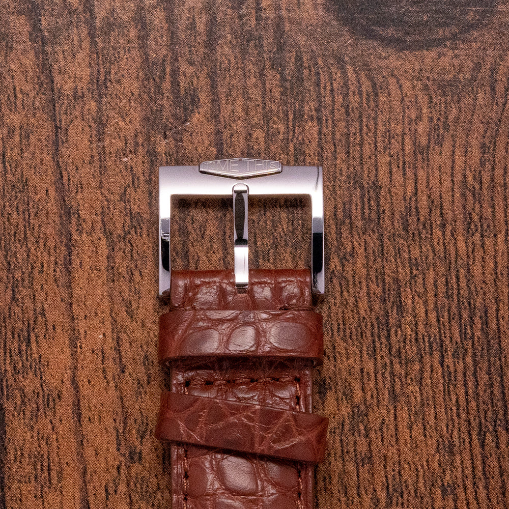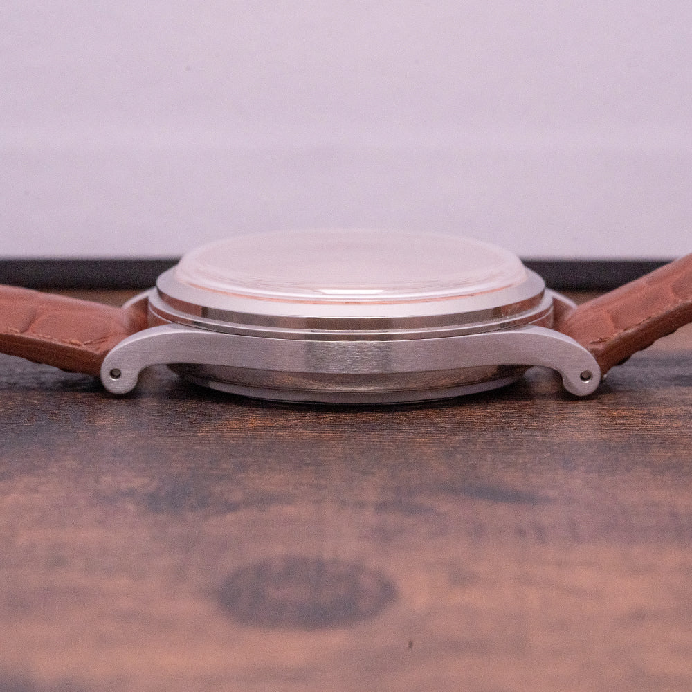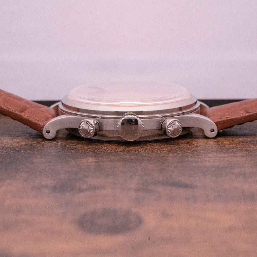 Here we have a 2022 Time This Salmon Dial Meca-Quartz Chrono with a 38mm polished and brushed stainless steel case that curves over your wrist with drilled tapered lugs. Taking its inspiration from the 1940s bi-compax chronographs, a lug-to-lug length of 46mm and a case thickness of 11.5mm ensures a comfortable fit. Down the right side, we have the piston-style chronograph pushers and in the centre a push/pull crown. A stepped polished smooth bezel holds a domed sapphire crystal above an attractive Salmon dial, an outer Tachymeter is precisely executed surrounding an inner minute track, applied polished steel Breguet numerals mark the hours, at 3 o’clock a 24-hour register and at 9 o’clock a small seconds register, each with a polished steel leaf hand, elegant polished leaf hands are complemented by a blue tapered chronograph hand, at 12 o’clock we have the Time This motif completing this vintage-inspired bicompax chronograph. On the reverse a screw-down case back, inside a Quartz Seiko Cal. VK64 is a mechanical quartz hybrid that has a tuning fork-type quartz crystal, you get the same kind of mechanical resistance when you engage the pushers and a satisfying snap back of the chronograph seconds hand on reset. The watch comes paired with its original quick-release 20mm strap with a pin buckle; inside the box, there are an additional two leather straps, and the watch comes with its Time This presentation box and paperwork.