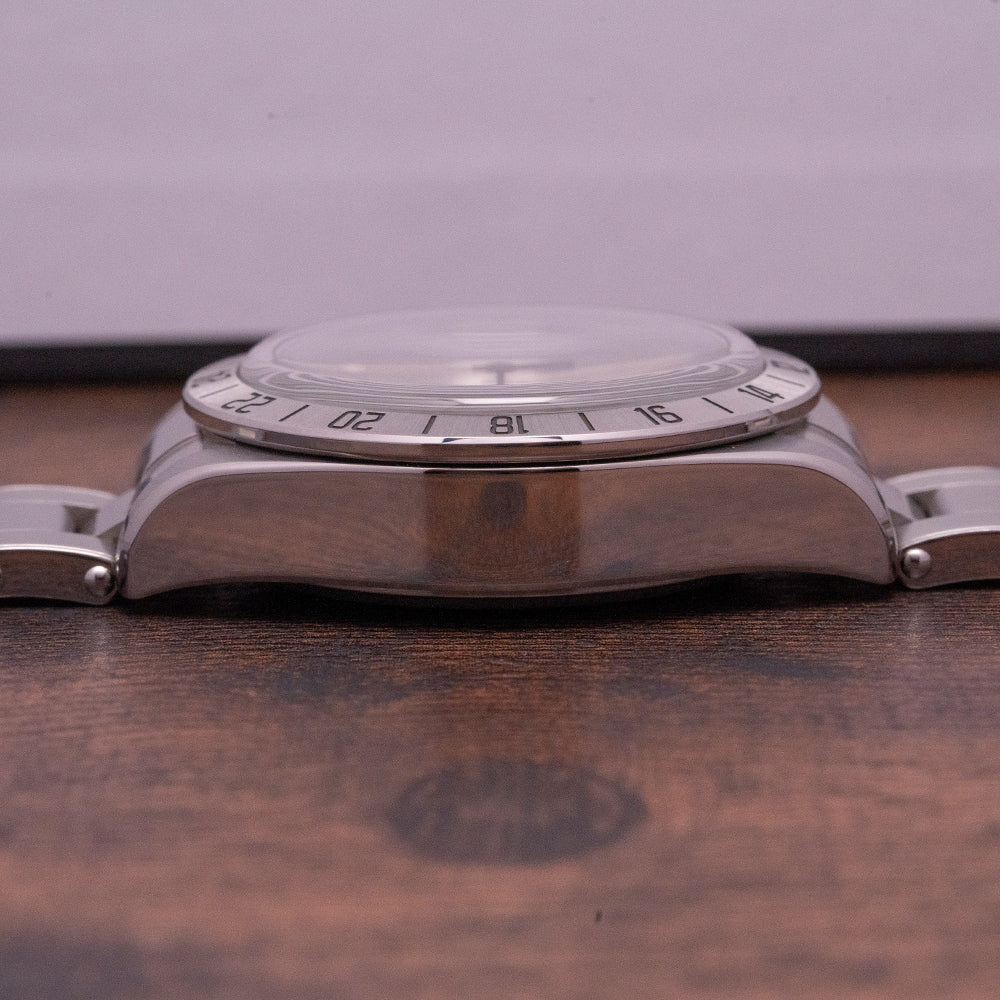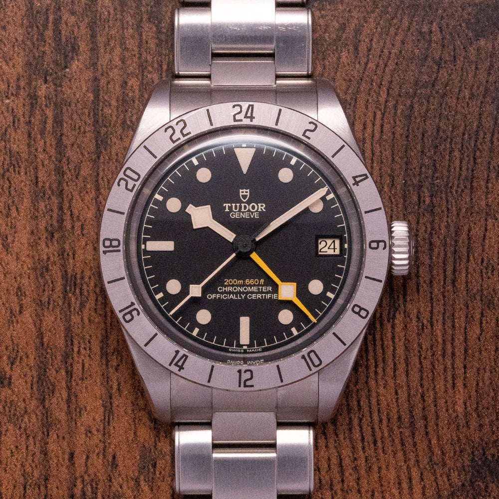 Here we have a 2022 Tudor Black Bay Pro GMT 79470 that has all the styling and finesse of the Rolex Explorer II Ref. 1655 with a polished and satin-brushed 39mm stainless steel case, a polished bevel edge that leads the eye toward tapered lugs with a lug-to-lug length of 47.5mm and a case thickness of 14.5mm giving the watch an impressive wrist presence. On the right side, is a signed screw-down crown with the Tudor rose in relief. A fixed stainless steel bezel has a 24-hour scale engraved into it and infilled in black making it highly legible. A domed sapphire crystal sits above a slightly domed matte black dial, an outer minute track is precisely executed with lume pips at the hour mark, and applied discs and baton indexes are made of monobloc luminous ceramic to mark the hours, at 3 o’clock a date window. The snowflake hands coated in luminance are complemented by a counterweighted sweeping second hand and a yellow GMT hand. At 12 o’clock we have the Tudor motif and at 6 o’clock the water resistance in yellow and “Chronometer Officially Certified” are printed underneath completing this practical sports tool watch, a watch that is suitable for the avid adventurer and traveller. On the reverse, is a screw-down coin-edged case back, inside an automatic Tudor Cal. MT5652, 26 jewels, 28,800 beats per hour COSC Certified movement, first introduced at BaselWorld in 2018 it is their first in-house GMT movement, with a bi-directional rotor for efficiency and hacking and hand-winding for your convenience. The watch comes fitted on its original Tudor 20mm brushed and polished stainless steel simulated rivet style bracelet that uses screws to remove the links, a signed deployment safety T-clasp with a glide lock system for adjustments on the fly and a clamshell lock, all links are provided and the watch comes with its Tudor presentation box, swing tag and paperwork.