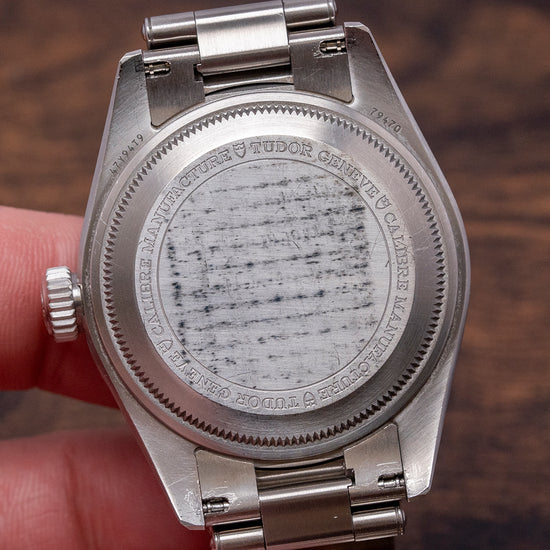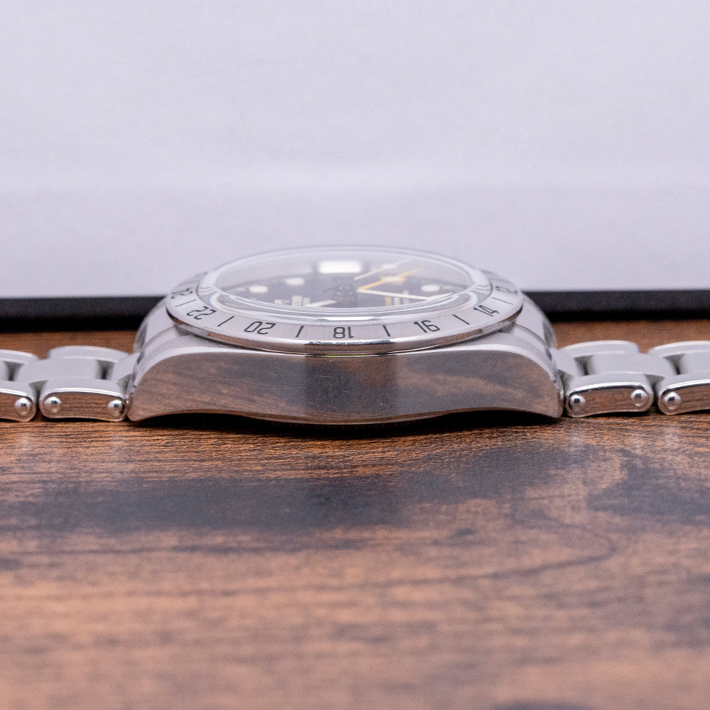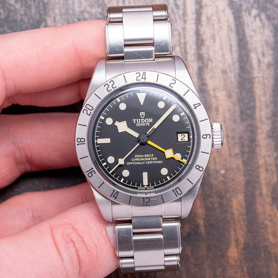 Here we have a 2022 Tudor Black Bay Pro GMT 79470 on its Tudor bracelet plus an additional Tudor strap that has all the styling and finesse of the Rolex Explorer II Ref. 1655 with a polished and satin-brushed 39mm stainless steel case, a polished bevel edge that leads the eye toward tapered lugs with a lug-to-lug length of 47.5mm and a case thickness of 14.5mm giving the watch an impressive wrist presence. On the right side is a signed screw-down crown with the Tudor rose in relief. A fixed stainless steel bezel has a 24-hour scale engraved into it and is filled in black, making it highly legible. A domed sapphire crystal sits above a slightly domed matte black dial, an outer minute track is precisely executed with lume pips at the hour mark, and applied discs and baton indexes are made of monobloc luminous ceramic to mark the hours at 3 o’clock, a date window. The snowflake hands coated in luminance are complemented by a counterweighted sweeping second hand and a yellow GMT hand. At 12 o’clock, we have the Tudor motif. At 6 o’clock, the water resistance in yellow and “Chronometer Officially Certified” are printed underneath, completing this practical sports tool watch. This watch is suitable for the avid adventurer and traveller. On the reverse is a screw-down coin-edged case back inside an automatic Tudor Cal. MT5652, 26 jewels, 28,800 beats per hour COSC Certified movement, first introduced at BaselWorld in 2018; it is their first in-house GMT movement, with a bi-directional rotor for efficiency and hacking and hand-winding for your convenience. The watch comes fitted on its original Tudor 20mm brushed and polished stainless steel simulated rivet style bracelet that uses screws to remove the links, a signed deployment safety T-clasp with a glide lock system for adjustments on the fly and a clamshell lock, and will fit up to a 7.2-inch wrist, plus an additional 20mm Tudor strap in the box and the watch comes with its Tudor presentation box, swing tag and paperwork.