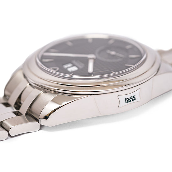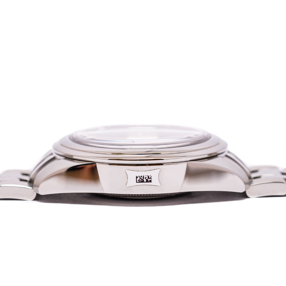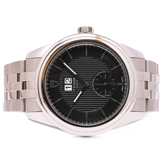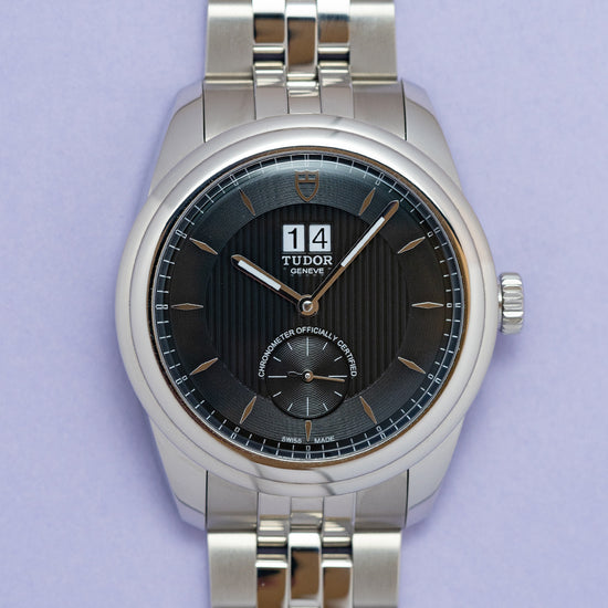 Here we have a 2022 Tudor Glamour Double Date Chronometer 57100 part of their Tudor 1926 line of watches that takes a contemporary look back at their heritage and the designs first registered by Hans Wilsdorf at the beginning of Tudor from 1926 onwards. Highly polished 42mm stainless steel case, the gentle curve of the case leads to finely tapered lugs with a lug-to-lug length of 50mm and a case thickness of 13.5mm ensuring a comfortable fit on your wrist. On the right side, is a signed screw-down crown. The double-stepped smooth polished bezel holds a domed sapphire crystal above a striking black sector-style dial, the outer minute track is precisely executed surrounding a raised sunburst concentric circular ring with applied Rhodium-plated diamond-shaped indexes marking the hours, the centre has an attractive vertical stripe patternation with a double date window at 12 o’clock, a recessed sub-second at 6 o’clock complete with a white teardrop counterweighted hand. Slender sword hands infilled with SuperLumiNova luminance complete this elegant contemporary dress watch. At 12 o’clock we have the Tudor motif with Tudor Geneve printed underneath the double date and a crescent of “Chronometer Officially Certified” over the sub-seconds. On the reverse, a screw-down sapphire crystal exhibition case back, showcasing an automatic Tudor Cal. MT5641, 32 jewels, beating at 28,800 beats per hour, this COSC Certified movement was developed by Tudor in 2018 specifically for this Glamour Double date model and is the first to have this particular configuration. The bi-directional skeletonised rotor is finished with satin-brushing and sandblasting with alternating polishing across the movement; it has quick-set date and hacking for your convenience. The watch comes paired with its original 22mm Tudor 5-link polished and brushed stainless steel bracelet with a signed folding deployment clasp and safety clasp and the watch comes with its Tudor presentation box and paperwork.