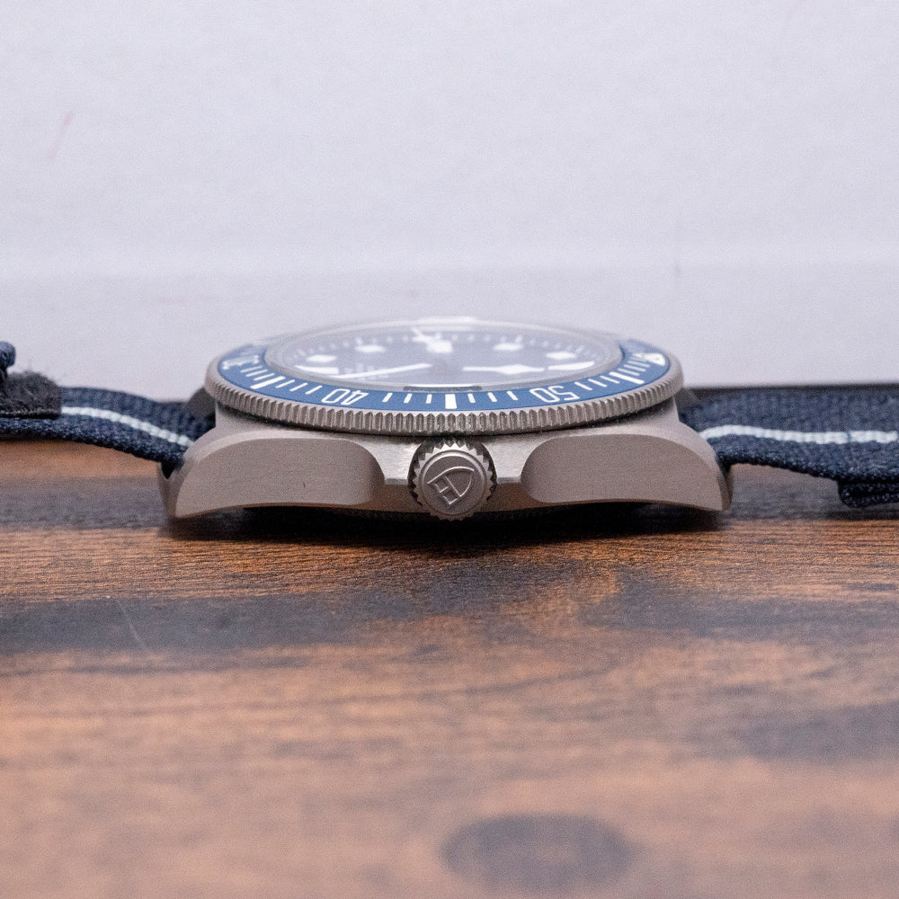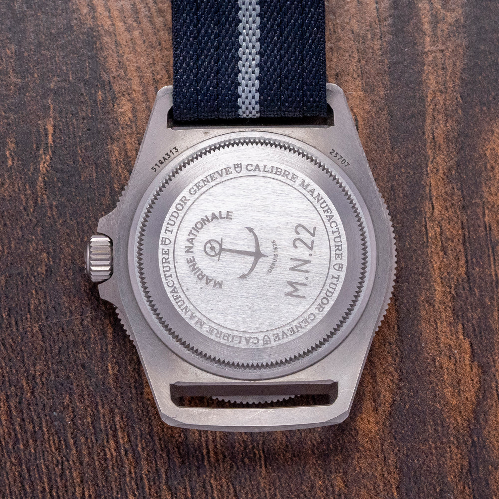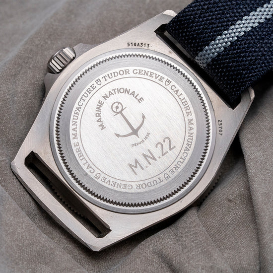 Here we have a rare 2022 Tudor Pelagos FXD Blue MN22 25707B/22 with a 42mm satin-brushed Titanium case; this watch revives a historic collaboration with the French Navy. Tudor has been an official supplier to the Marine Nationale, French Navy, since the 1950s; this design was specifically created as a tool to aid underwater navigation. The Pelagos name is Ancient Greek for ‘open or deep sea’, and FXD refers to the fixed strap bars of the case. The case curves in all the right places with a lug-to-lug length of 49.5mm and a case thickness of 12.5mm, giving the watch an impressive wrist presence; on the right side is a screw-down crown with the Tudor shield protected by crown guards. The bidirectional Titanium bezel has deep knurling for extra grip and a matte blue ceramic 60-minute scale engraved into it; the flat sapphire crystal sits almost flush above a striking matte navy blue dial. An outer minute chapter ring encircles the applied squares and baton indexes coated in SuperLumiNova, the characteristic Snowflake hands are coated in the same luminescence, and at 12 o’clock, we have the Tudor motif and at 6 o’clock, “Pelagos” with “Chronometer Officially Certified” 200m/660ft. On the reverse, a screw-down coin-edged case back with the Marine Nationale anchor and M.N. 22 engraved in the centre inside the in-house automatic Tudor Cal. MT5602, 25 jewels, 28,800 beats per hour, COSC certified the MT stands for "Manufacture Tudor". The movement has hacking, a bidirectional rotor and a non-magnetic silicon balance spring. It comes paired with its original 22mm Tudor 22mm single-piece navy blue woven ribbon strap with Titanium hardware. Inside the box, we have an additional 22mm Tudor navy blue NATO strap; the watch also comes with its Tudor presentation box, swing tag and papers.