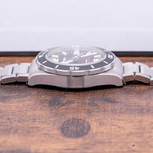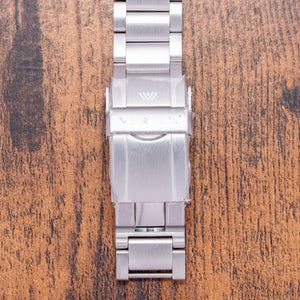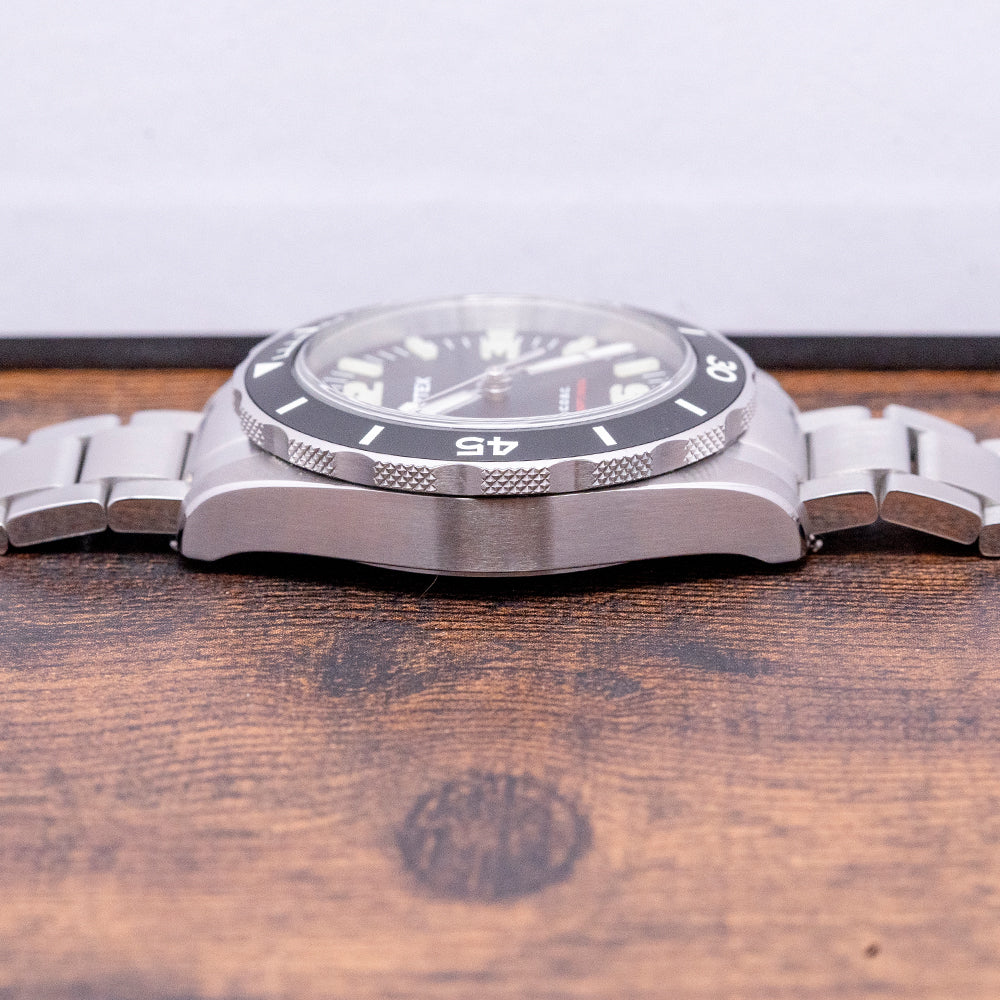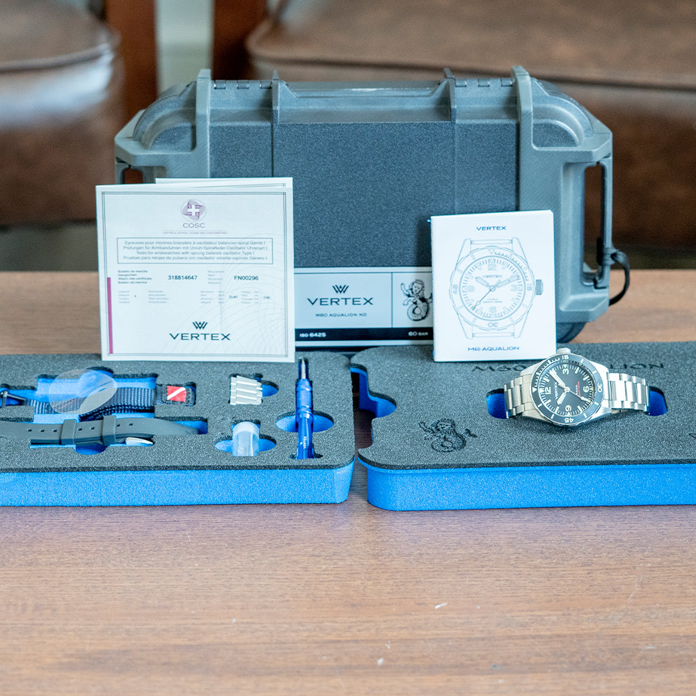 Here we have a 2022 Vertex M60 AquaLion No-Date on a Bracelet with a brushed 40mm stainless steel case that curves over your wrist with thick tapered lugs. Don has taken his inspiration from the Vertex dive watches of the 1950s and 60s and given them a more contemporary look and feel, using modern materials and technology, and a lug-to-lug length of 49mm and a case thickness of 14mm to give the watch an impressive wrist presence. A signed screw-down crown with knurling for extra grip is on the right side. The watch has undergone rigorous tests to achieve ISO 6425 certification, which is no mean feat for any watch manufacturer; it shows Vertex will go the extra mile to produce a tool watch worthy of that accreditation. A rotating dive bezel has a matte black ceramic insert, the first 15 minutes highlighted, all coated in Super-LumiNova Grade X1, holding a domed sapphire crystal above a matte black dial. An outer minute track has the characteristic moulded Super-LumiNova X1 batons and 12, 3, 6 and 9-hour markers as seen on the M100 series; steel sword hands are infilled in Super-LumiNova X1 and complemented by a tapered sweeping second-hand. At noon, we have the Vertex motif, and at 6 o’clock, “C.O.S.C. 2000 FT/600 M” in red, complete this versatile dive tool watch with all the right credentials for any professional diver or adventurous skin diver. On the reverse, a screw-down case back with an engraved AquaLion Trademark in the centre, inside an automatic Sellita SW300-1, 25 jewels, beating at 28,800 beats per hour, COSC Certified, this workhorse movement has hacking seconds and hand winding for your convenience. The watch comes paired with its 20mm fitted Vertex quick-release brushed stainless steel bracelet with a signed deployment clasp with flip lock; all links are provided, plus an additional fitted 20mm Vertex rubber strap and 20mm Vertex Zulu-style NATO strap with a pin buckle. The watch comes with its Vertex Peli Case, accessories and paperwork.