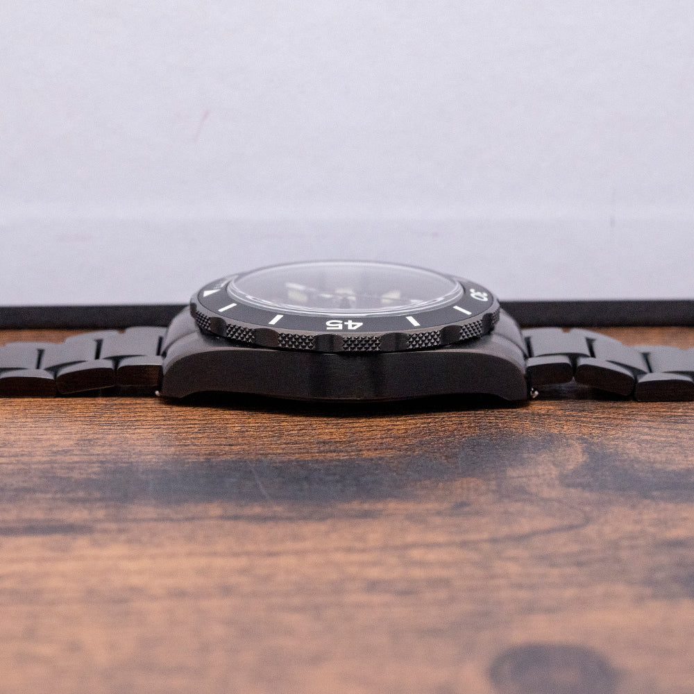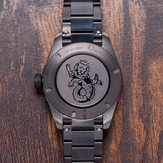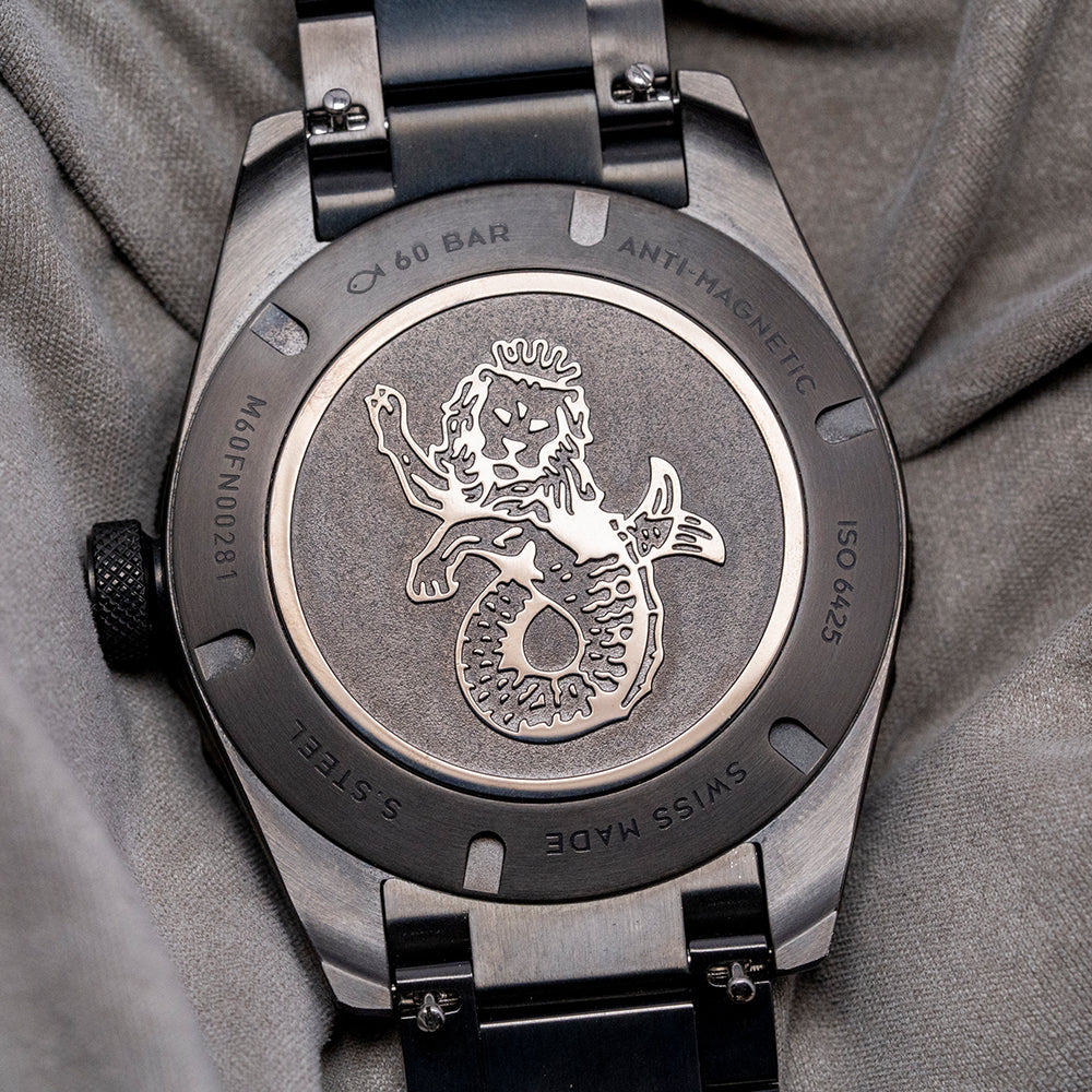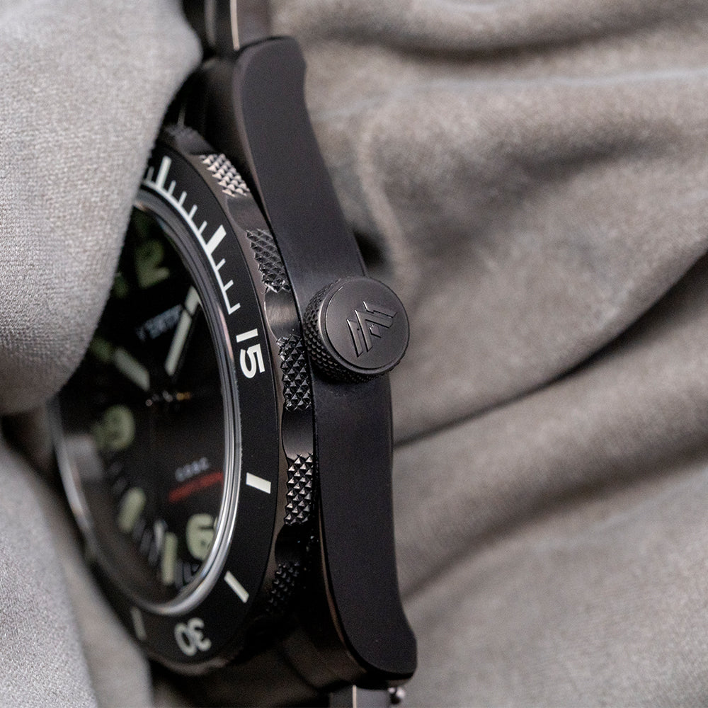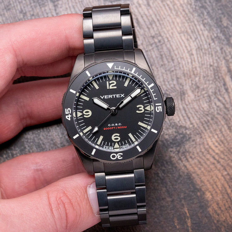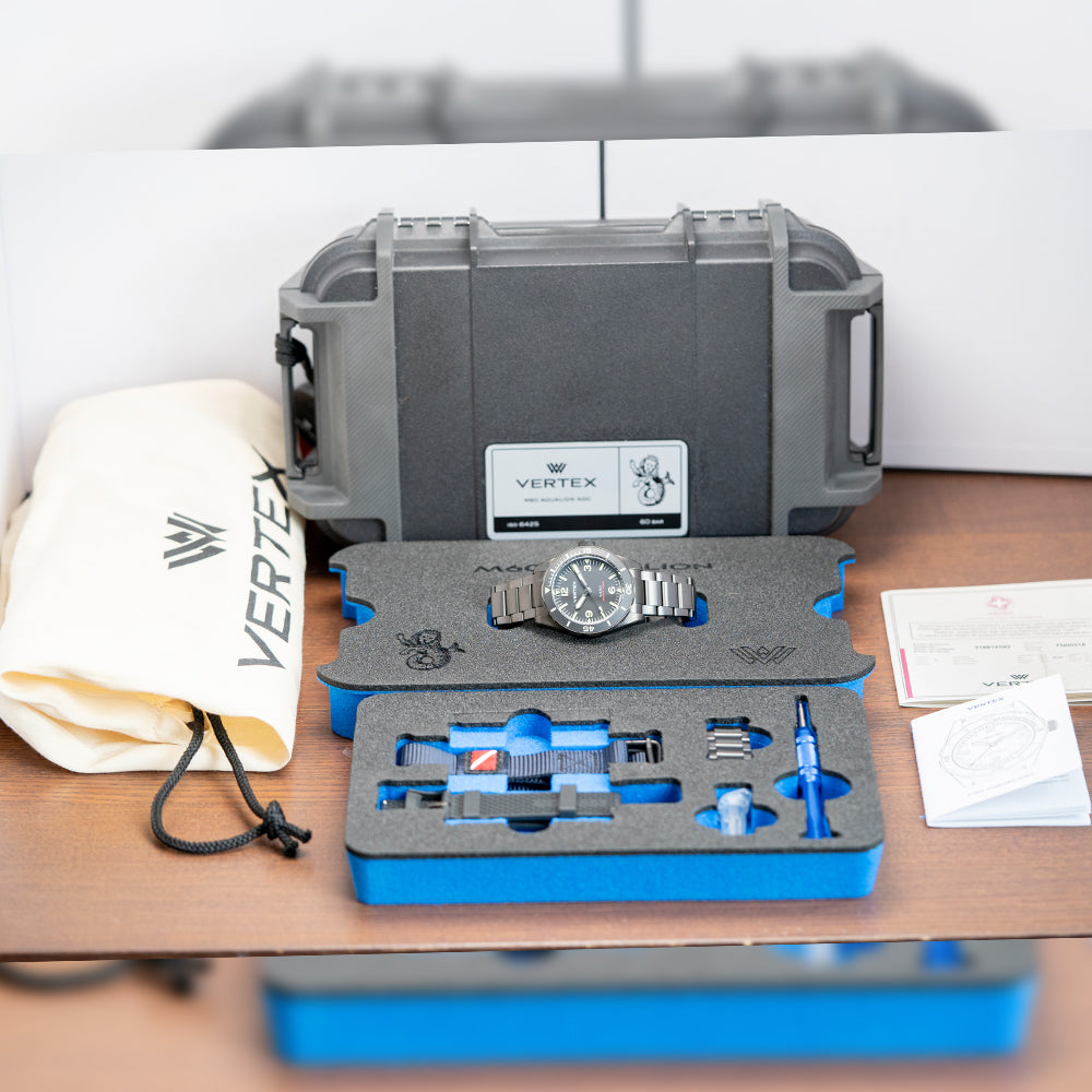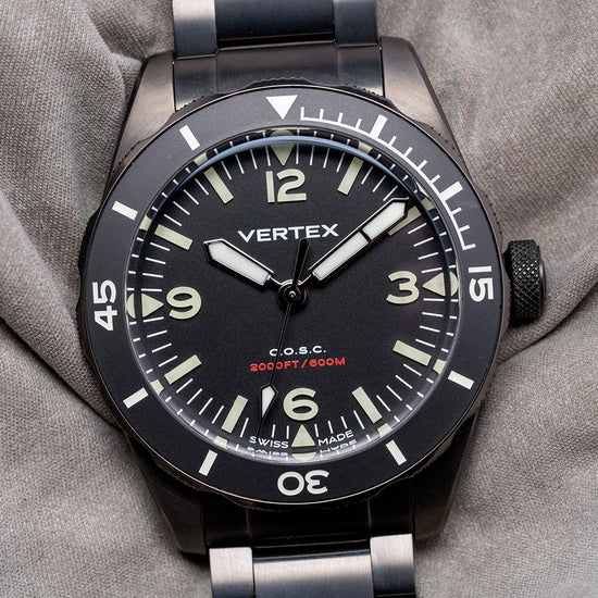 Here we have a 2022 Vertex M60C AquaLion No-Date, the C stands for Covert, with a brushed 40mm Black DLC (Diamond-like Carbon) stainless steel case for that stealthy aesthetic, that curves over your wrist with thick tapered lugs, Don has taken his inspiration from the Vertex dive watches of the 1950s and 60s and given them a more contemporary look and feel, using modern materials and technology, and a lug-to-lug length of 49mm and a case thickness of 14mm give the watch an impressive wrist presence. On the right side is a signed screw-down crown with knurling for extra grip. The watch has undergone rigorous tests to achieve ISO 6425 certification, which is no mean feat for any watch manufacturer, it shows Vertex will go the extra mile to produce a tool watch worthy of that accreditation. A rotating dive bezel has a matte black ceramic insert, the first 15 minutes highlighted, all coated in Super-LumiNova Grade X1, holding a domed sapphire crystal above a matte black dial. An outer minute track has the characteristic moulded Super-LumiNova X1 batons, and 12, 3, 6 and 9-hour markers as seen on the M100 series, steel sword hands are infilled in Super-LumiNova X1 and complemented by a tapered sweeping second-hand. At noon, we have the Vertex motif, and at 6 o’clock, “C.O.S.C. 2000 FT/600 M” in red, complete this versatile dive tool watch with all the right credentials for any professional diver or adventurous skin diver. On the reverse, a screw-down case back with an engraved AquaLion Trademark in the centre, inside an automatic Sellita SW300-1, 25 jewels, beating at 28,800 beats per hour, COSC Certified, this workhorse movement has hacking seconds and hand winding for your convenience. The watch comes paired with its 20mm fitted Vertex quick-release brushed Black DLC (Diamond-like Carbon) stainless steel bracelet with a signed deployment clasp with fliplock, all links are provided, plus an additional two 20mm Vertex straps. The watch comes with its Vertex Peli Case, accessories and paperwork.