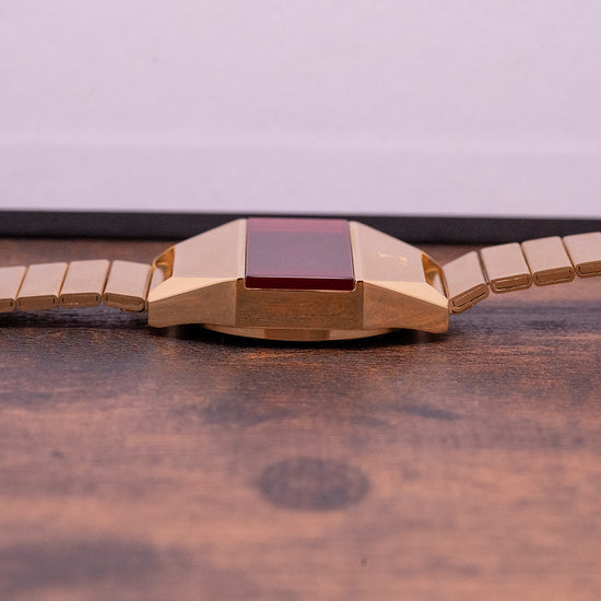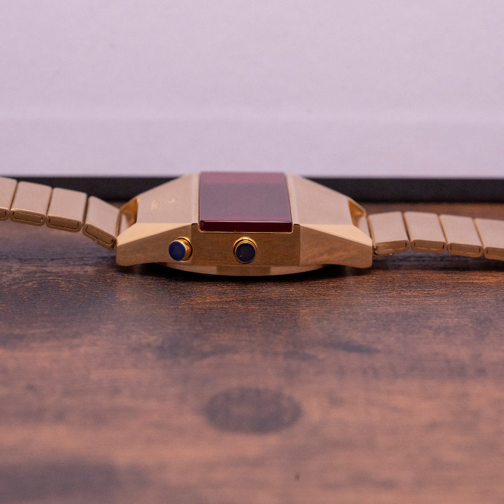 Here we have a 2022 Yema LED Yellow Gold Plated Retro YMHF1575-1 AM, a retro reissue of a watch introduced by Yema in the 1970s at a time when the Quartz revolution turned the world's watchmaking industry upside down. The futuristic design is a 3D reproduction of the original, at 37.5mm in yellow gold plated, its barrel shape sits flat on the wrist with stubby lugs, and a lug-to-lug length of 42.5mm and a case thickness of 10.5mm ensures a comfortable fit. Down the right side, we have the Quartz pushers, polished flanks and brushed faceted top surfaces that add interest as you rotate your wrist. A red mineral LED display remains on stand-by, only shown when you press the 3 o'clock pusher once to show the time to save the battery, a second push will show the current date, and a third push will display the seconds. The watch is set using the 4 o'clock pusher. Deeply engraved in the lower half of the case we have the Yema motif. On the reverse a screw-down stainless steel case back engraved with the details of the watch and the Yema crest in the centre, inside a LED-Quartz movement. The watch comes paired with its Yema 20mm brushed Yellow Gold plated bracelet and signed sliding folding clasp with all links present, this watch is sold with its original Yema signed case and paperwork.