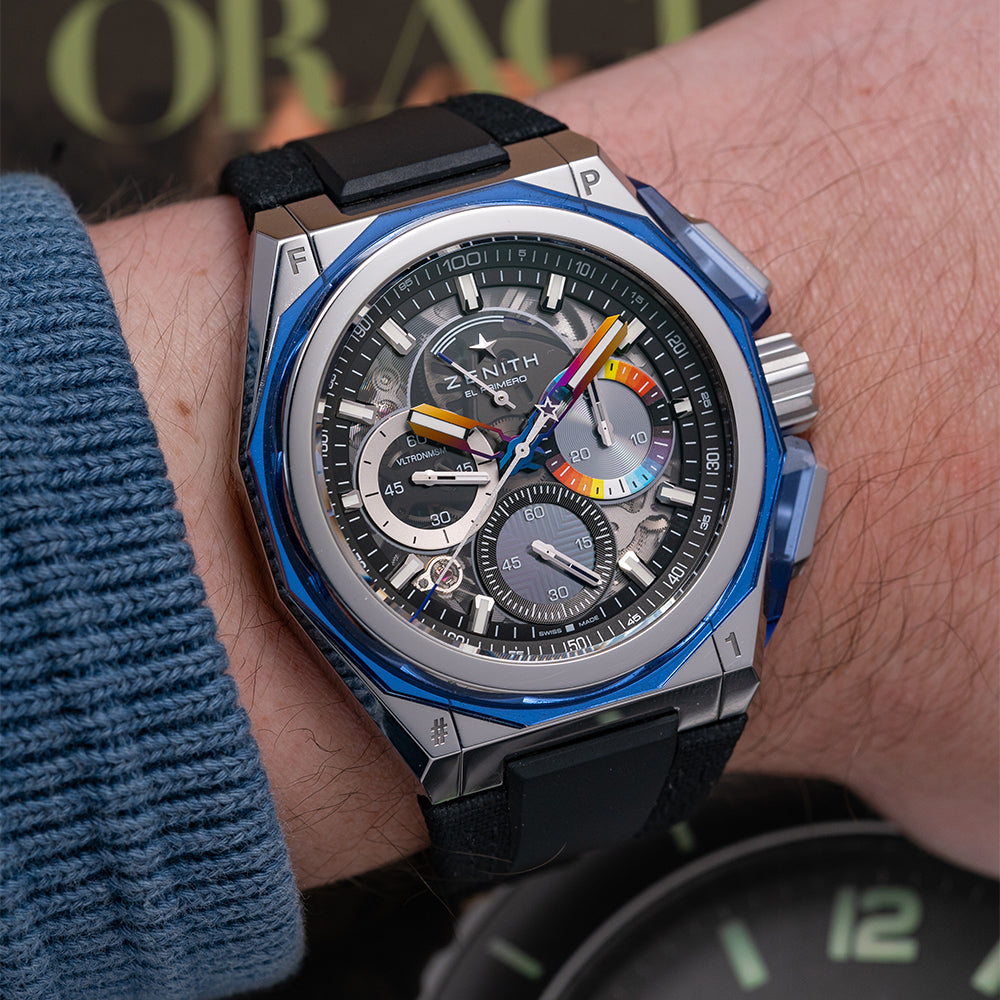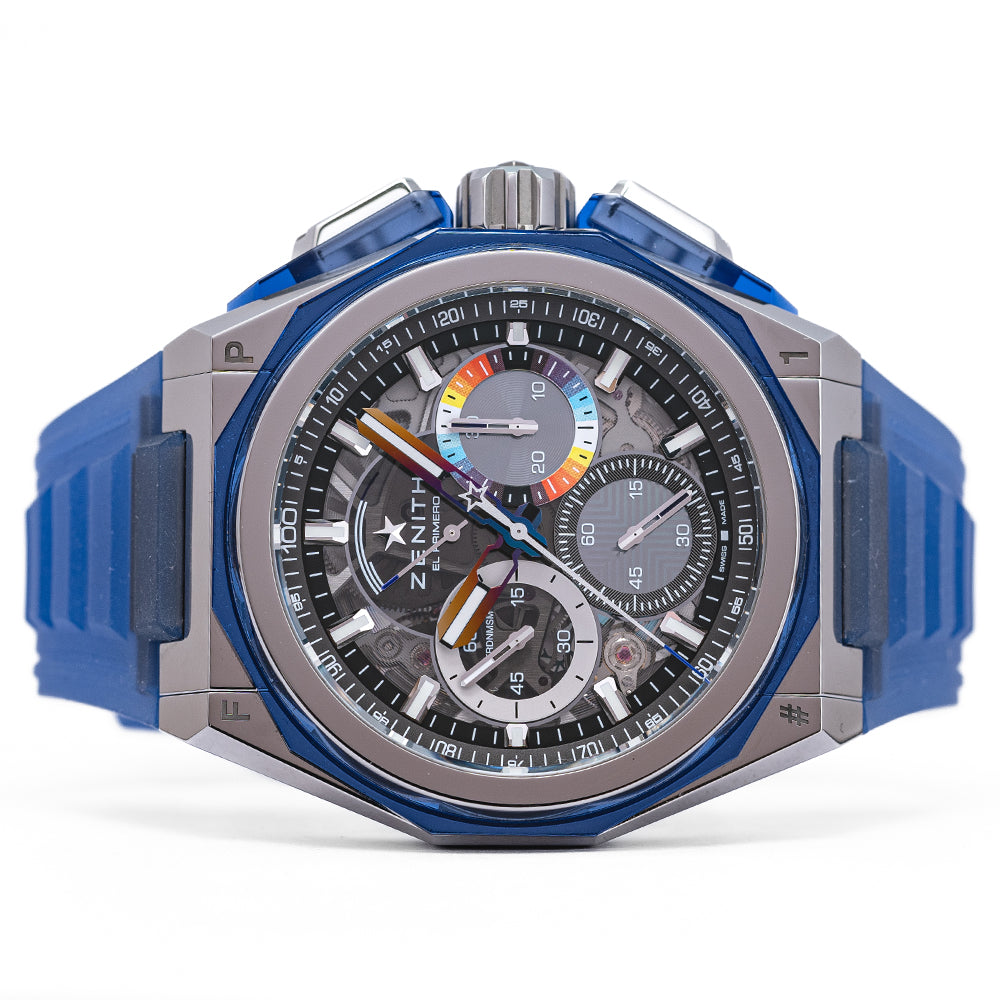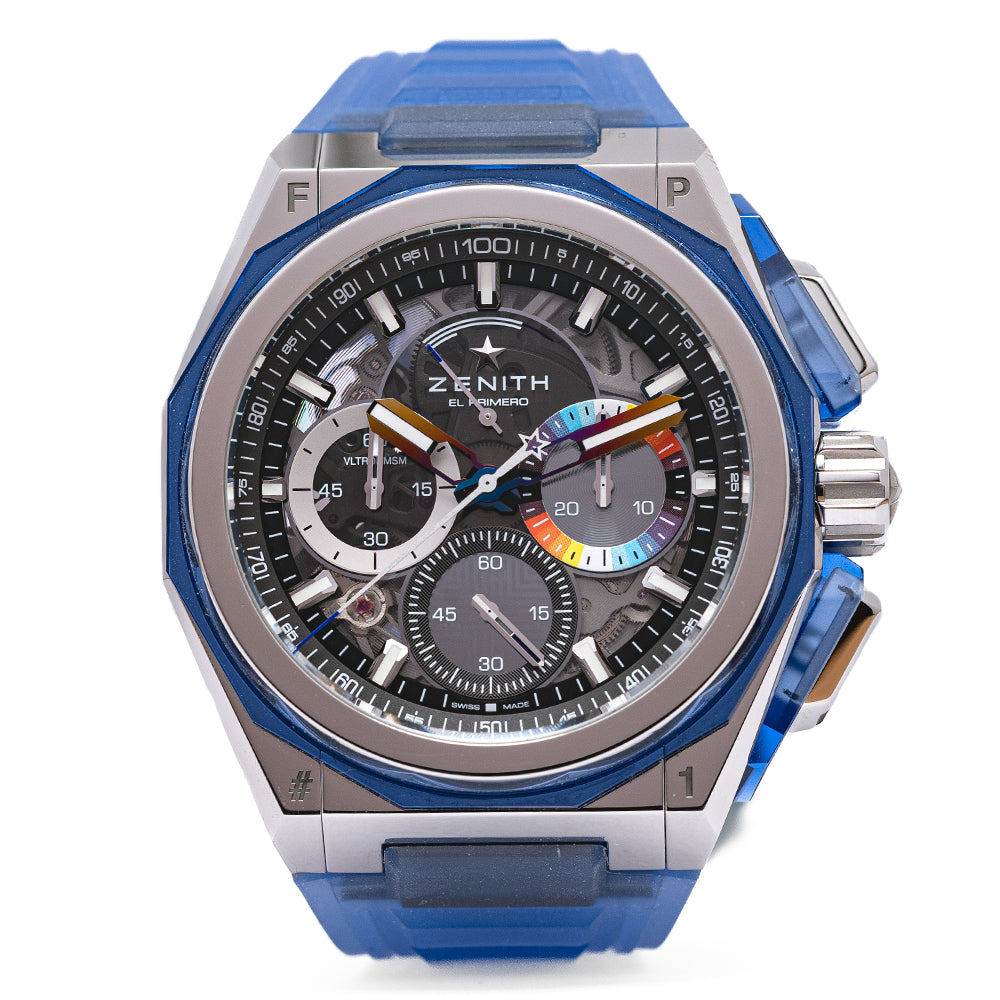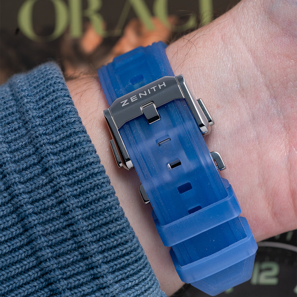 This watch is sold with its original Zenith box and paperwork. The watch comes paired with its Zenith original fitted on an integrated quick-release transparent blue rubber strap, included in the box is a fully polished steel bracelet, a black Velcro strap, a set of Zenith white gloves, and a Zenith double folding clasp. The watch is from November 2022 and is in fantastic condition, worn a handful of times at most. The watch comes with its Manufacturer's Warranty.