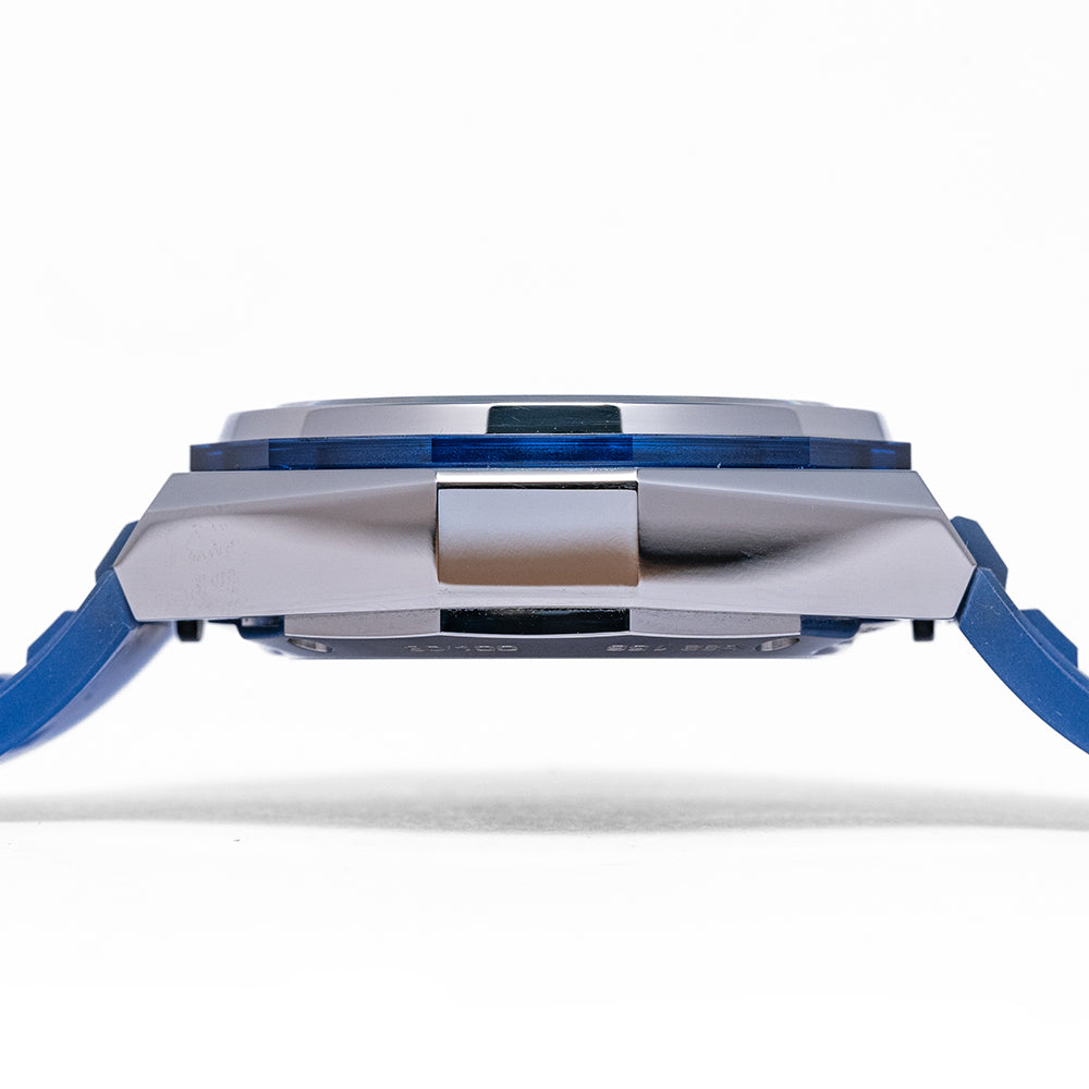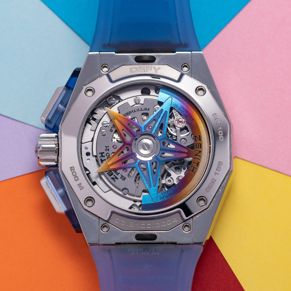 Here we have a 2022 Zenith Defy Extreme Felipe Pantone Edition limited to 100 pieces and made in collaboration with optical artist Felipe Pantone an Argentinian-Spanish artist based in Spain who uses software to create a combination of prisms of neon colour gradients, geometric shapes, optical patterns, and jagged grids which he makes into frescoes, murals, paintings, and sculptures. The 45mm case is made from polished Stainless Steel & transparent Blue YAS, a crystalline glass similar to synthetic sapphire. Angular bevel-edged sides lead to stubby straight-ended lugs, a lug-to-lug length of 50.5mm and a case thickness of 15mm give the watch an impressive wrist presence. Down the right side, we have the angular chronograph pushers embedded in transparent Blue YAS, and in the centre a signed screw-down crown with deep knurling for extra grip. The top of the case has engraved FP#1 in each corner, shorthand for “Felipe Pantone El Primero”, and a moulded twelve-sided transparent Blue YAS plinth holds a smooth brushed and polished bezel holding a flat sapphire crystal above a stunning Felipe Pantone signature chromatic Iridescent PVD sapphire, micro-engraved skeletonised dial. An outer 1/100th of a second chapter ring surrounds applied baton hour markers coated in Super-LumiNova, at 3 o’clock a 30-minute register with a rainbow-coloured ring and concentric circle centre, at 6 o'clock a 60-seconds and 1/10th of a second register with a black ring and geometric pattern in the centre and finally at 9 o’clock a continuous second register with a white ring and transparent centre. Baton's hands are made using 3D PVD for that rainbow metallic effect infilled with Super-LumiNova, a white chronograph hand and a star counterweight that spins one complete rotation each second. At 12 o’clock we have the power reserve indicator and the Zenith El Primero motif completing this mesmerising and dynamic chronograph that plays with the light in an illusionary way. On the reverse, a screwed-down exhibition sapphire case back with Defy and its number out of 100 engraved around its edge, inside an automatic Zenith El Primero 21 1/100th, 53 jewels, first introduced in 2017 at BaselWorld, it has two escapements one for timekeeping and one for the chronograph beating at 36,000 beats per hour. The star rotor is 3D PVD coated for that iridescent effect and chronometer ISO3159 Certified by TIMELAB at the Geneva Laboratory of Horology and Microengineering, this incredible movement was designed by Guy Semon the head engineer at TAG HEUER who are part of the same LVMH group. The watch comes fitted on an integrated quick-release transparent blue rubber strap, included in the box is a fully polished steel bracelet, a black Velcro strap, and a set of Zenith white gloves. The watch comes with its Zenith presentation box in the form of a book, a unique Felipe Pantone-designed transparent plexiglass hardcover with its "Planned Iridescence" series iridescent design.