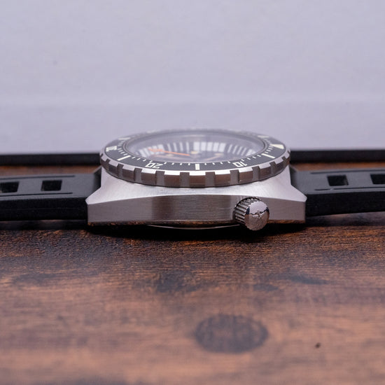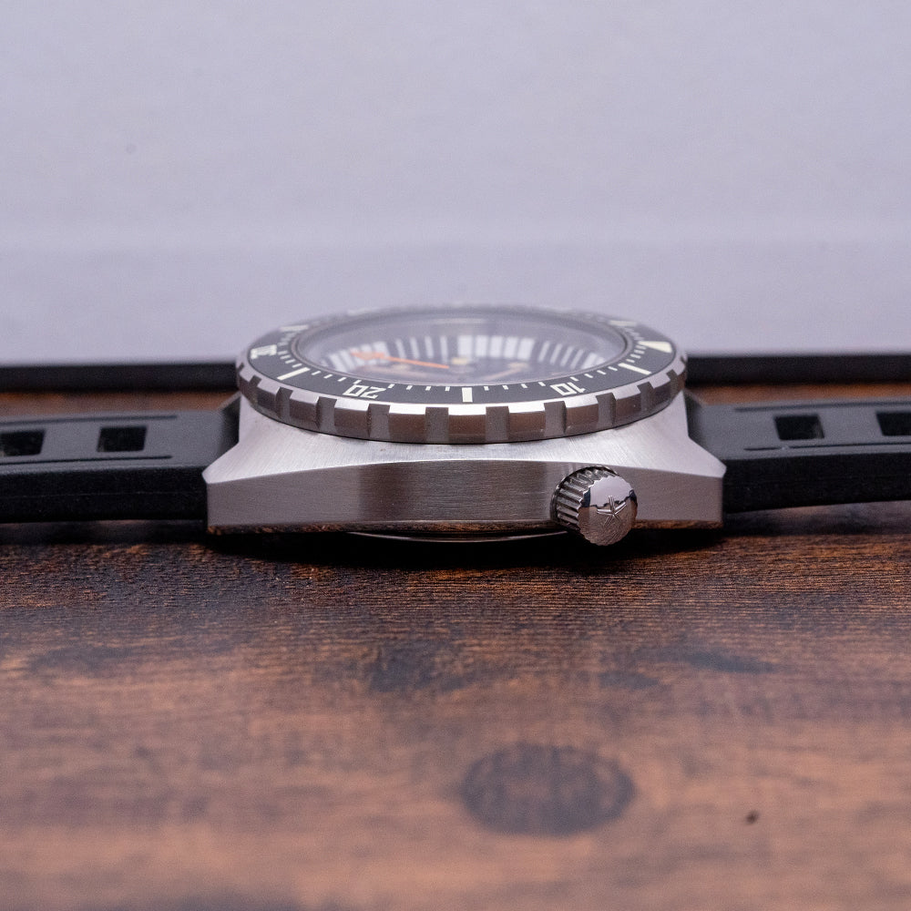 Here we have a 2023 Aquastar Benthos H1 Limited Edition of 197/500 pieces, a modern tribute to their original 1970 dive watch, the Benthos 500, which was designed to withstand the pressures at a depth of 500m and was the first non-monobloc cased professional dive watch to have a 500m depth rating, named after the Greek word meaning “Bottom of the Sea”. The dimensions of this watch match those of the original at 42mm brushed and polished 904L stainless steel Tonneau-shaped case curves over your wrist with flat-ended tapered lugs, and a lug-to-lug length of 47mm and a case thickness of 16mm give the watch an impressive wrist presence. On the right side at 2 o’clock is a large screw-down crown. The unidirectional 120-click steel bezel has deep knurling for grip and a ceramic 60-minute scale insert holding a thick, flat sapphire crystal AR triple-coated above a black semi-gloss dial. A distinctive outer minute chapter ring surrounds square and baton indexes coated in “old light Radium” SuperLumiNova for that vintage aesthetic; an orange arrow pointed second-hand complements baton hands filled with the same “old light Radium” SuperLumiNova, at noon we have the Aquastar Suisse motif and at 6 o’clock “Benthos H1” complete this faithful recreation of a classic dive watch. On the reverse is a screw-down case back with the Suisse Aquastar in the middle, inside an automatic ETA Cal. ETA 2824-2, 25 jewels, beating at 28,800 beats per hour, this quality workhorse movement has hand winding and hacking seconds for your convenience. The watch comes paired with its 20mm ISOfrane rubber strap with a steel pin buckle. This watch is sold with its original Aquastar tube and paperwork, plus a signed copy of Depth Charge by Jason Heaton, a scuba-diving adventure thriller.