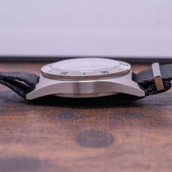 This watch is sold with its original Aquastar box and paperwork. The watch comes paired with its 19mm Aquastar seatbelt NATO strap with a signed pin buckle. The watch is from June 2023 and is sold in worn condition, but overall very fair as you can see and comes with its Manufacturer's Warranty.